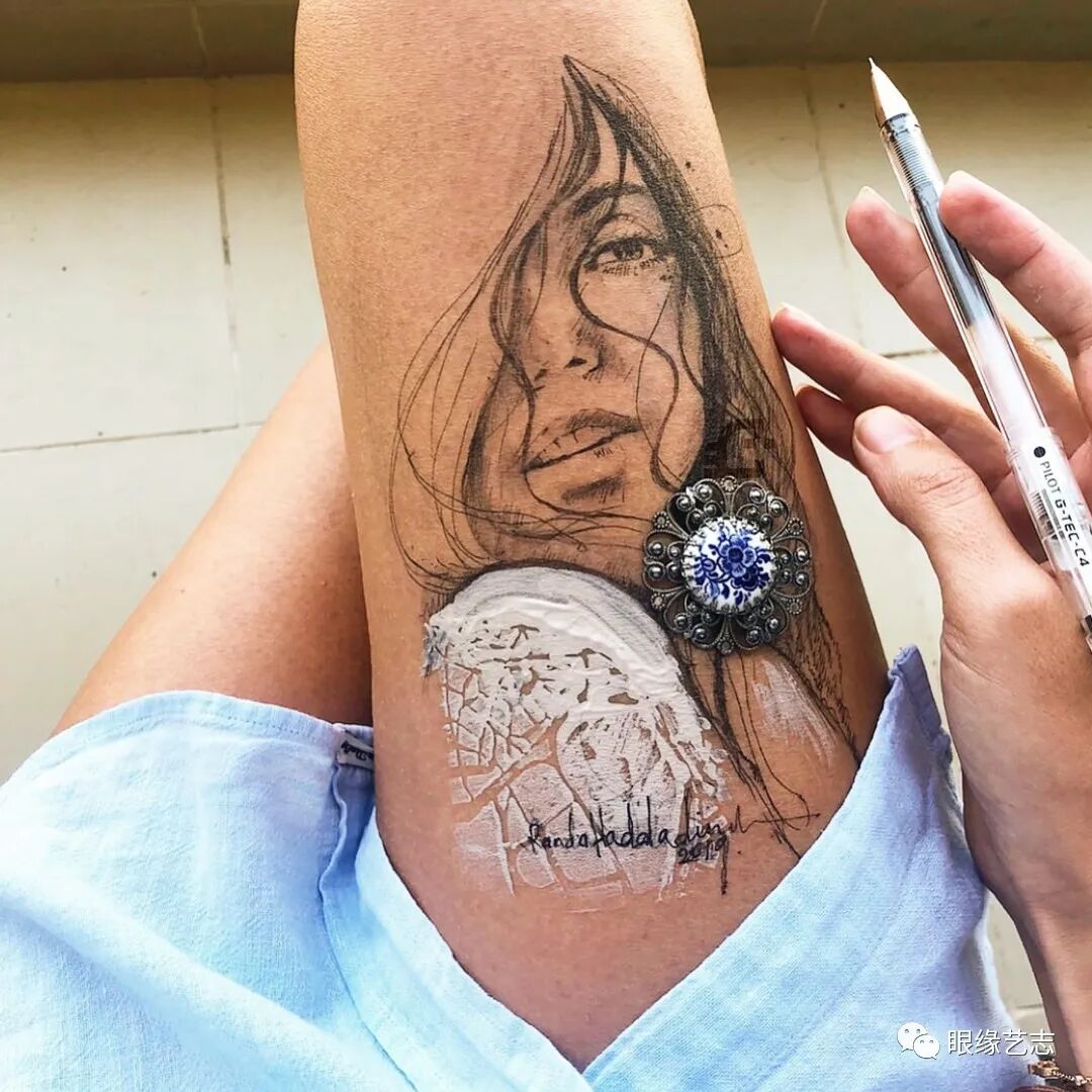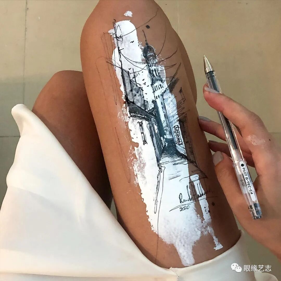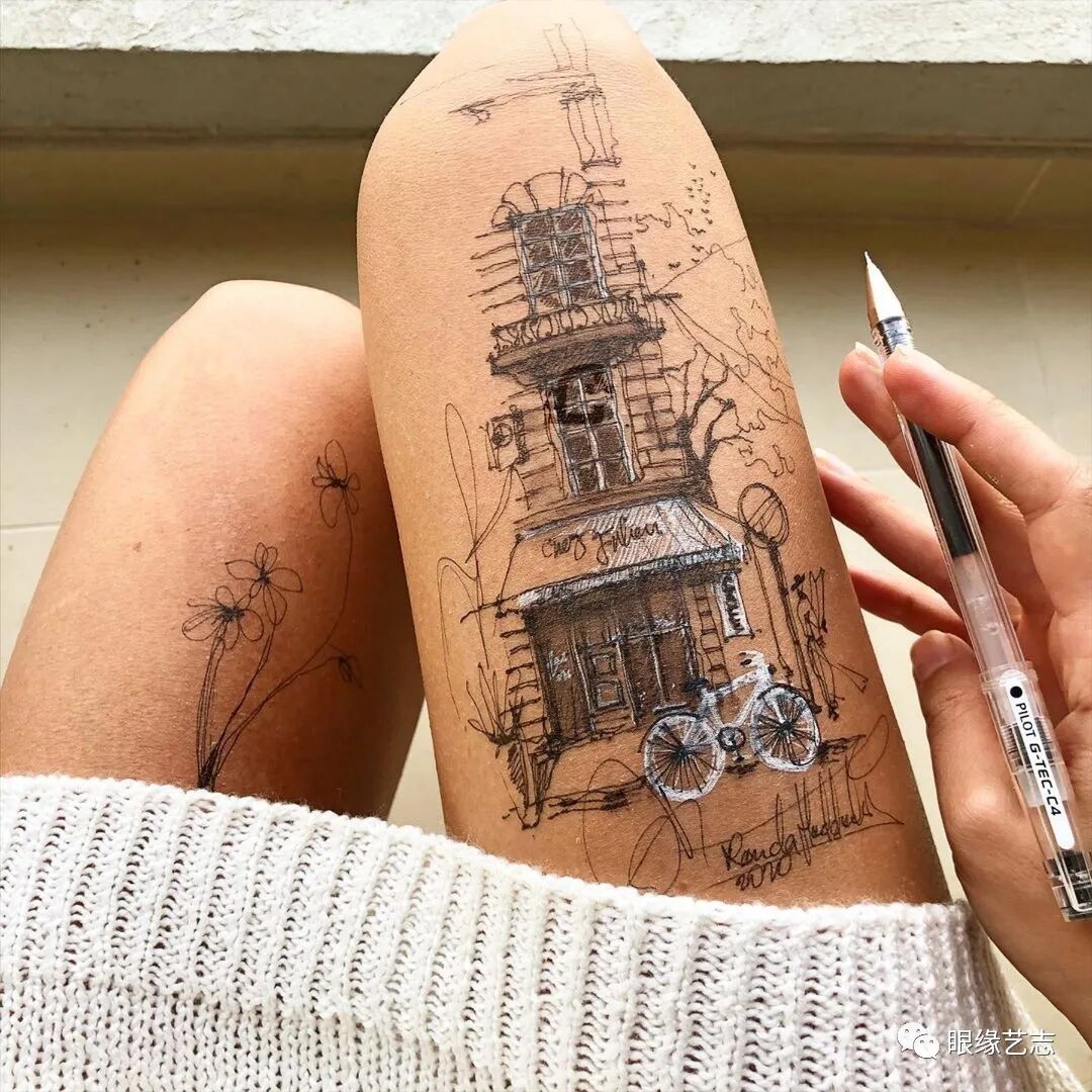 眼线笔、墨水笔、彩妆、对皮肤安全的丙烯酸颜料,这些就是兰达·哈达丁所有的创作工具。是的,她不需要画布。她的双腿把他带到了巴黎伦敦、海滩原野,如果想要画些什么,她只需坐下来,然后放平大腿……