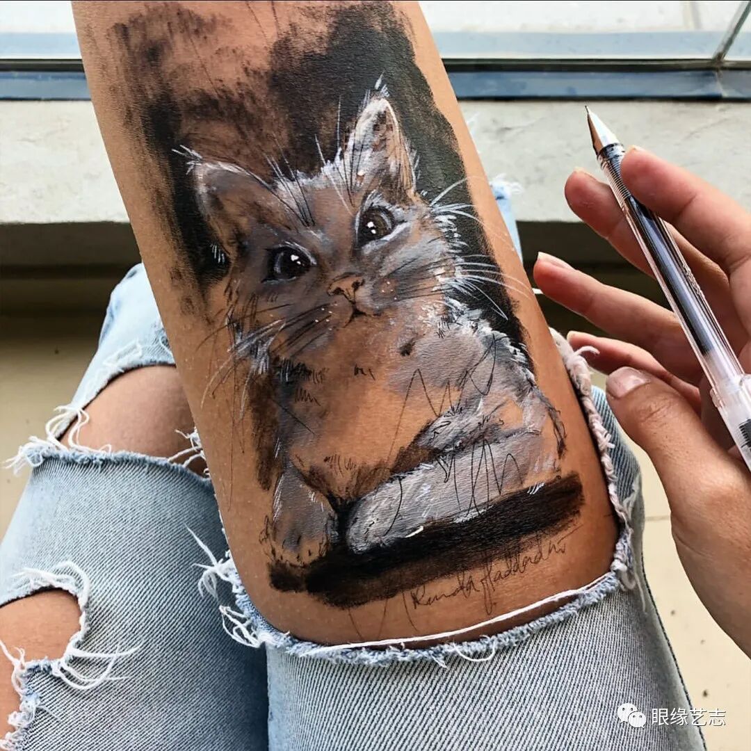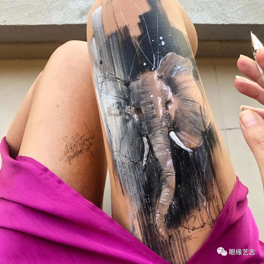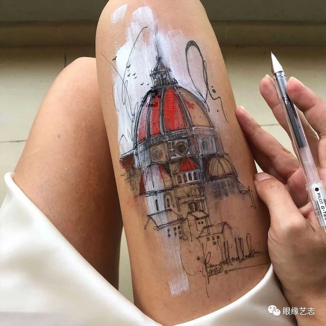 眼线笔、墨水笔、彩妆、对皮肤安全的丙烯酸颜料,这些就是兰达·哈达丁所有的创作工具。是的,她不需要画布。她的双腿把他带到了巴黎伦敦、海滩原野,如果想要画些什么,她只需坐下来,然后放平大腿……