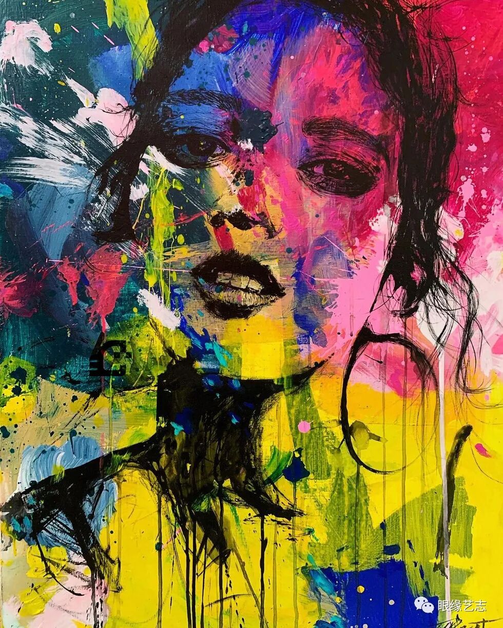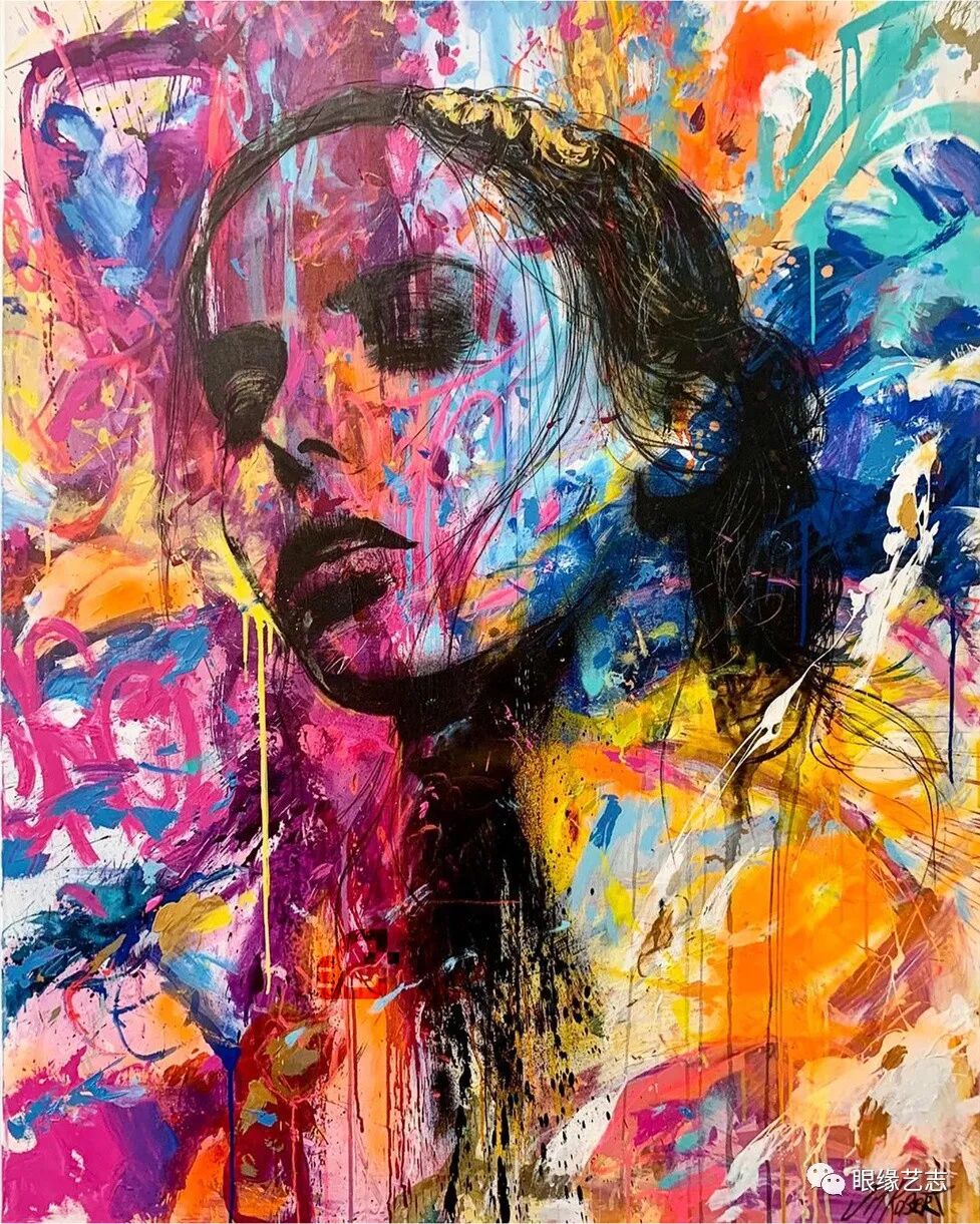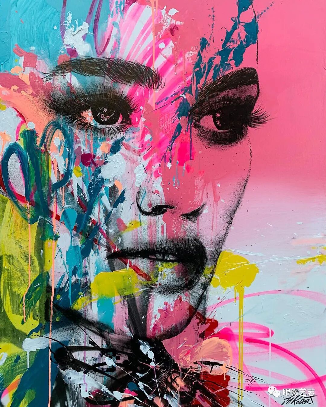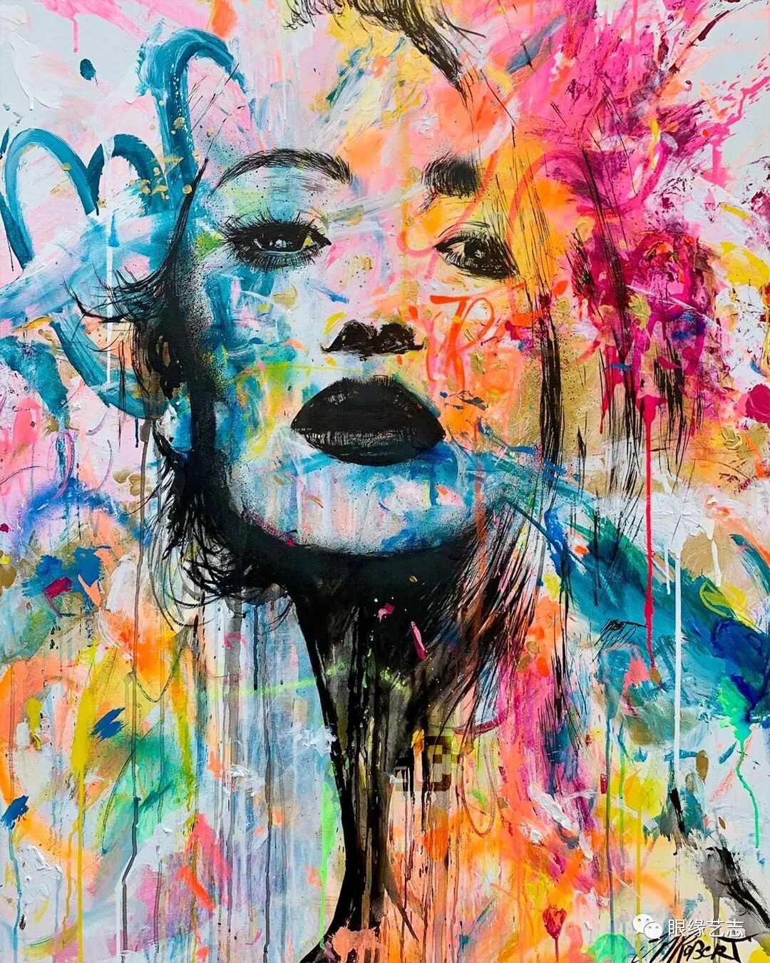 拥有鲜艳色彩的街头涂鸦将城市艺术的声音传遍了世界的墙壁,同时也穿透了罗伯特的内心。他开始借助各种材料与颜料、利用刮刀和泥铲模仿破损墙面的缝隙与痕迹,试图在画布上创造出摇摇欲坠的墙壁。这之后,他又将脑海中捕捉到的面孔叠加在堆满色彩的画布上,创造出具有强烈存在感与冲击力的肖像作品。