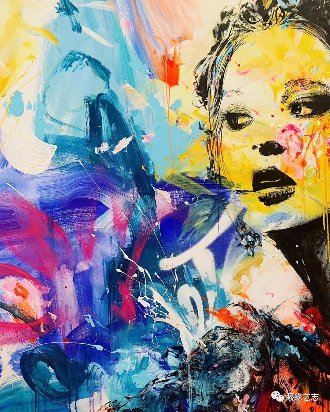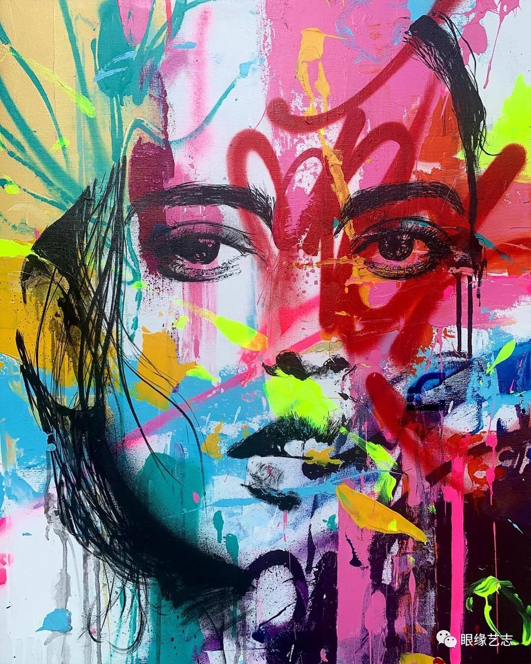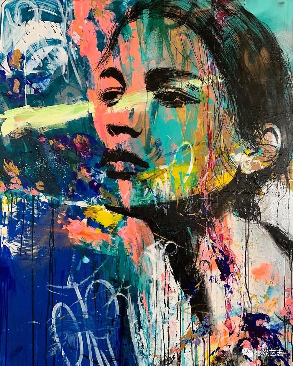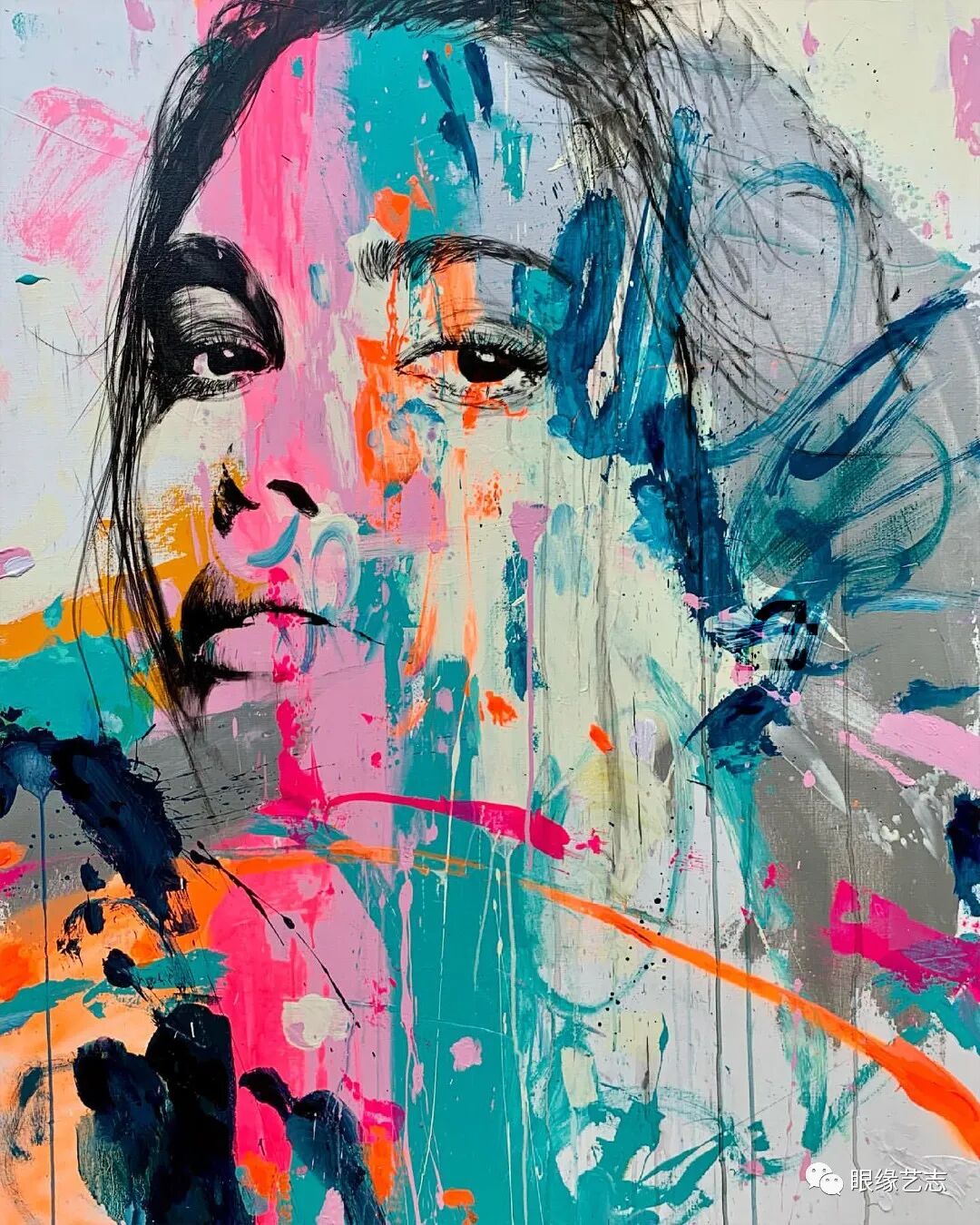 拥有鲜艳色彩的街头涂鸦将城市艺术的声音传遍了世界的墙壁,同时也穿透了罗伯特的内心。他开始借助各种材料与颜料、利用刮刀和泥铲模仿破损墙面的缝隙与痕迹,试图在画布上创造出摇摇欲坠的墙壁。这之后,他又将脑海中捕捉到的面孔叠加在堆满色彩的画布上,创造出具有强烈存在感与冲击力的肖像作品。