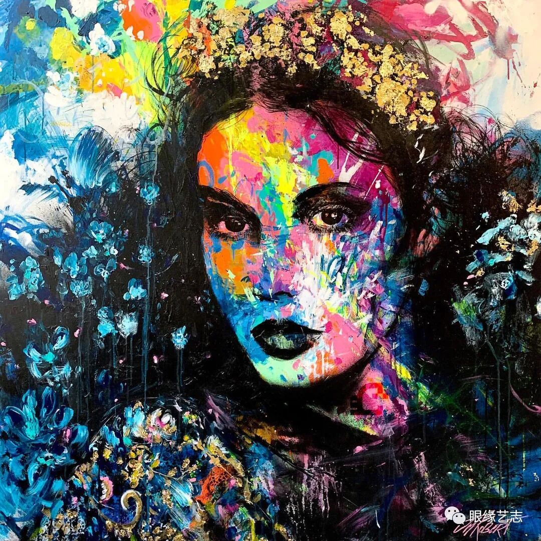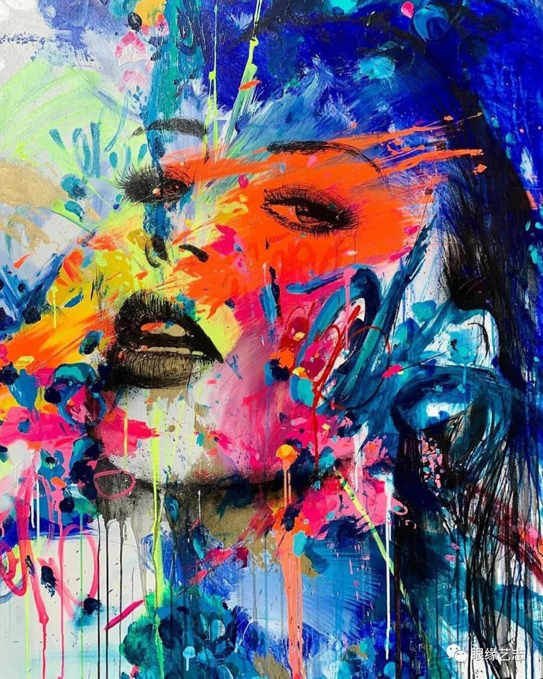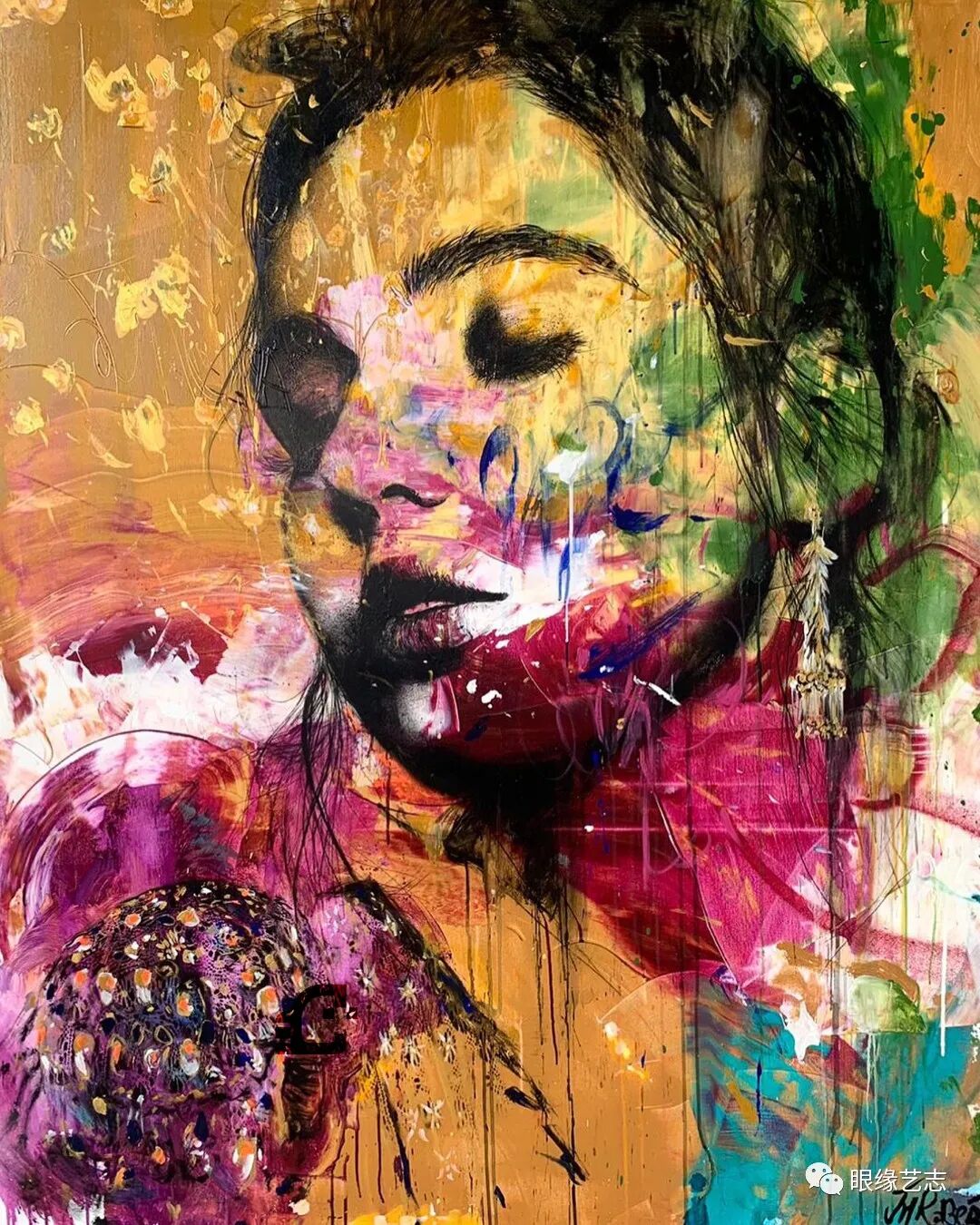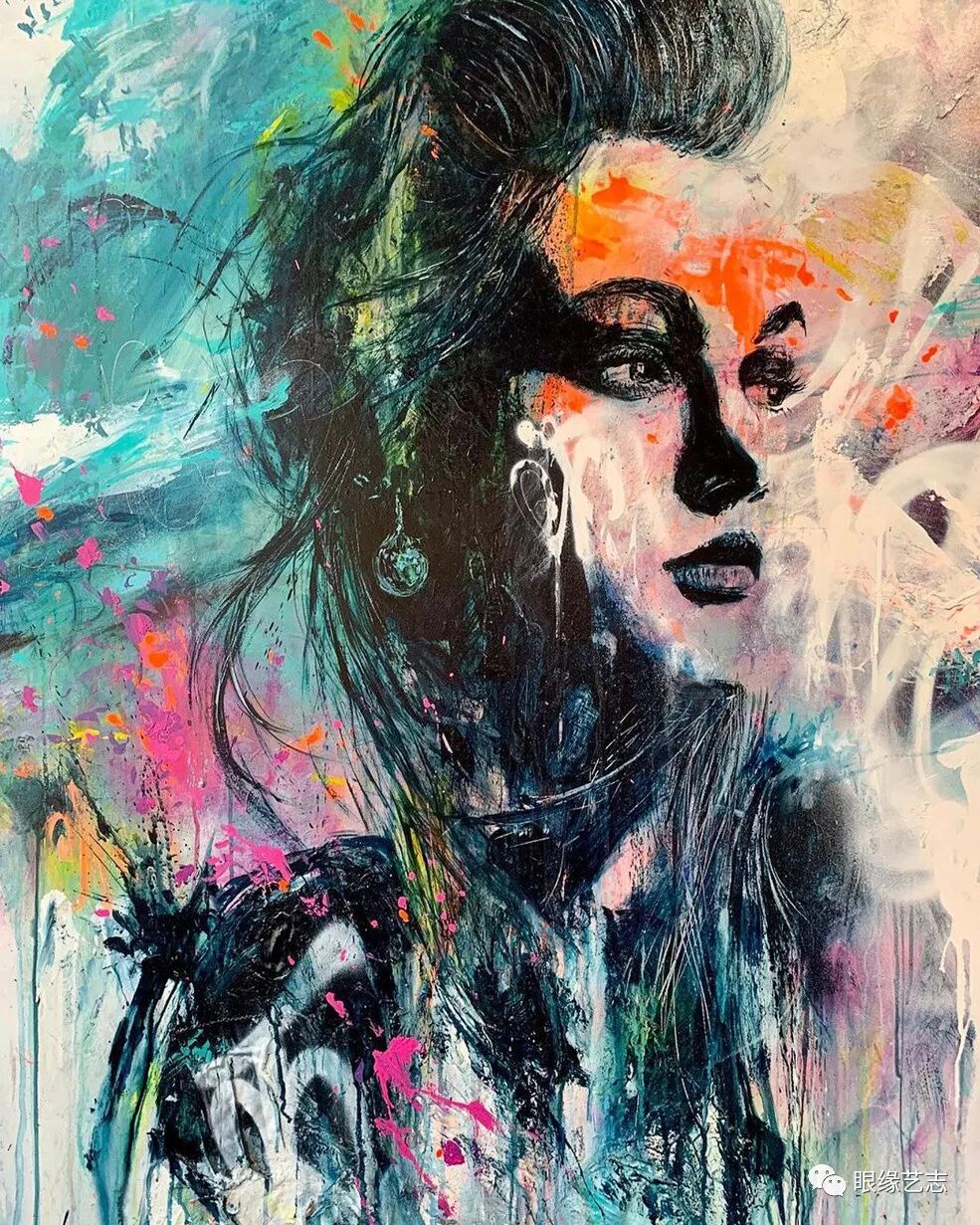 拥有鲜艳色彩的街头涂鸦将城市艺术的声音传遍了世界的墙壁,同时也穿透了罗伯特的内心。他开始借助各种材料与颜料、利用刮刀和泥铲模仿破损墙面的缝隙与痕迹,试图在画布上创造出摇摇欲坠的墙壁。这之后,他又将脑海中捕捉到的面孔叠加在堆满色彩的画布上,创造出具有强烈存在感与冲击力的肖像作品。