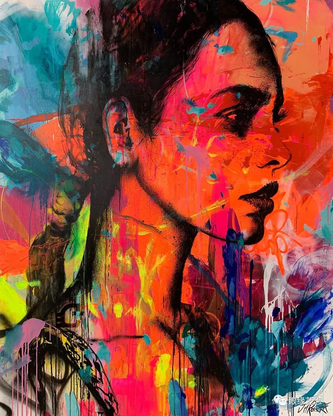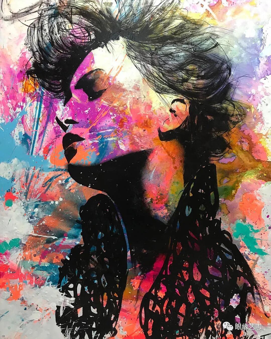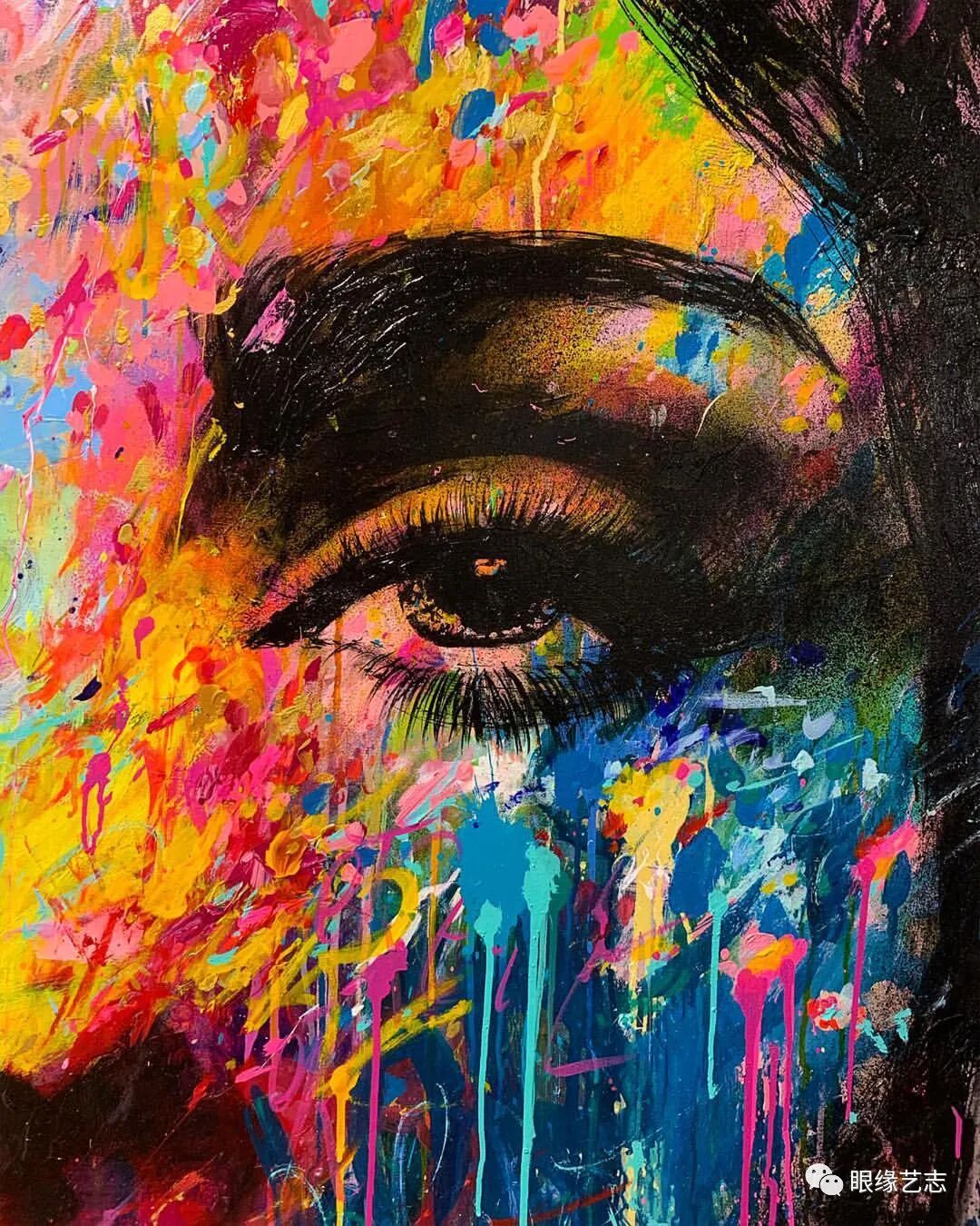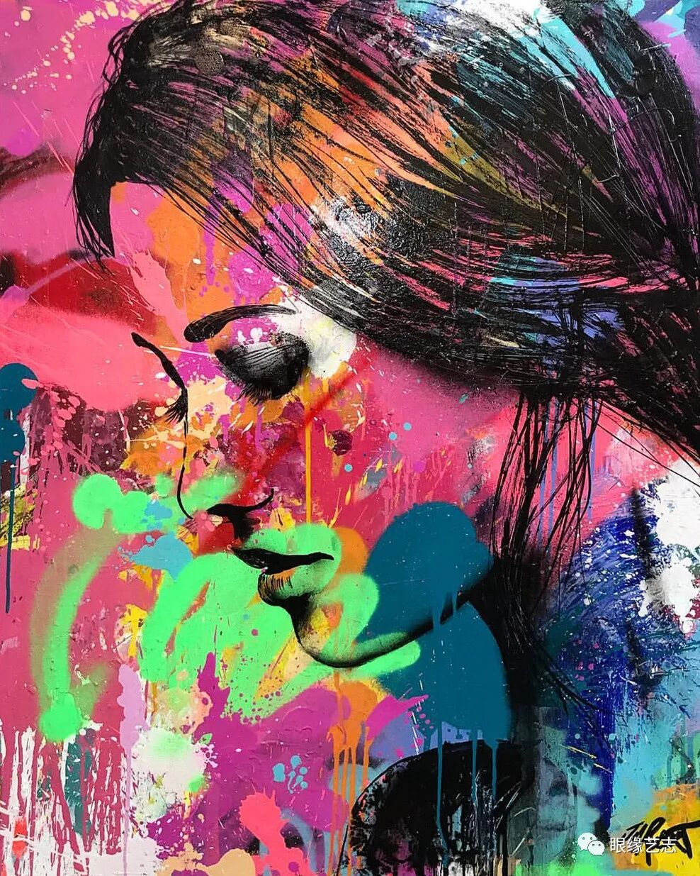 拥有鲜艳色彩的街头涂鸦将城市艺术的声音传遍了世界的墙壁,同时也穿透了罗伯特的内心。他开始借助各种材料与颜料、利用刮刀和泥铲模仿破损墙面的缝隙与痕迹,试图在画布上创造出摇摇欲坠的墙壁。这之后,他又将脑海中捕捉到的面孔叠加在堆满色彩的画布上,创造出具有强烈存在感与冲击力的肖像作品。