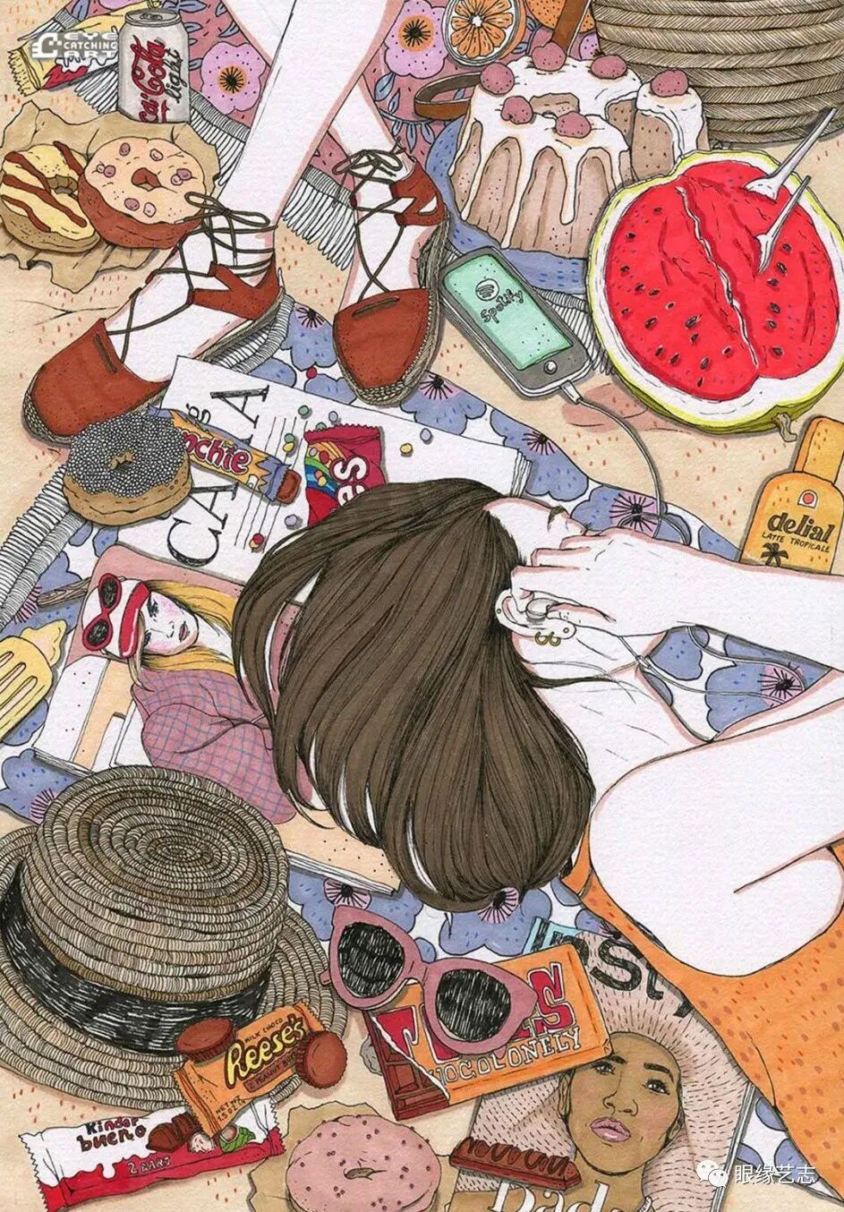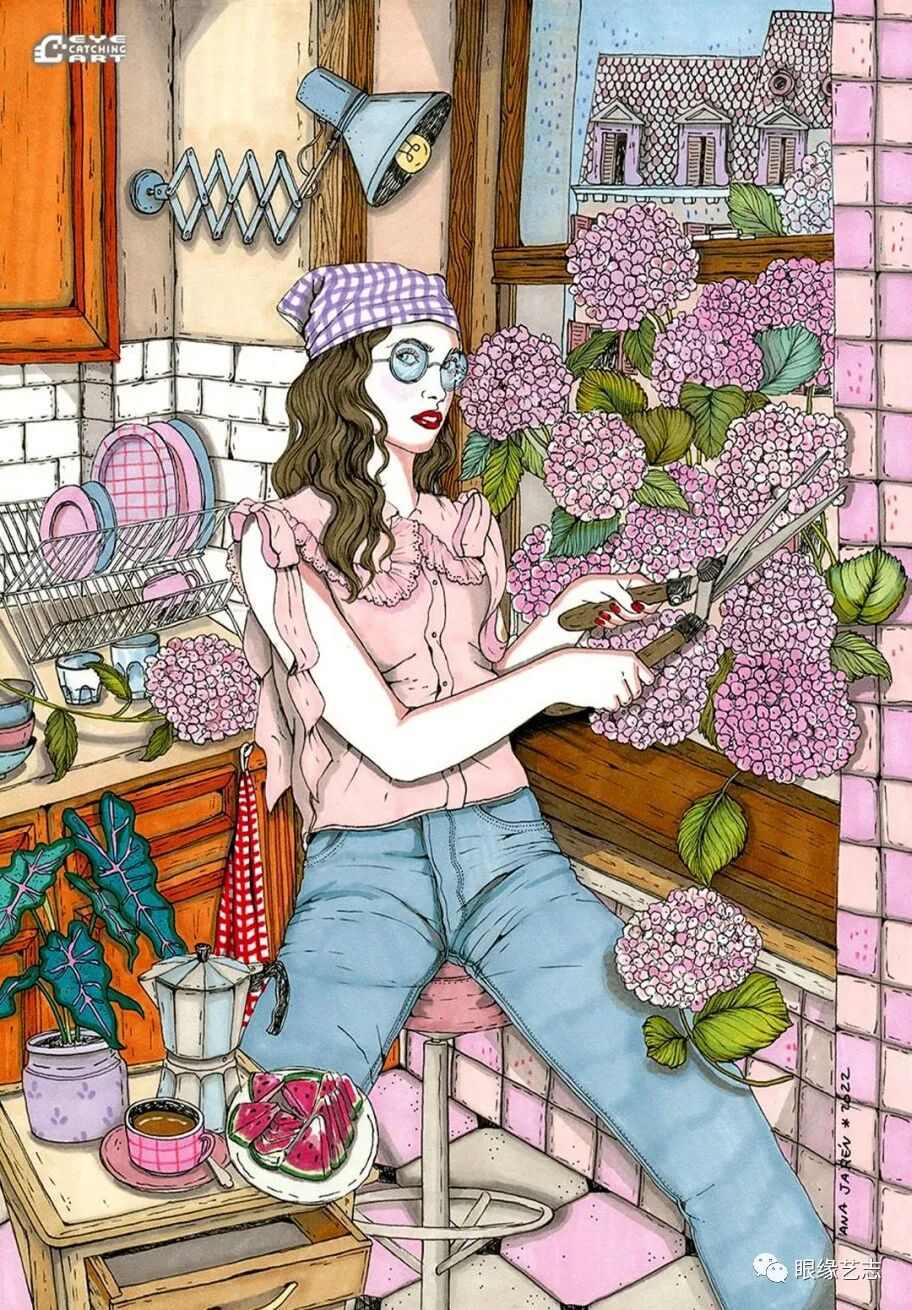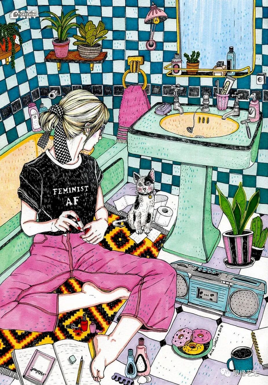 不过,我最喜欢的创作仍是我的女性主题插画的第一幅作品——《孤独》。在一个充满色彩和细节的场景中,很多人都曾是那个看似拥有一切却感到空虚和不快乐的女孩。通过这幅画,我开始探索在室内空间中表现女性主题的方法,同时,这幅画这也是我在笔触、色彩、构图、视角等方面开发后续作品的一个开端。