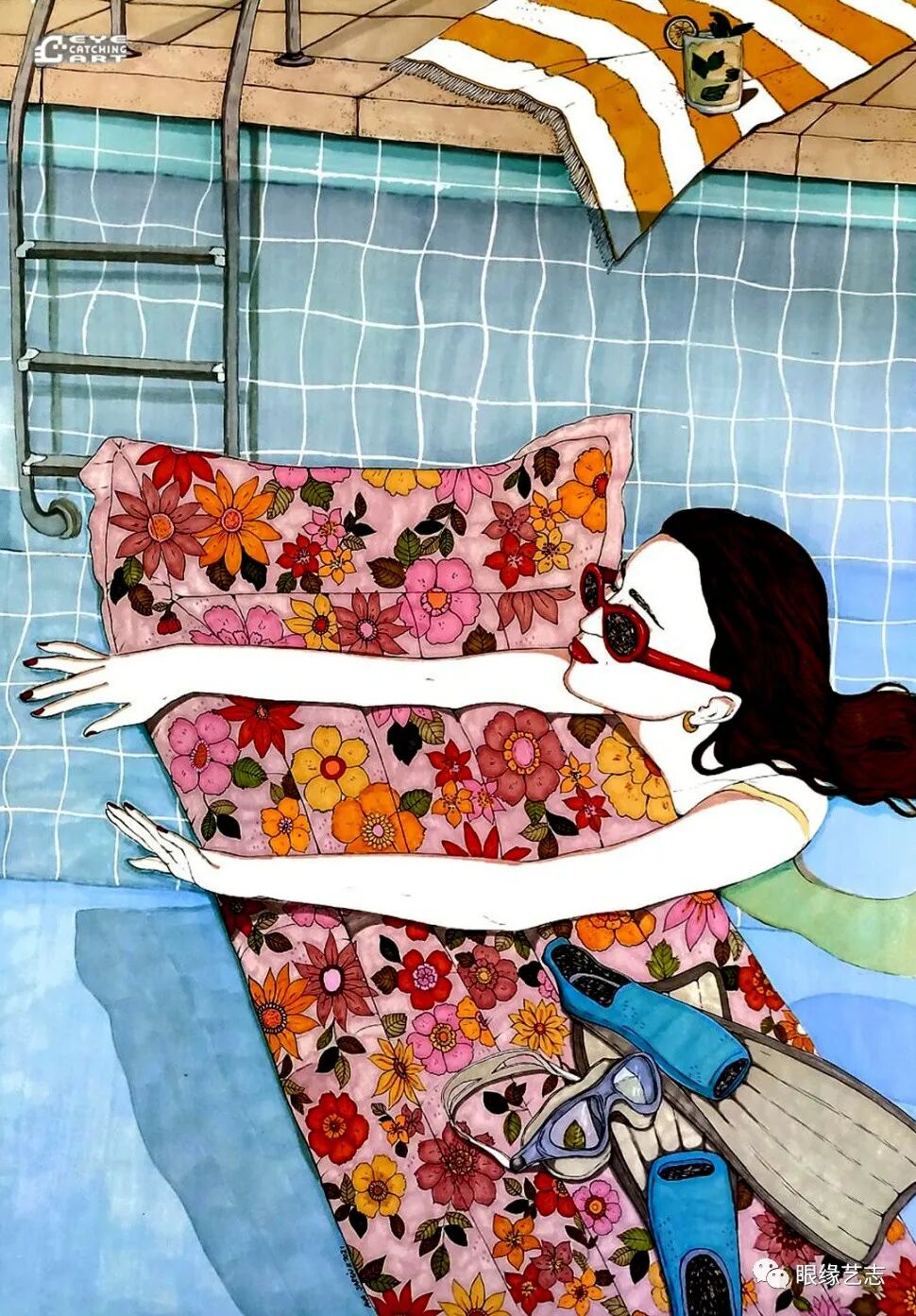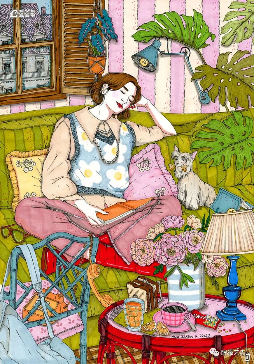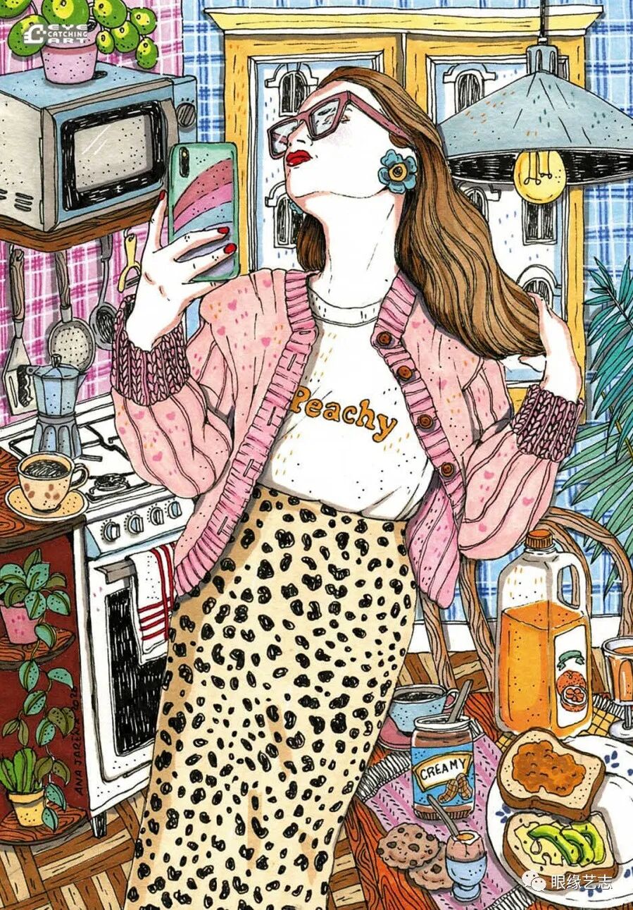 安娜·贾伦:我的作品往往聚焦于生活中的小点滴,尤其是那些可能会被我们忽视但却非常美好的时刻。在这些生活掠影中,我会更加关注场景和细节。在我的作品中,你总会看到一个或者几个女性角色身处各种室内空间里,且在这个有限的空间里,充斥着各类与时尚及流行文化相关的元素。