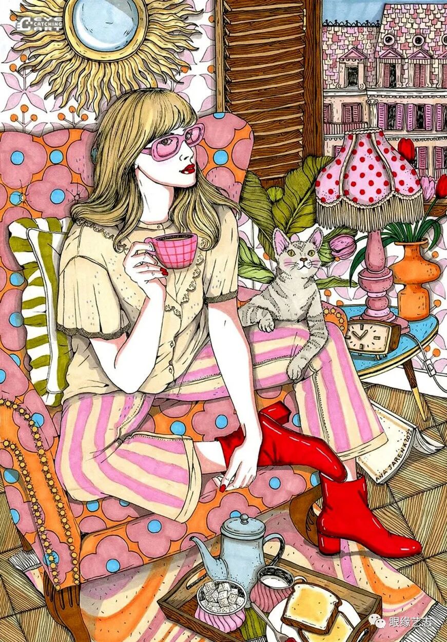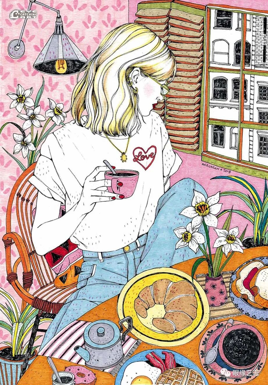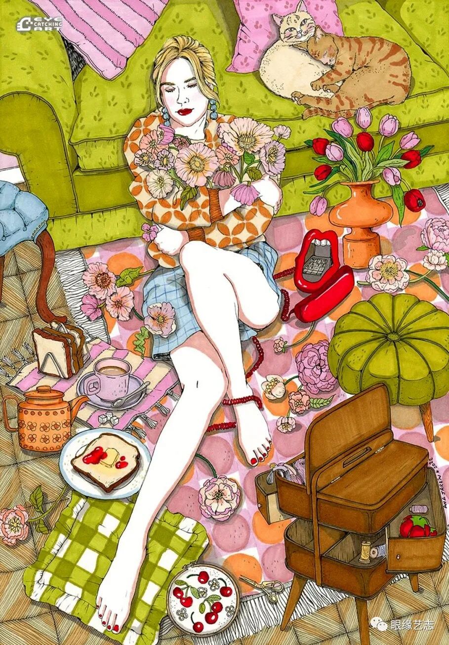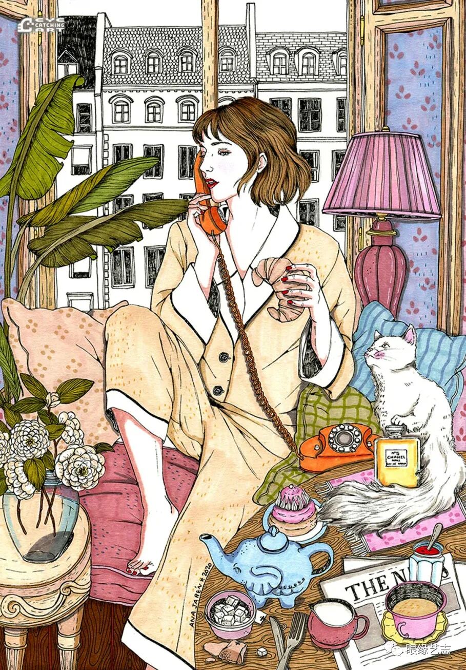 杂志、花朵、宠物、咖啡,一个女孩消费着她的多彩与寂寞——这样的生活可以绚烂,也可以泛滥,然而无论如何,我都要把更多的色彩带入到这些插画中,因为它们代表了日常生活中那些美丽而孤独的时刻。