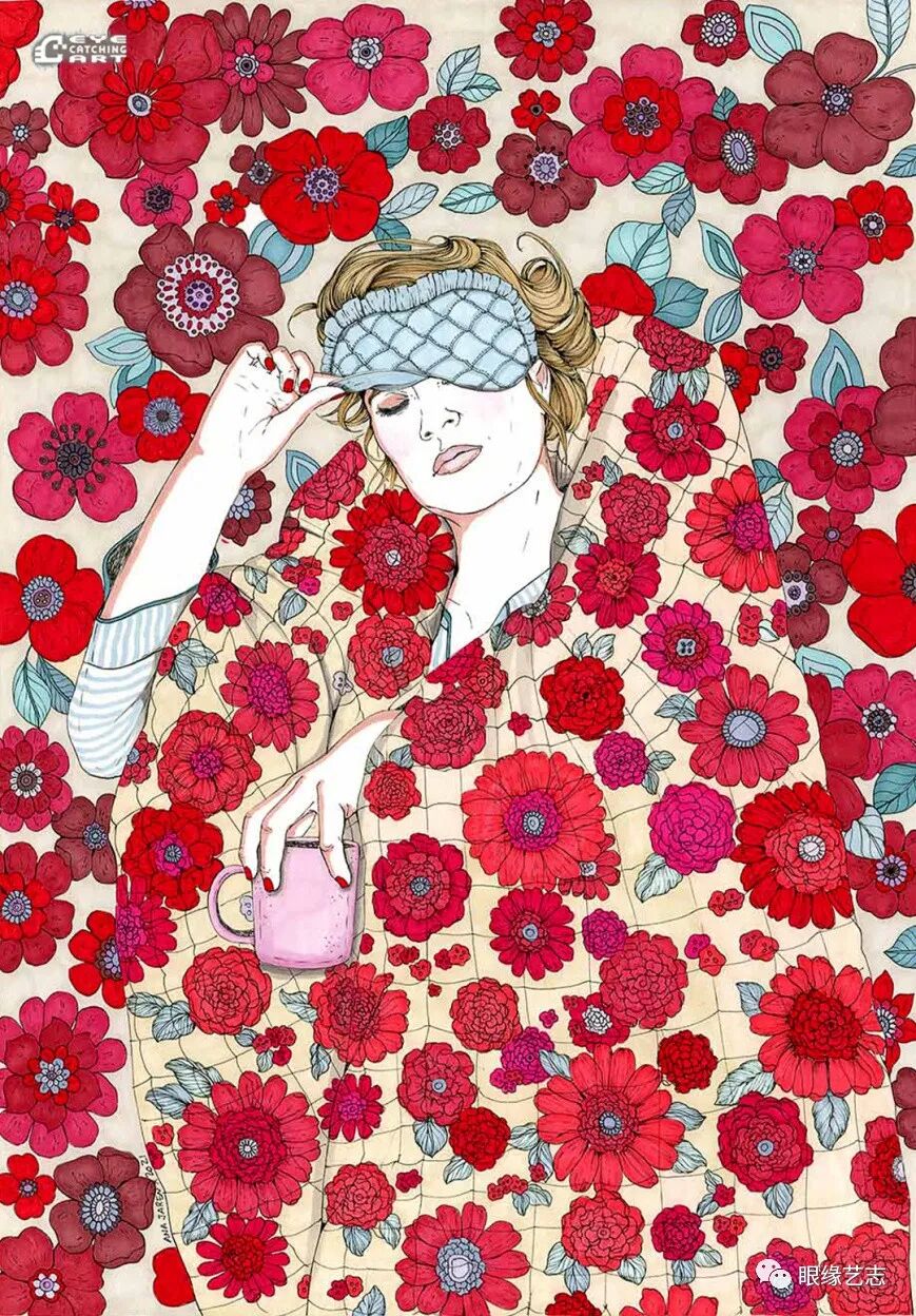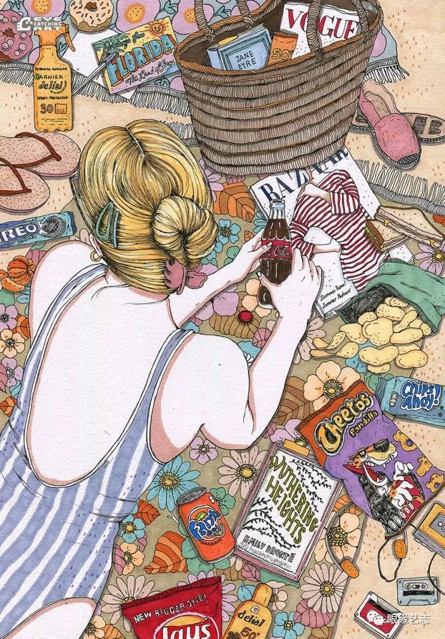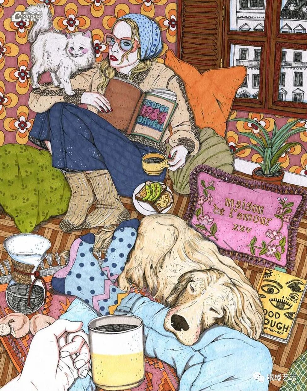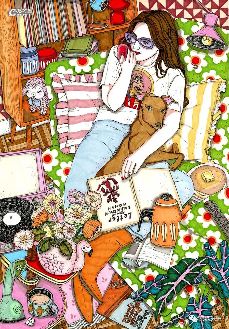 杂志、花朵、宠物、咖啡,一个女孩消费着她的多彩与寂寞——这样的生活可以绚烂,也可以泛滥,然而无论如何,我都要把更多的色彩带入到这些插画中,因为它们代表了日常生活中那些美丽而孤独的时刻。