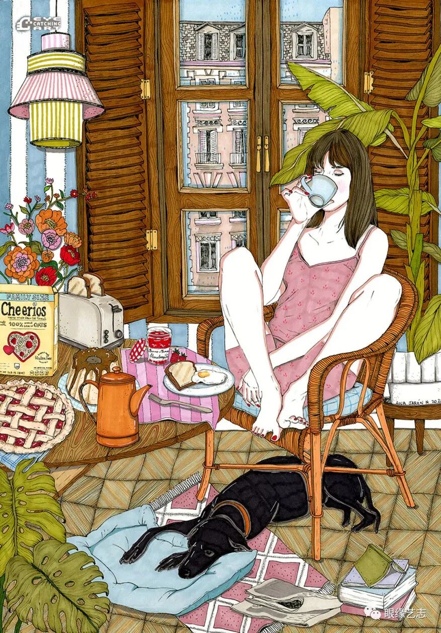安娜·贾伦:我希望人们可以在我的插画中认出自己,比如唤醒他们与心爱的人一起生活的旧时记忆,或者自己曾经百无聊赖的独身经历。我相信,这些插画所呈现的片段只是一个引子,故事会在观者的脑海中自行成长。我从不认为艺术作品是一个完全封闭的、强加给观者的一块视觉感知。相反,只要观者认可这个故事,那么他就会用自己的亲身经历来完成它。
