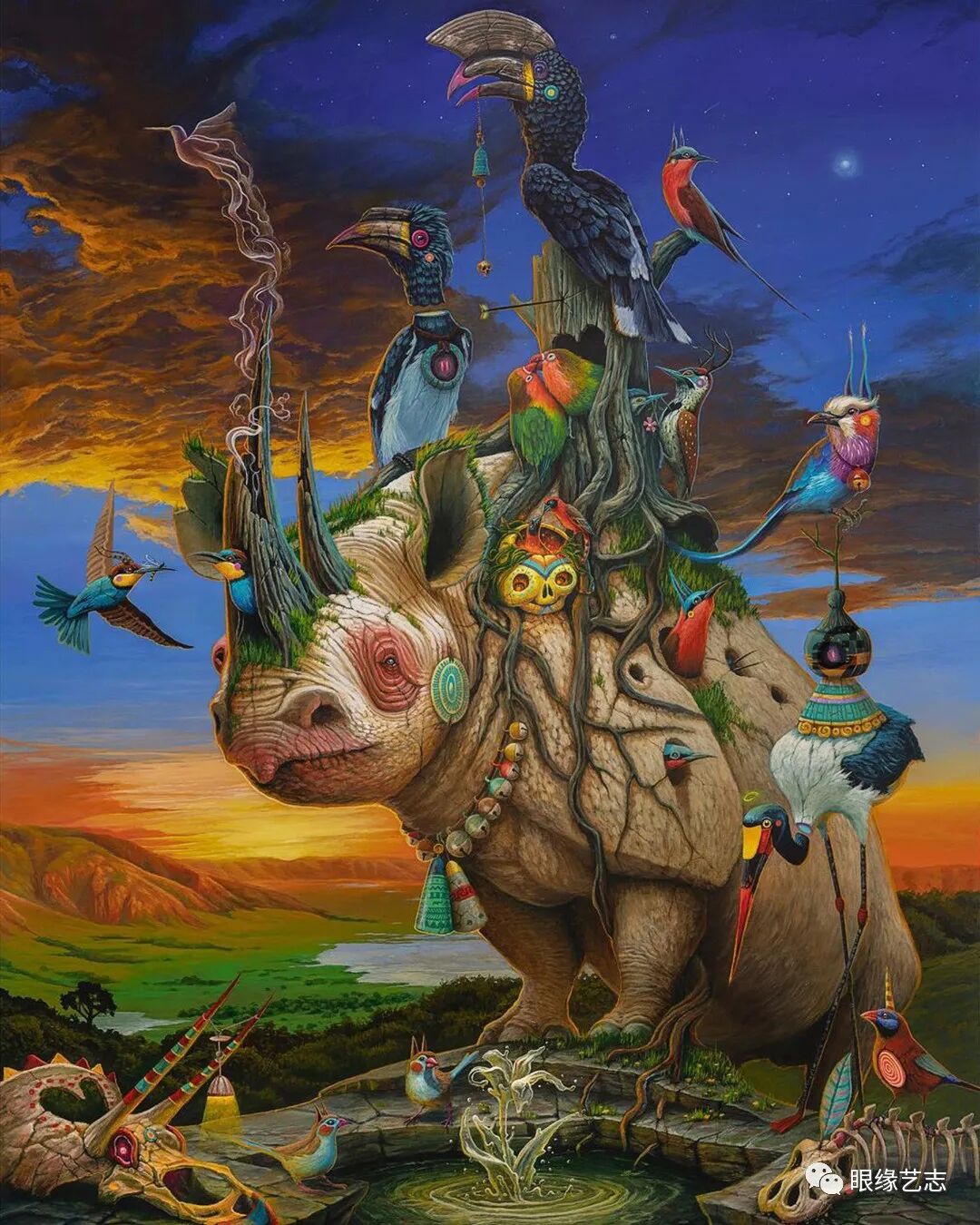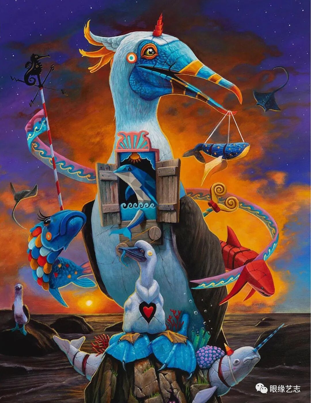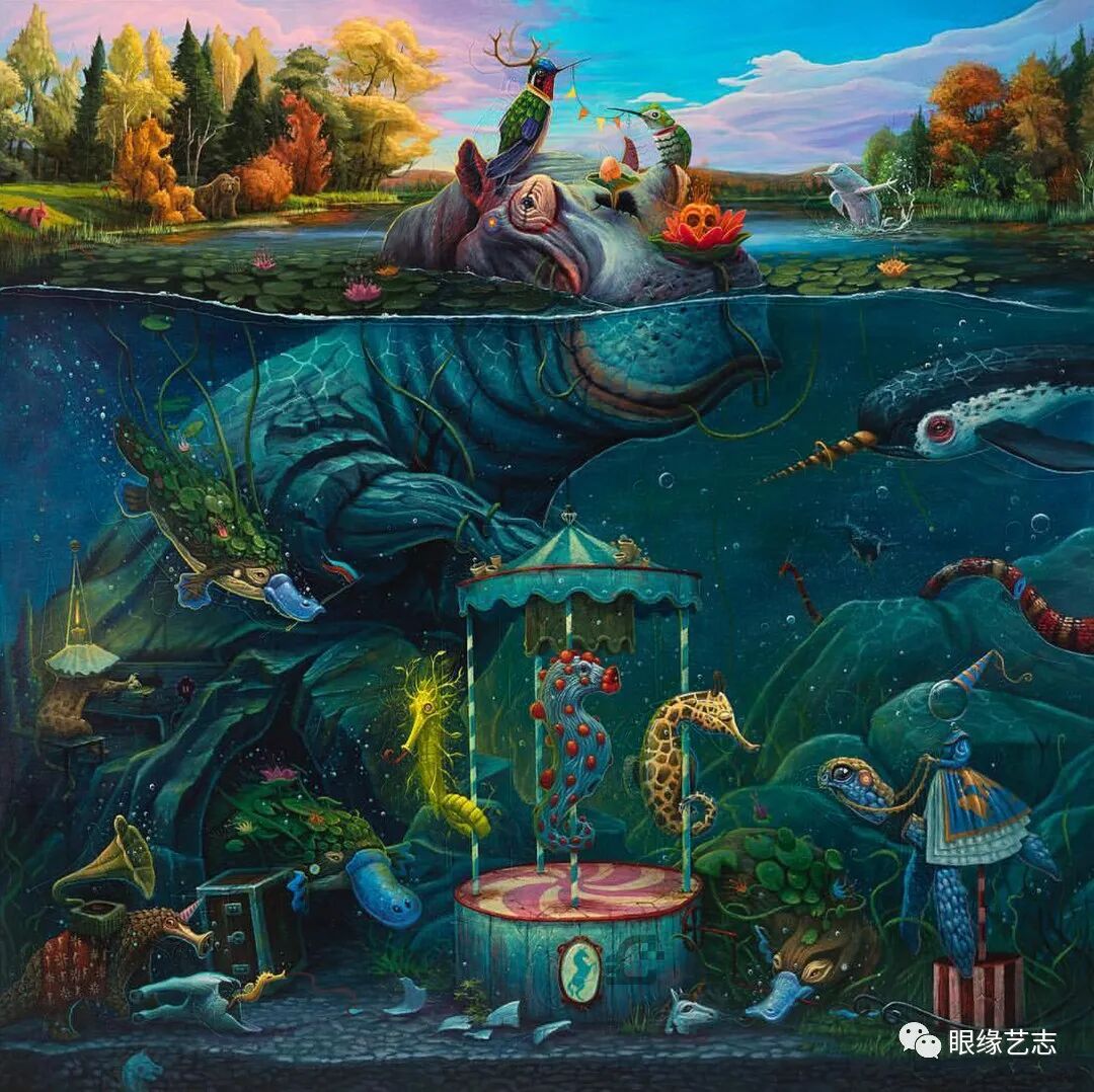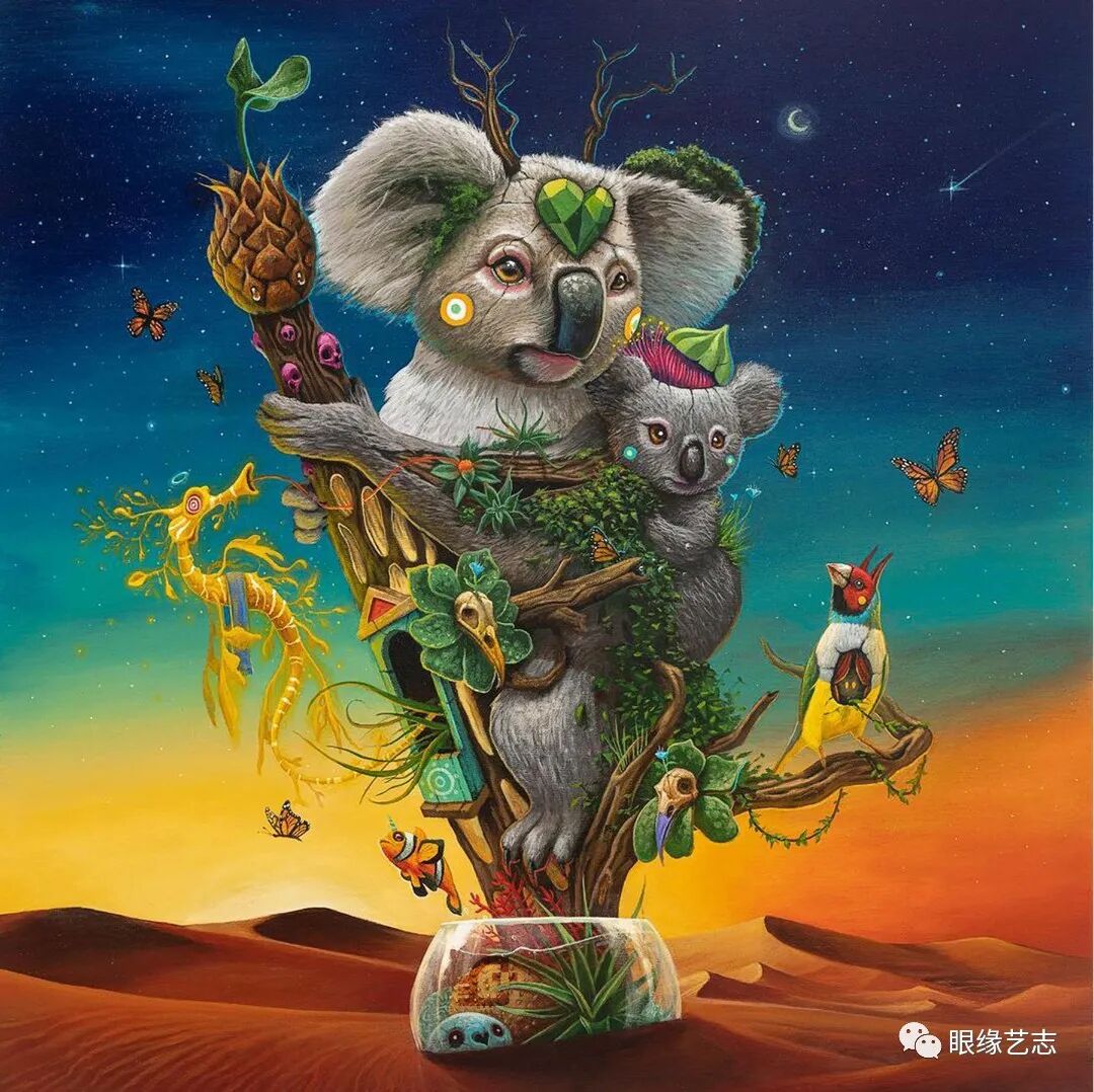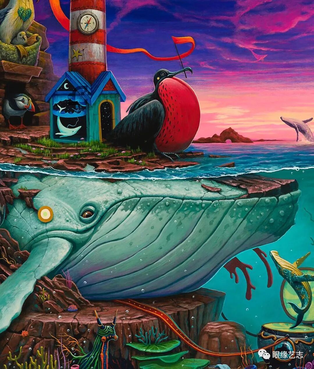 以孩子般天真烂漫的视角去描述世界,再以极富活力的色彩谱写一篇篇生命的悲喜剧——表象上,他的视野是一幅满含幻想细节的超现实主义生态景观画作,而在幻想的背后,真相却可能没有那么的轻快与欢愉……