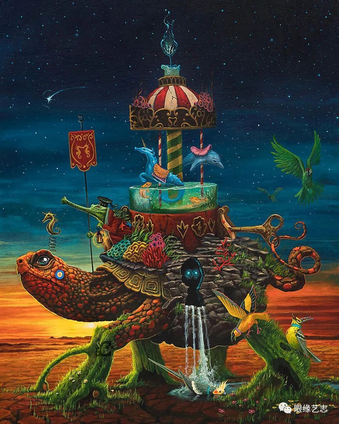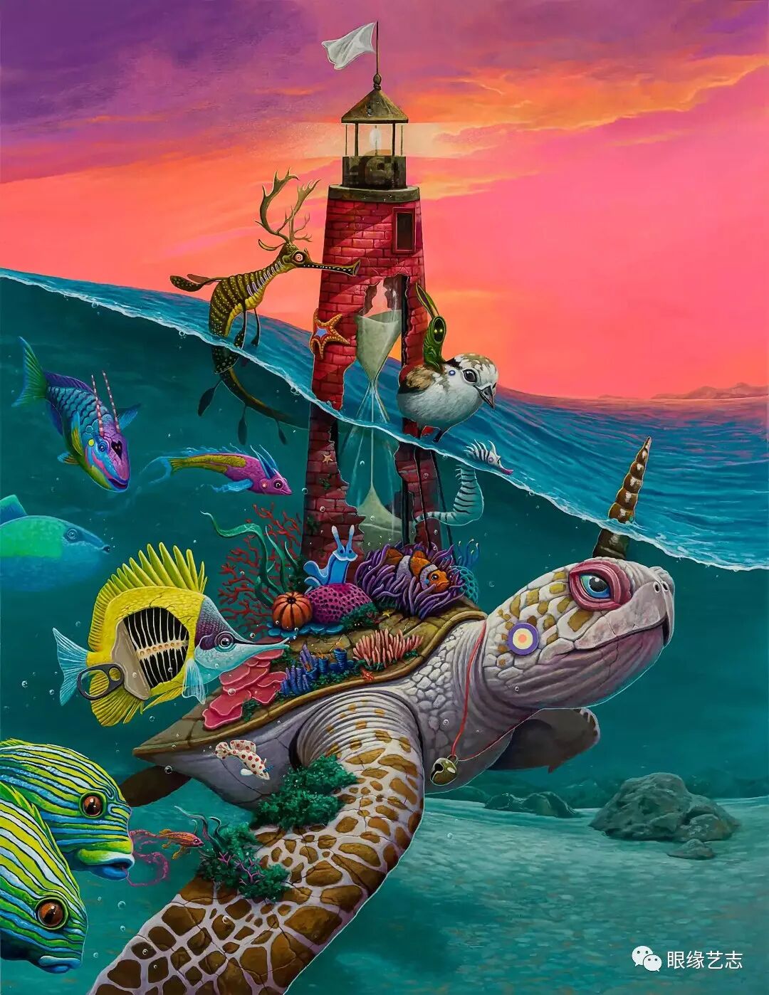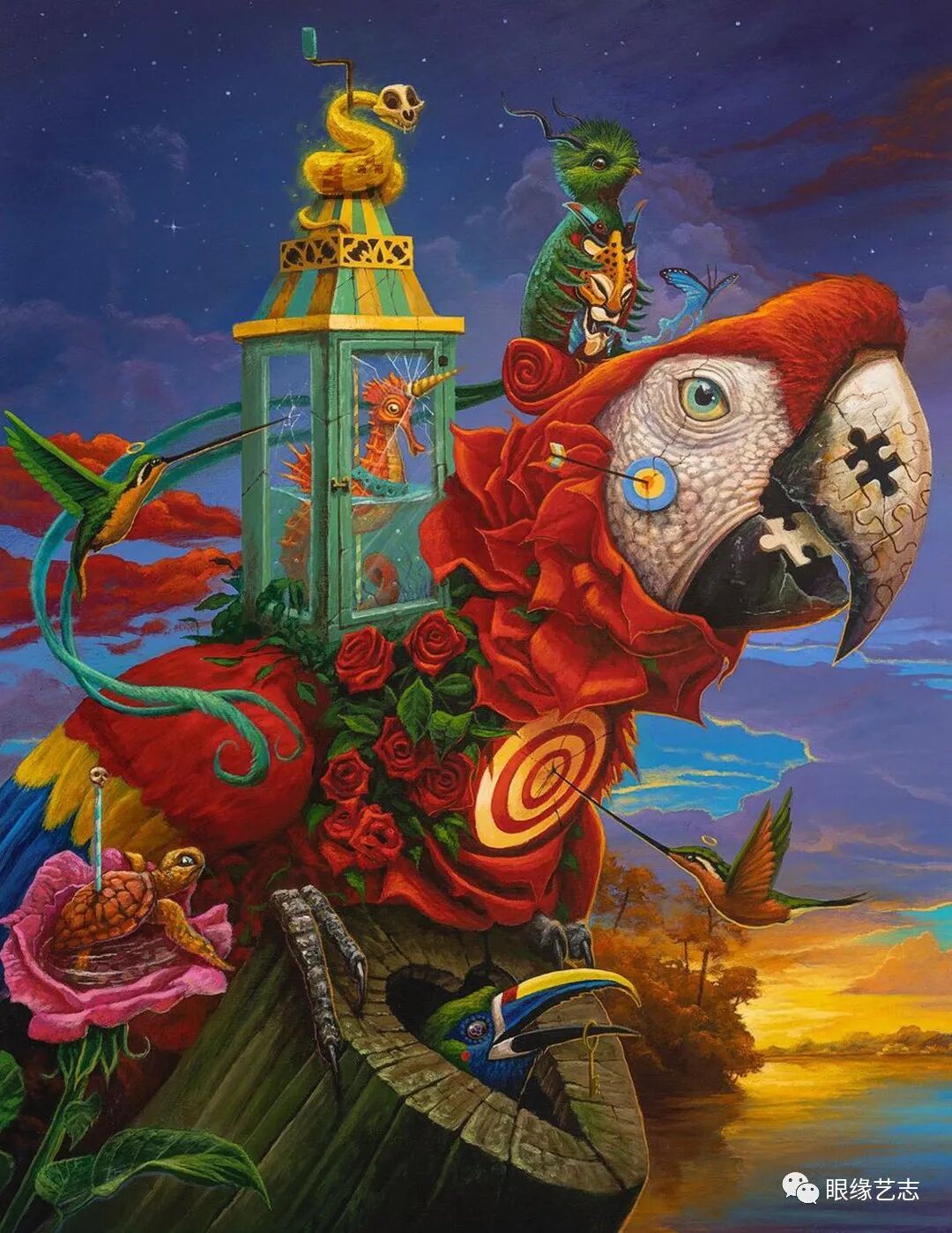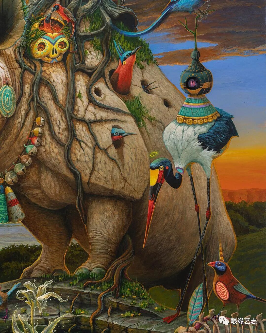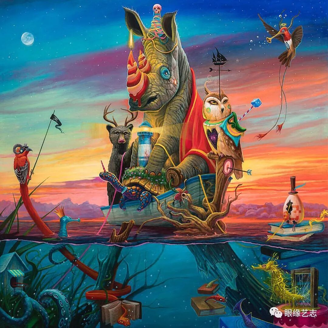 以孩子般天真烂漫的视角去描述世界,再以极富活力的色彩谱写一篇篇生命的悲喜剧——表象上,他的视野是一幅满含幻想细节的超现实主义生态景观画作,而在幻想的背后,真相却可能没有那么的轻快与欢愉……