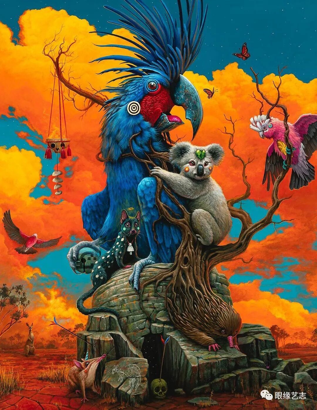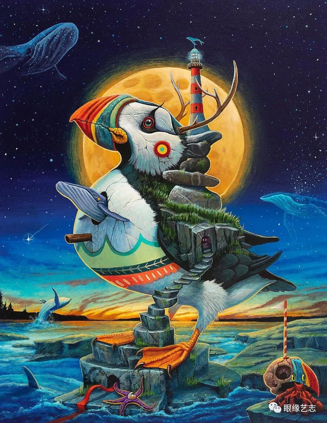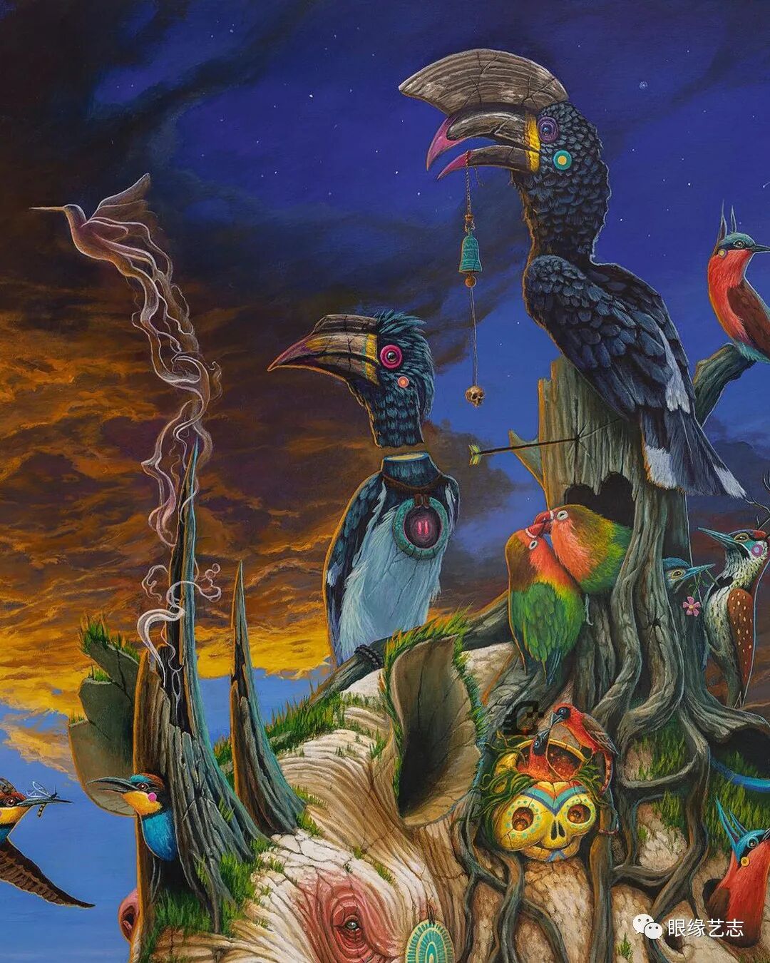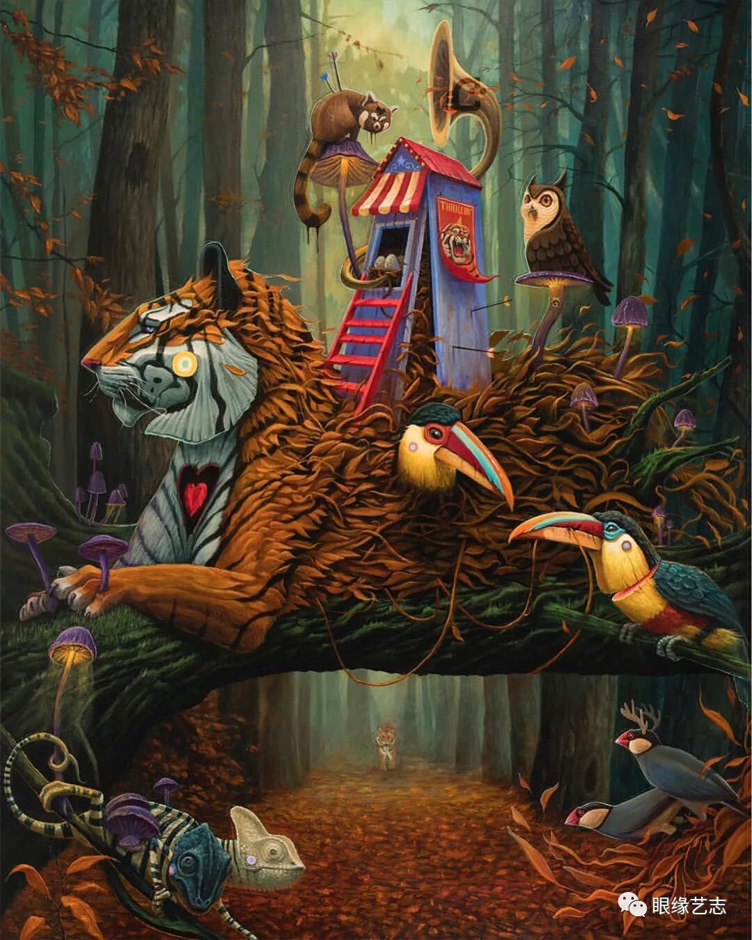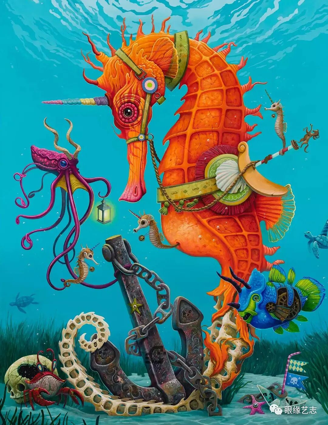 以孩子般天真烂漫的视角去描述世界,再以极富活力的色彩谱写一篇篇生命的悲喜剧——表象上,他的视野是一幅满含幻想细节的超现实主义生态景观画作,而在幻想的背后,真相却可能没有那么的轻快与欢愉……