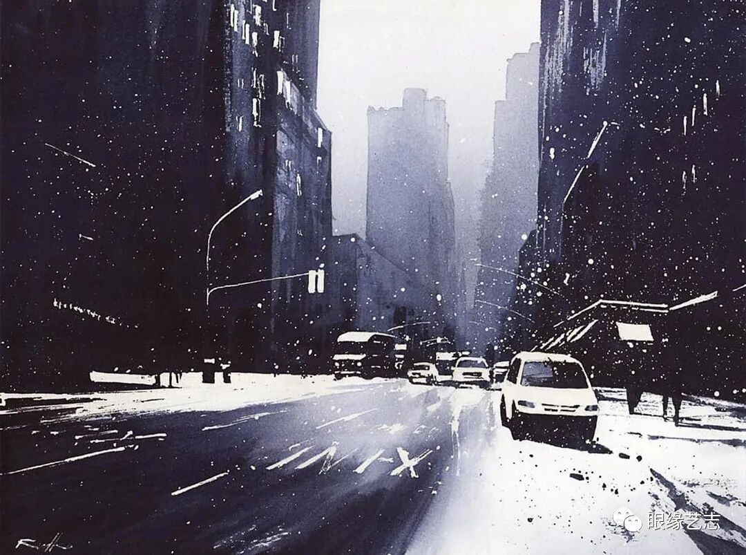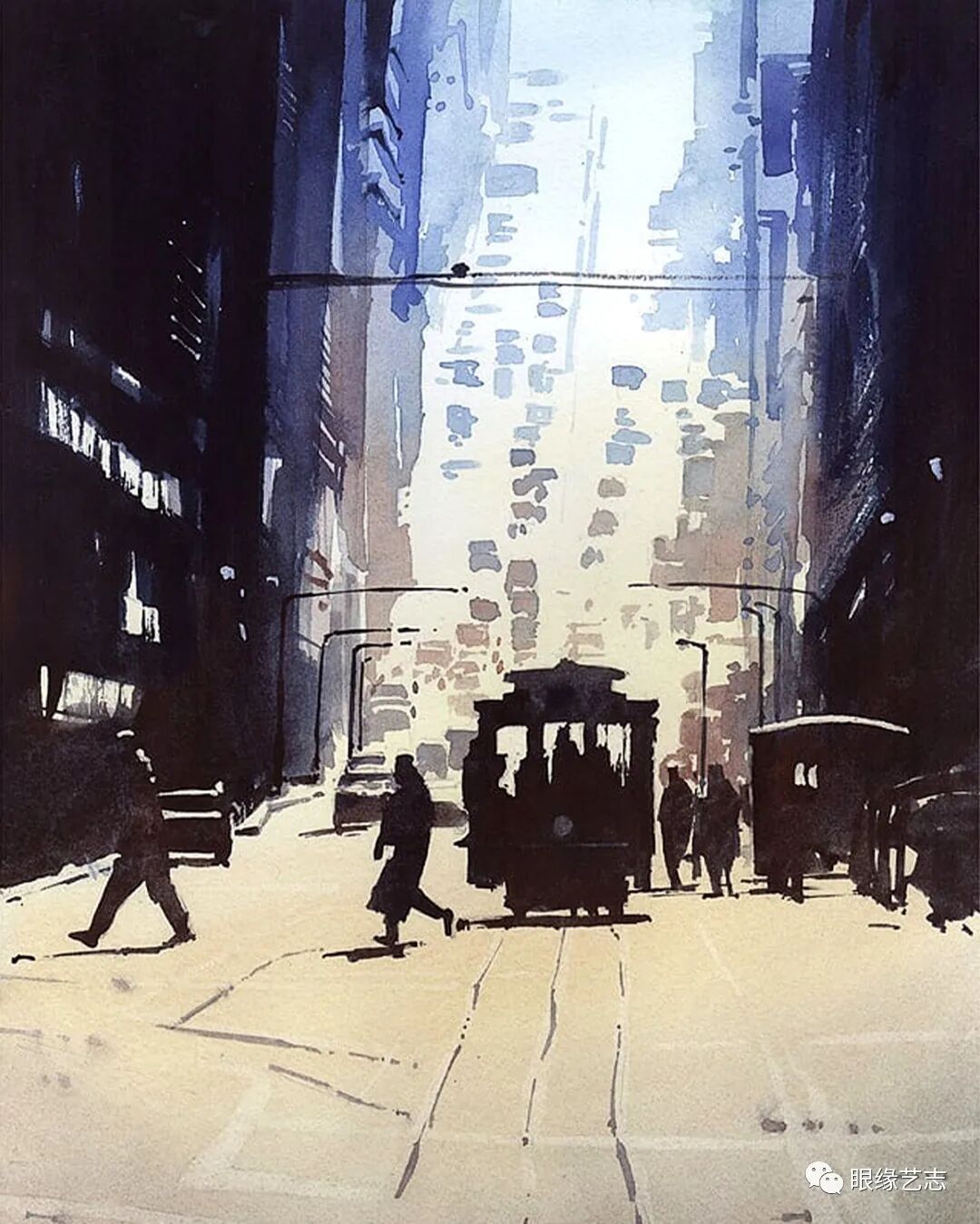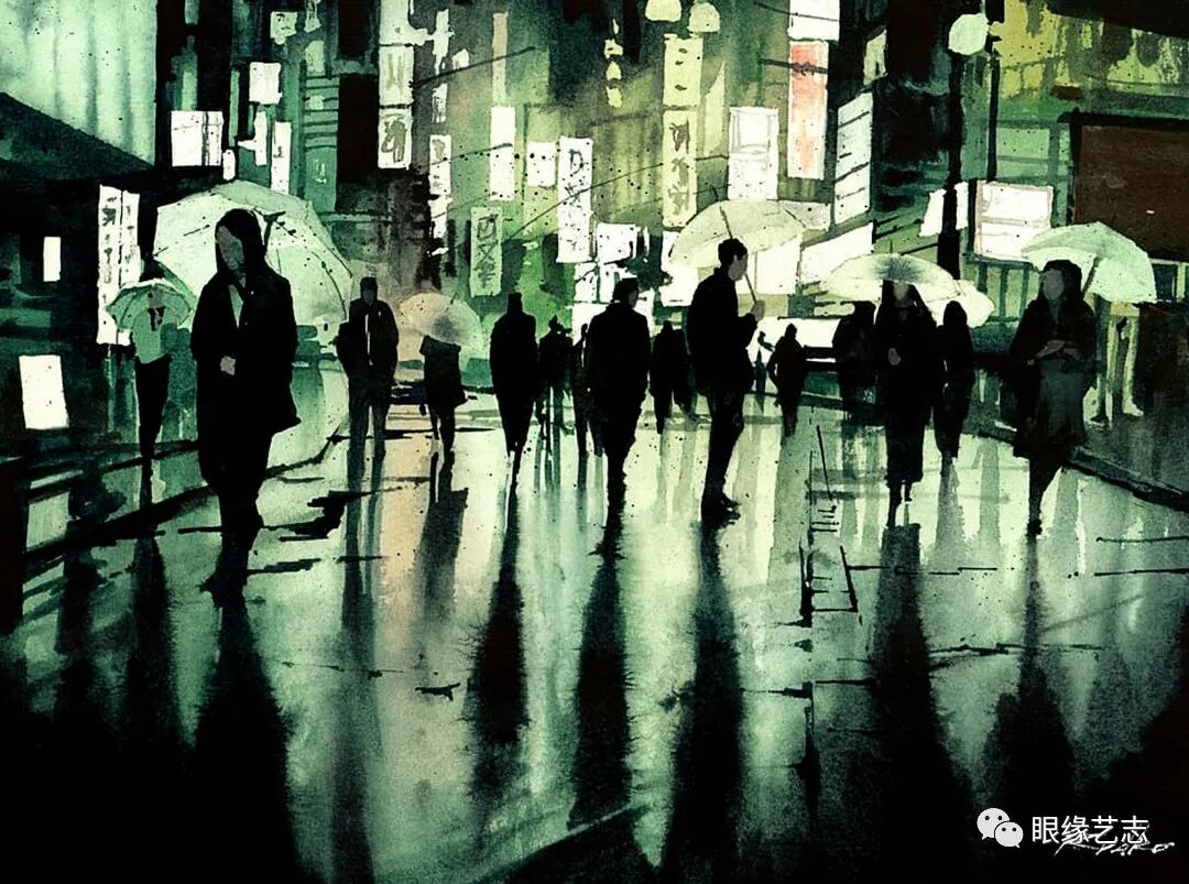 候鸟被城市的光所吸引,却总是飞不出参差的人造丛林。同样迷失方向的,还有那些被欲望驱使的人群。他们与光同行,在日夜的往复、时光的奔流中成为了简单的线条与色块,成为了这座城市必不可少却又可有可无的一个点。没有谁会承认谁的跌宕起伏,没有谁会在意谁的行色匆匆,直到他们被画家的水彩染于画中。