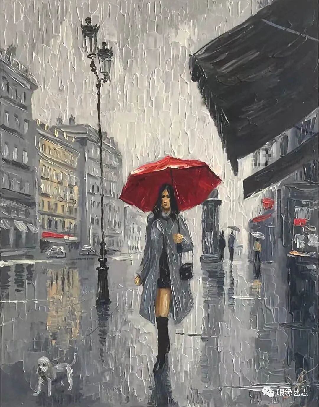 将下落的雨水视为天上的眼泪——每当黄昏时分,亚历山大便会拿起画笔将雨中城市的剪影收于画布之上。黑白灰的底色缓慢而浓烈地渲染着潮湿的氛围,灰蒙的天空、团簇的行道树、铺洒在地面上的反光与影影倬倬的倒影,共同烘托着雨中之城特有的幽静与清冷。而那些穿透雨雾的点点淡黄暖光和行人的红色雨伞,似是灰寂视界里窜动的精灵,雀跃着想要留下目视之人的所有记忆。