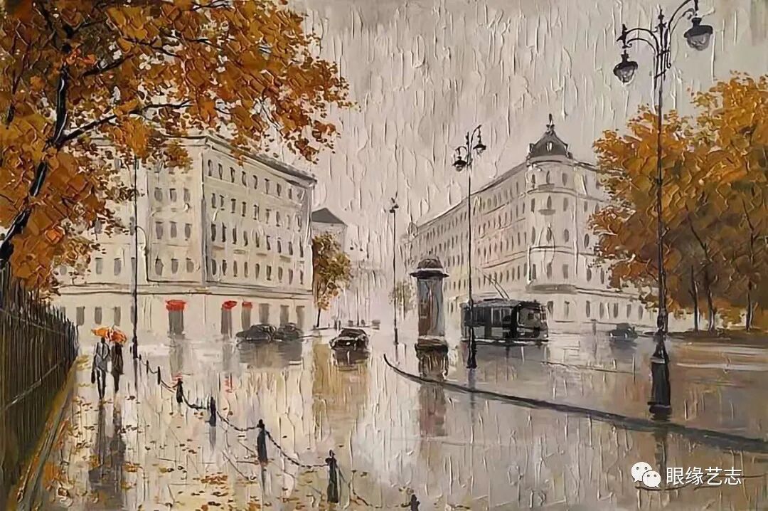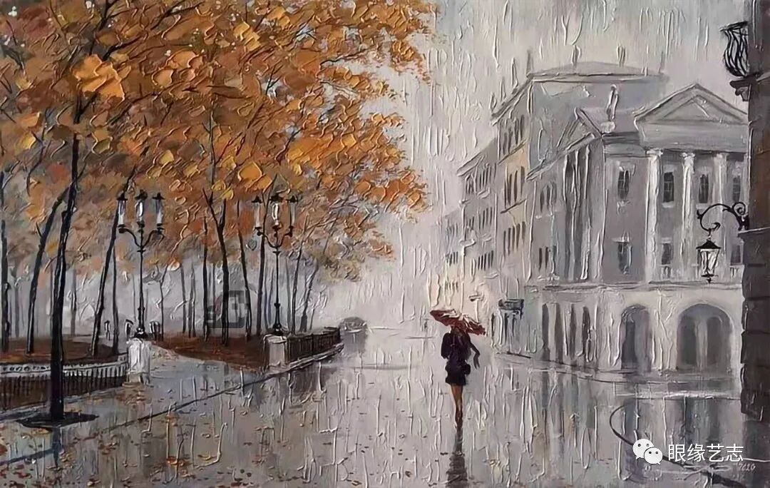 顿涅茨克城位于乌克兰的东南部,属温带大陆性气候,年平均降雨天数可达162天。在阴雨中成长起来的亚历山大,早已习惯了被雨水浇灌的视野。多年的努力与尝试,他不断思考着如何刻画这些几乎终日相伴的雨水,不觉间,已成为了远近闻名的雨中风景绘画大师。