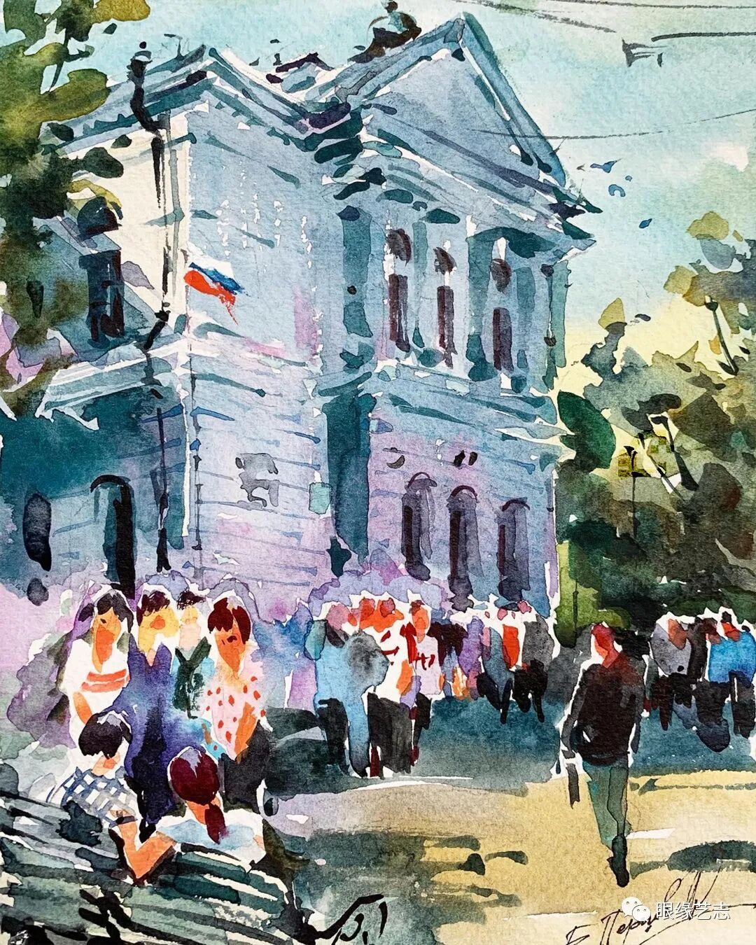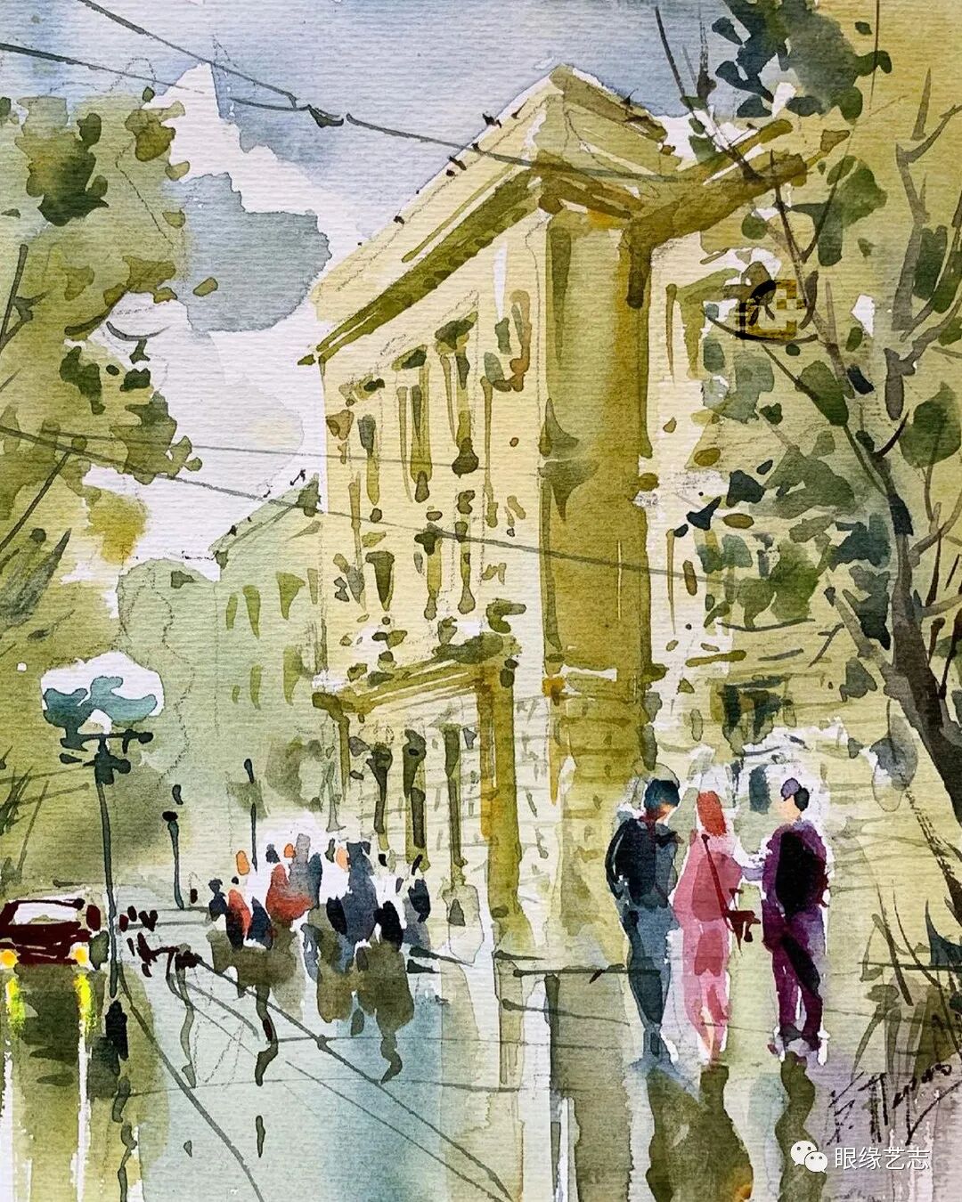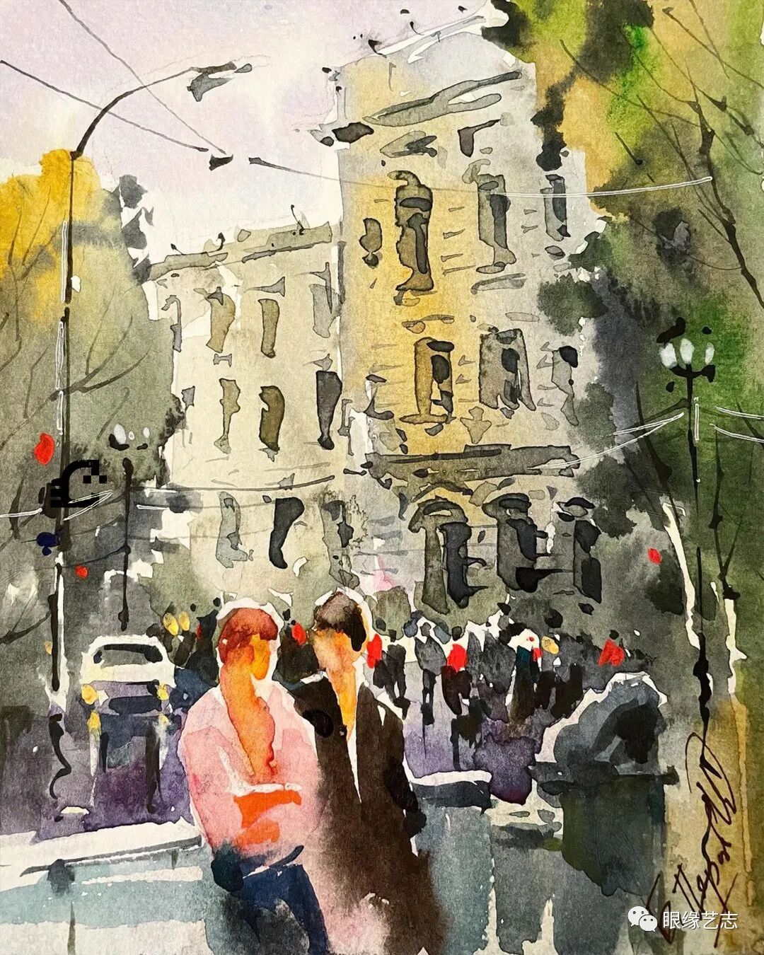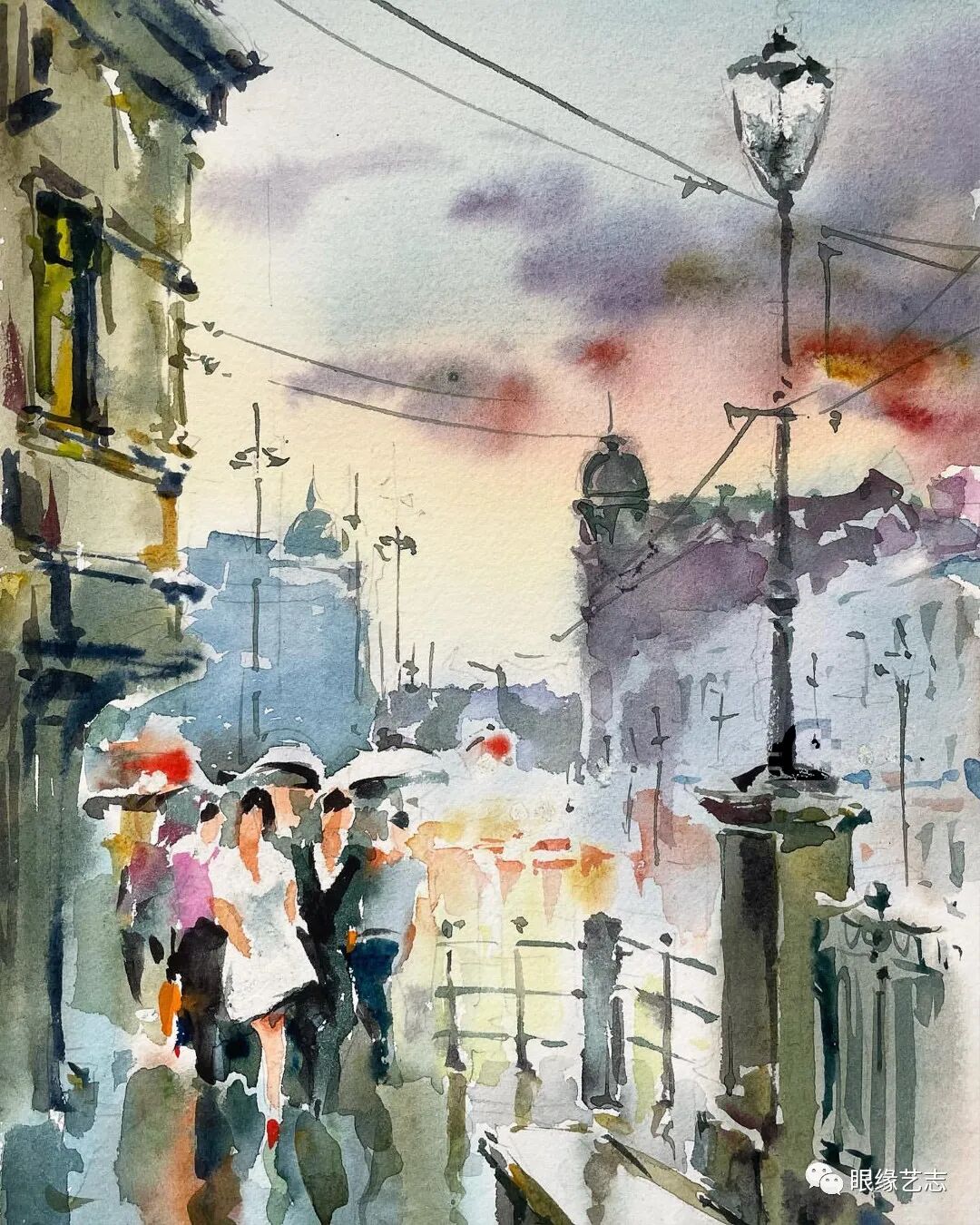 目送着行色匆匆的路人,理解着他们可能怀揣的心事,清透的色彩、旖旎的质感,掩映在眼里的已不止水彩的清淡之态,更是一种遥远却又清晰的流年印记。在现实与回忆的交织中,鲍里斯用轻快的混色填充着每一座城市的故事,虚实交叠的影影绰绰,于悠然中,谱写了一部部平实而又虚幻的城市交响曲。