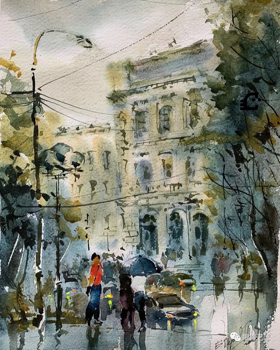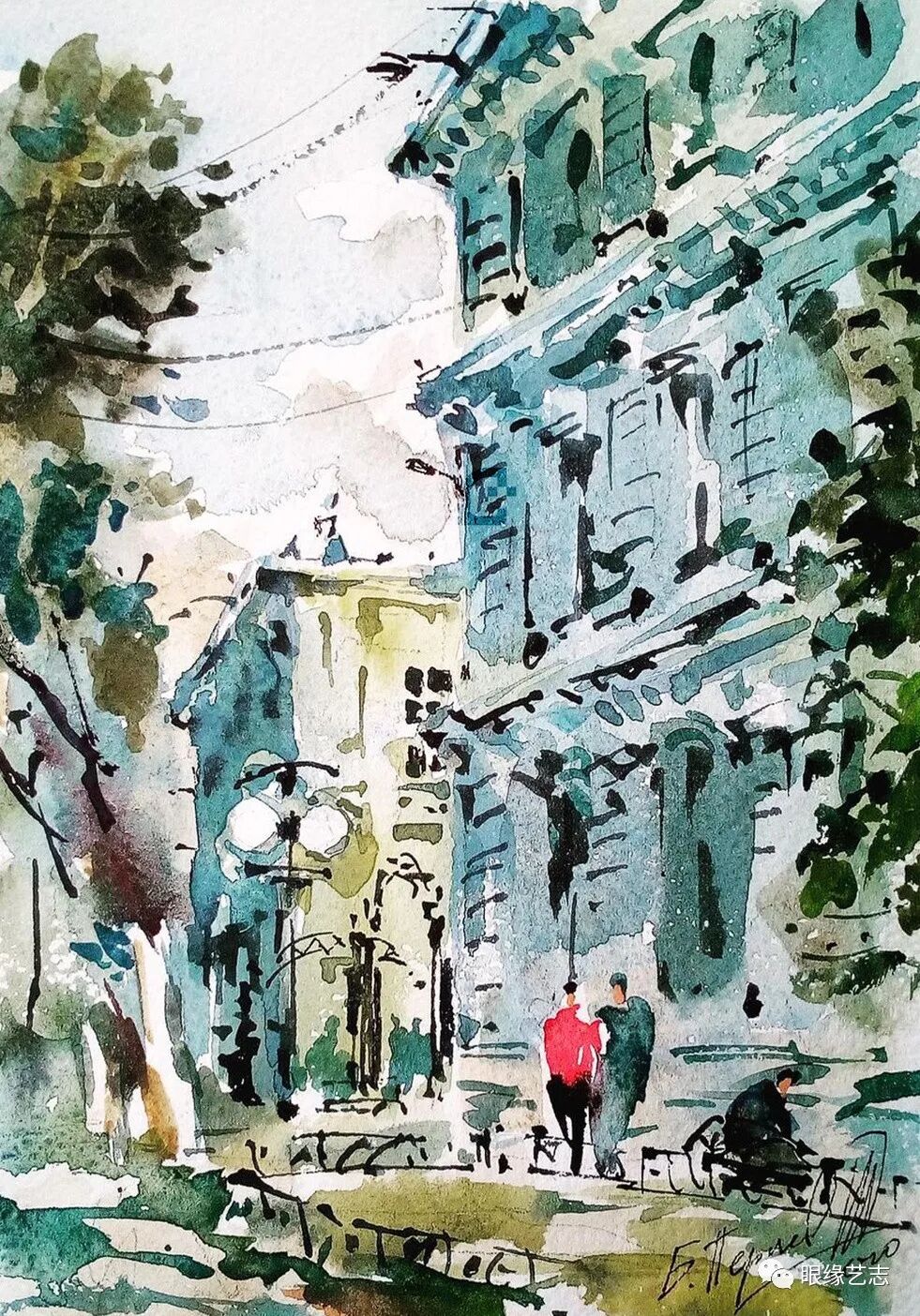 走过的城市,眼中的回忆。在流动的色彩中,鲍里斯喜欢在元素之间留有一丝空白,这样的处理手法在水彩画中并不常见。在实际绘制过程中,这要求画者对纸张有着充分地了解,对水分有着严苛的要求,对笔法有着精确的掌控。既要行云流水、不拘小节,又要强调距离、粗中有细。