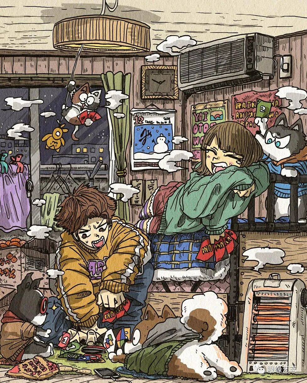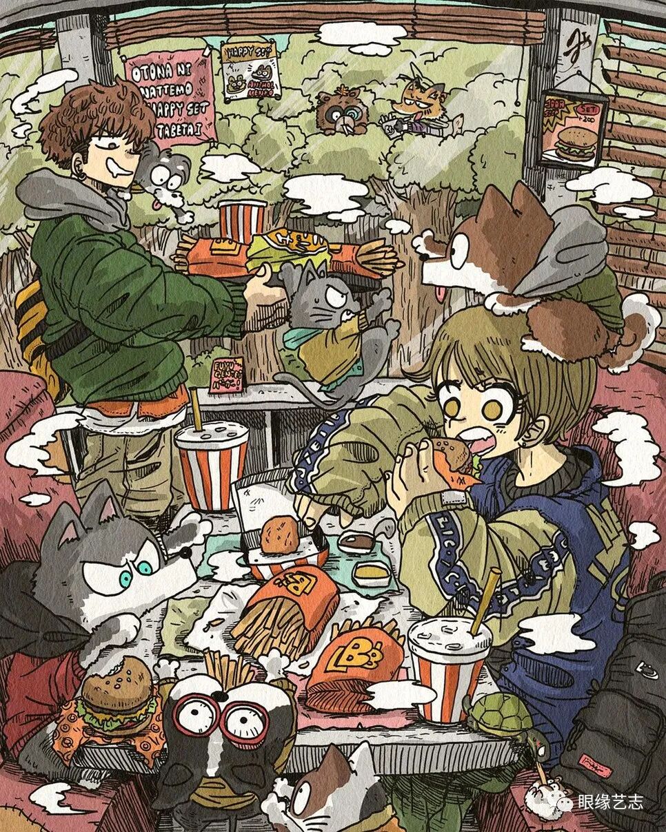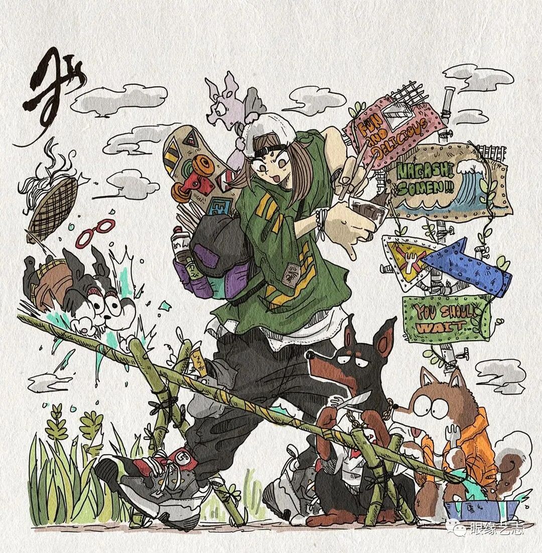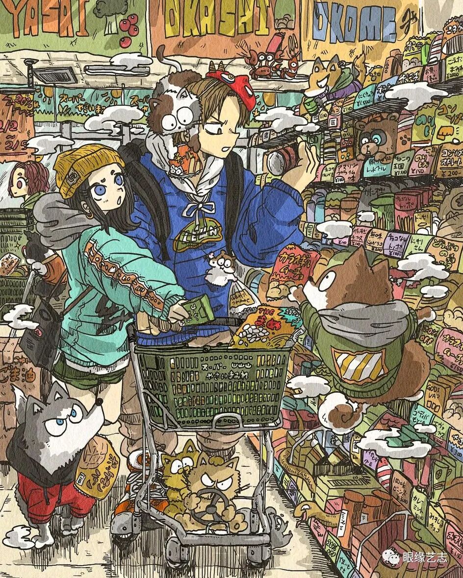大垣一树的作品漫画感十足,尽管画中细节众多,但在创作中,他依然能够兼顾人物、色彩以及构图的节奏感。低饱和度的配色方案结合纸张的纹理质感,让发生于故事空间中的有趣构想蔓延至画外,虽不是剧情漫画,但作品既可独立成画,又在角色与情节上有所关联,这种松散却能保持风格统一的绘制形式,在极具观赏性的同时,也给予了画者高度的创作自由。