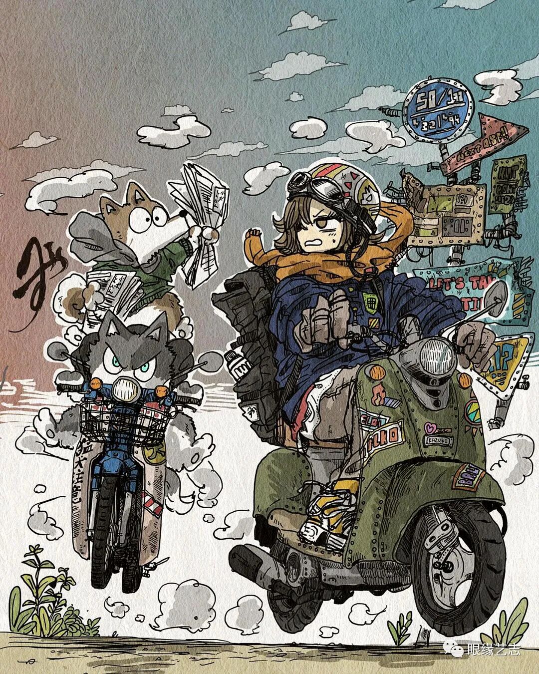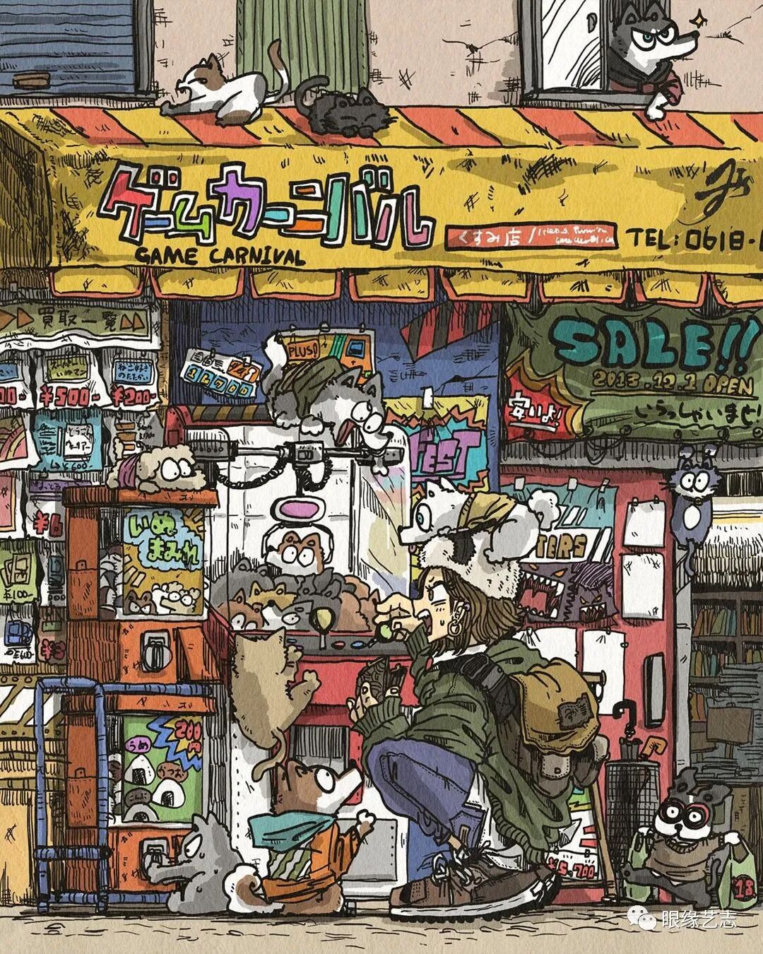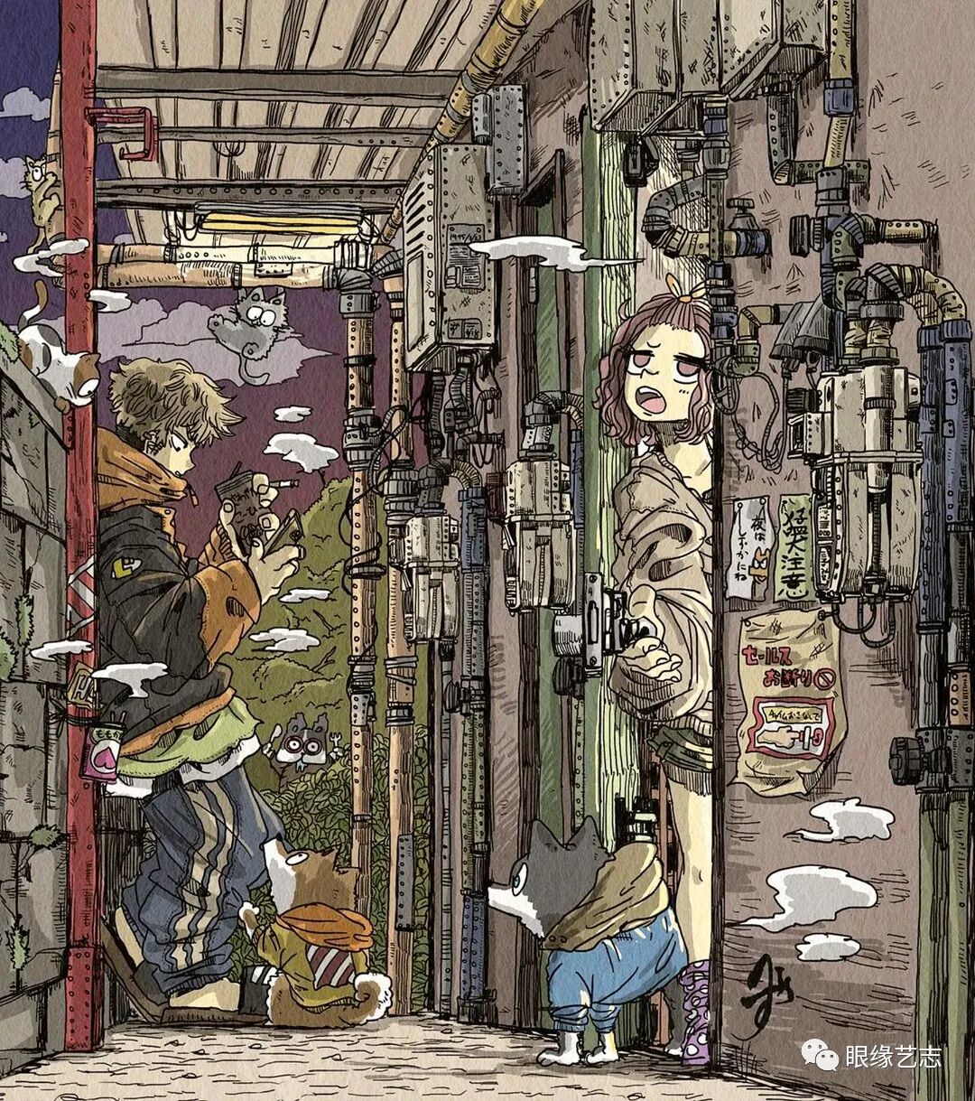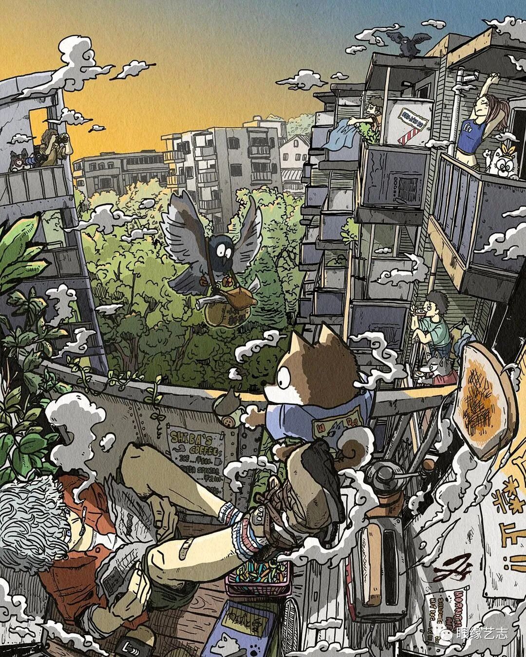 大垣一树的作品漫画感十足,尽管画中细节众多,但在创作中,他依然能够兼顾人物、色彩以及构图的节奏感。低饱和度的配色方案结合纸张的纹理质感,让发生于故事空间中的有趣构想蔓延至画外,虽不是剧情漫画,但作品既可独立成画,又在角色与情节上有所关联,这种松散却能保持风格统一的绘制形式,在极具观赏性的同时,也给予了画者高度的创作自由。