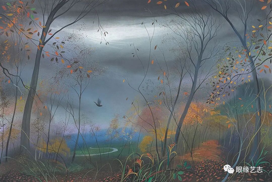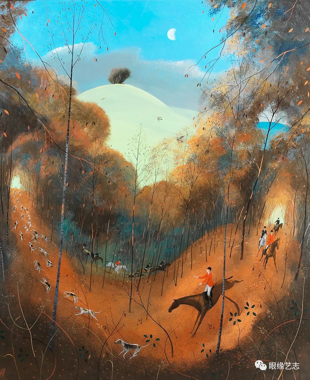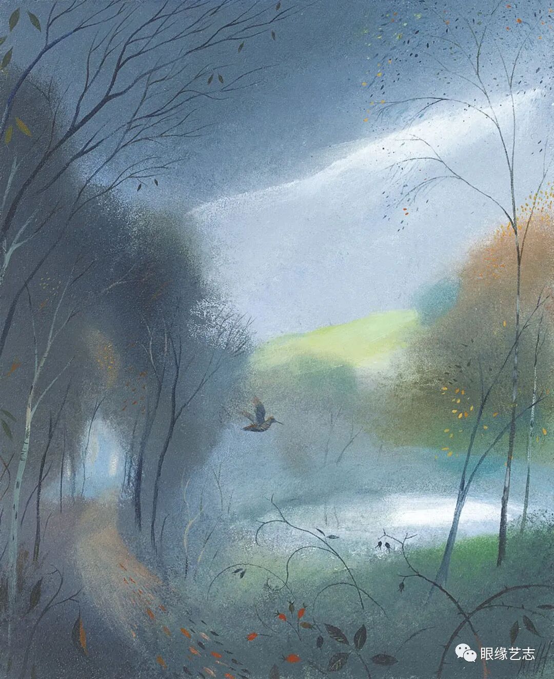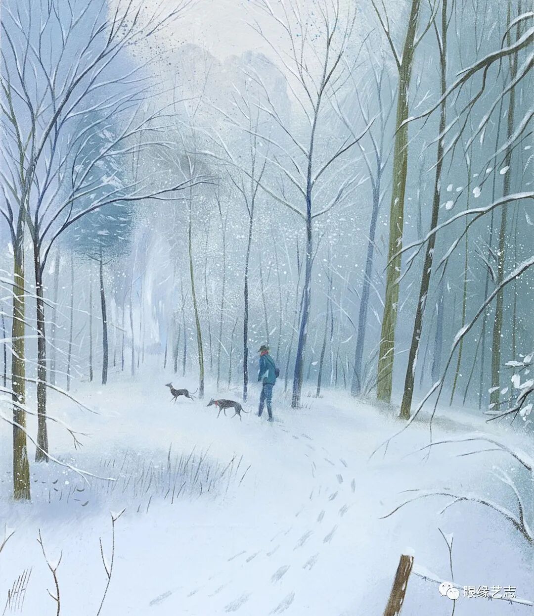 每个季节都有自己的情绪,而我,只是一个在风景中记录情绪的画家。我很幸运,能够在30年前决定远离灰色的人行道,和妻子、孩子住在多塞特郡的乡下。这里离海不远,多变的气候往往会形成巨大的戏剧性景观。飞驰的云层下,人和动物看起来都很小,小到就像是寒冷冬日里天空中的一只鸟,尽管如此,但却足以成为那一刹那,我的全部世界。