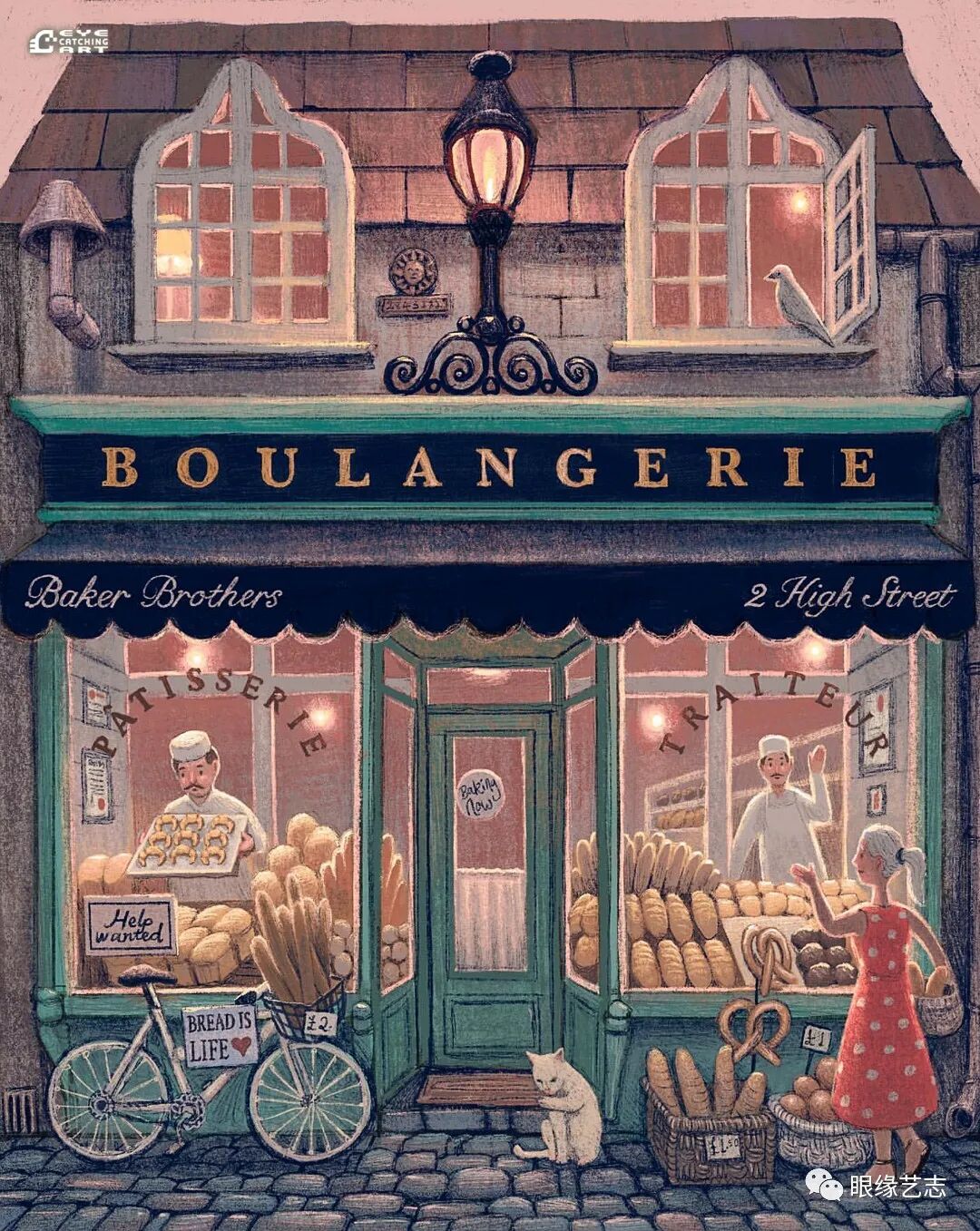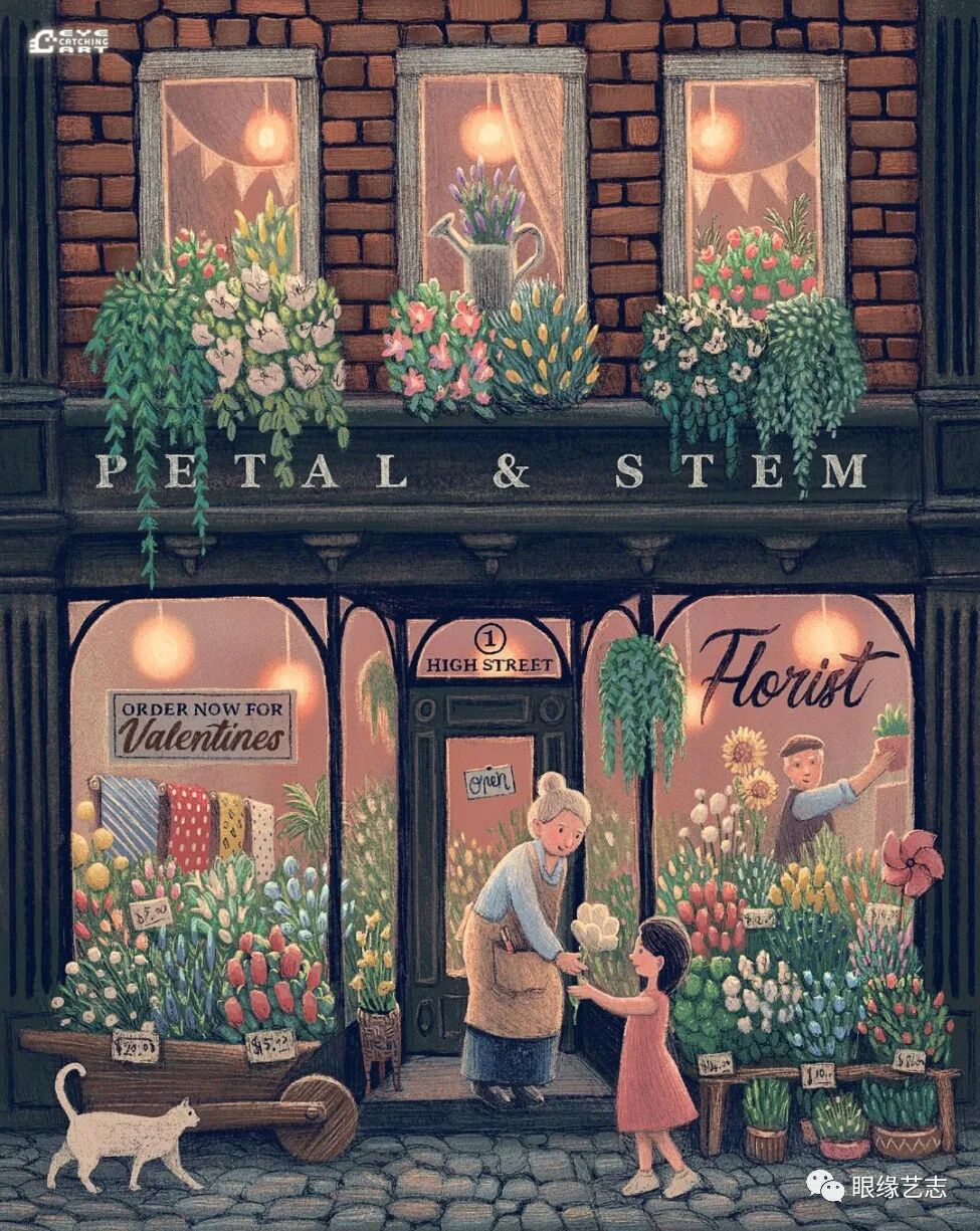 以墨尔本最繁华的街道High Street为蓝本,《Wizard & Co》(巫师百货商店)会将读者瞬间带到19世纪的建筑群落中。在这部绘本中,米切尔·托伊着重描绘了这条街的1号花店“Petal & Stem”、2号面包房“Baker Brothers”、3号书店“Bluebird Books”、4号小酒馆“La Chatte Blanche”、5号旧玩具店“The Old Toy Shop”、6号小菜站“Romano Grocers”以及7号的酒吧“Romano Grocers”。一面面古朴的店铺精致而温馨,难怪许多孩子在看到这几幅作品后都想要成为它们的邻居。这正如米切尔·托伊所说的:“如果你在这里长大,不可能不爱墨尔本”。