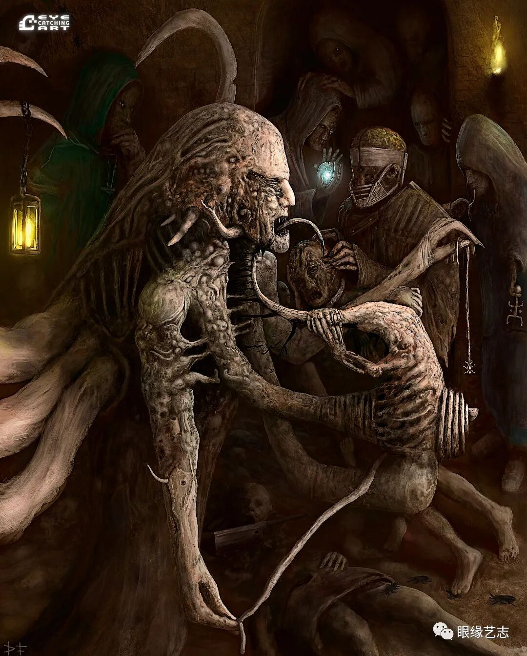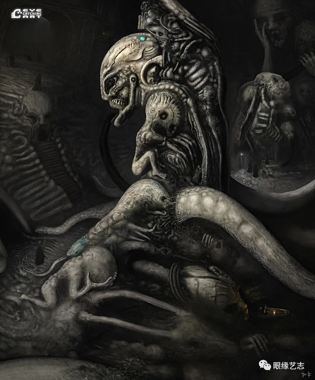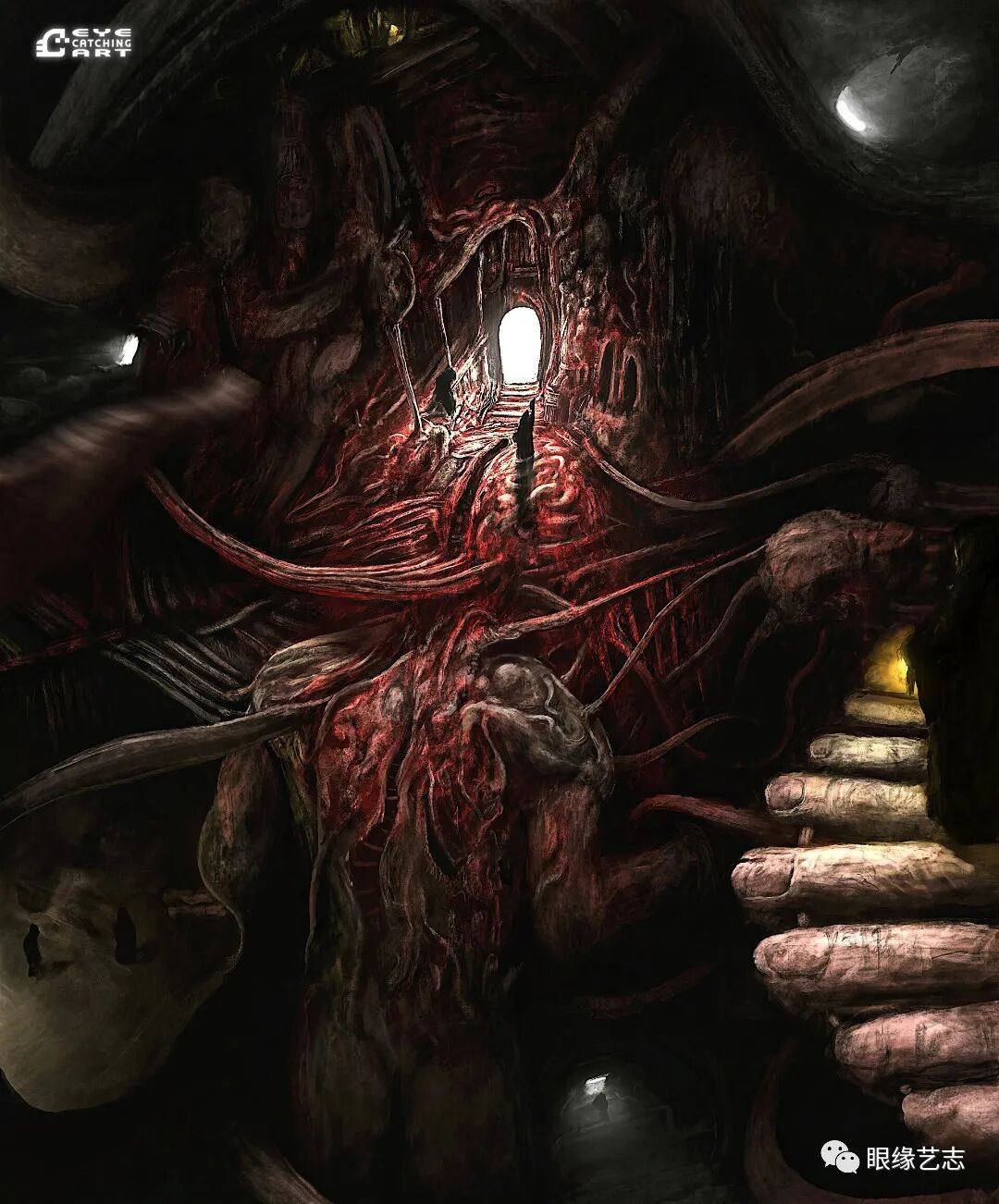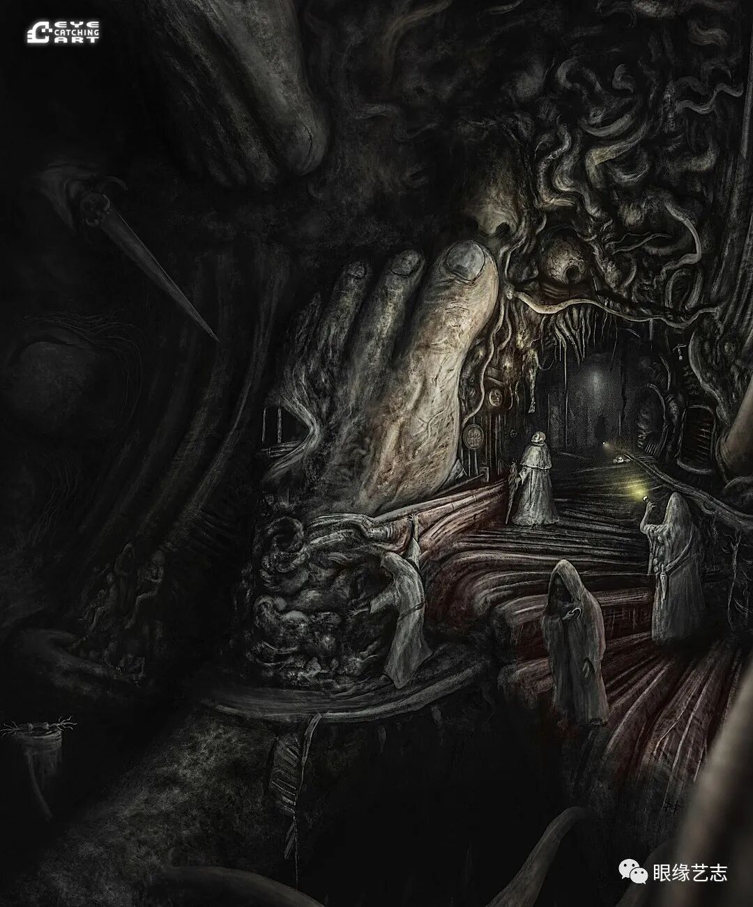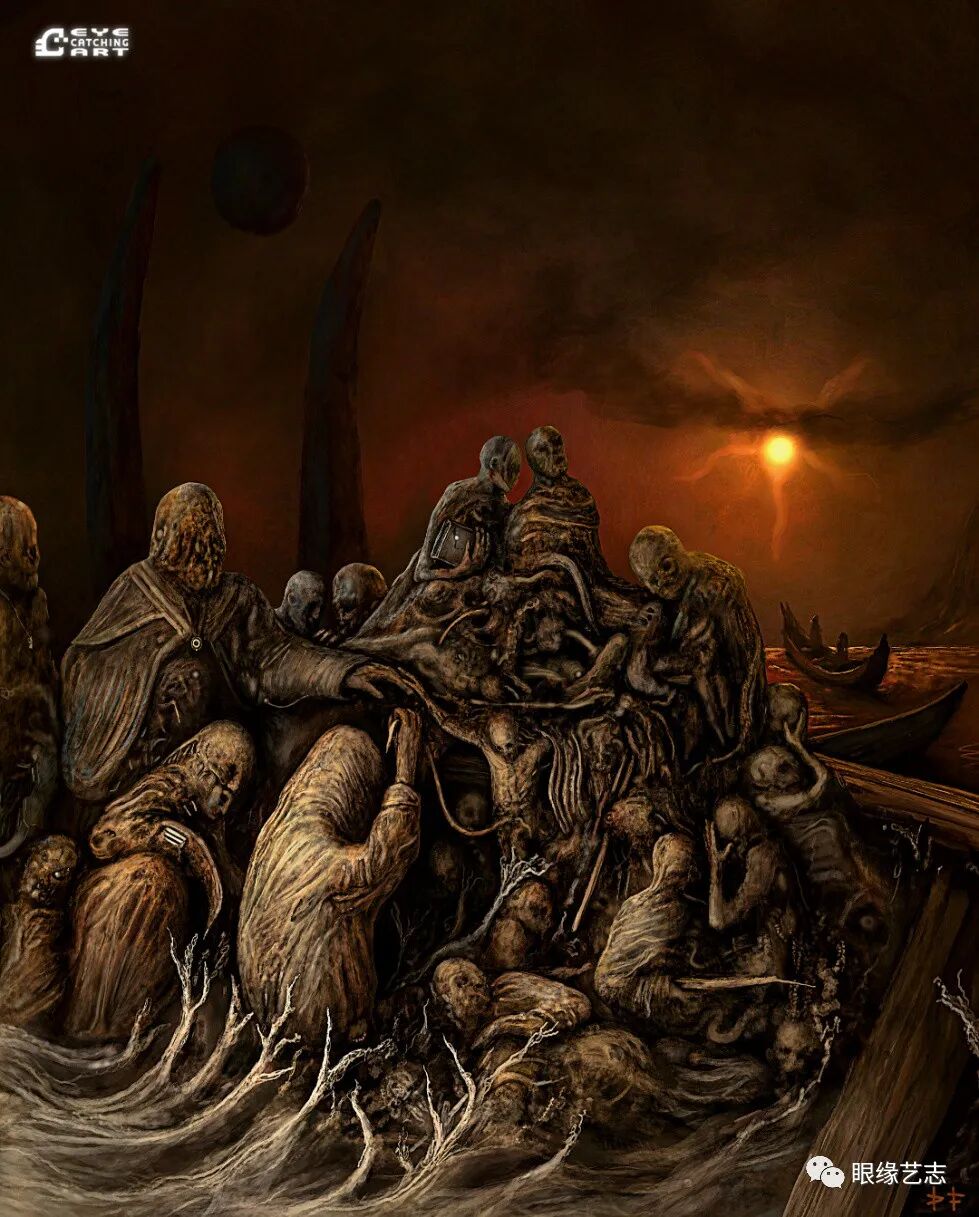 而给予我最大启发的是吉格尔(Hans Rudolf Giger,瑞士著名超现实主义画家,曾因设计电影《异形》中的外星生物而赢得奥斯卡金像奖的最佳视觉效果奖),他的风格核心在我的潜意识里是一种非常独特的存在。诸如生命的衰老、扭曲的肢体、阴郁的底色等形式,都是表现恐怖时非常重要的组成部分。但我从来没有打算去复制他,而且在创作中也会刻意遗漏某些其标志性的、能够令人印象深刻的东西。我只想做我自己的事情,画出我自己的思想。