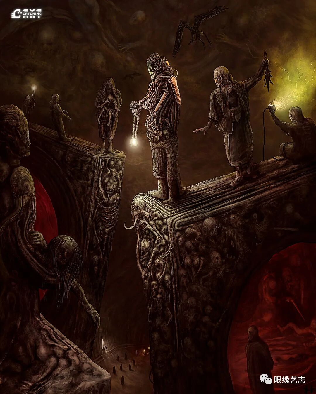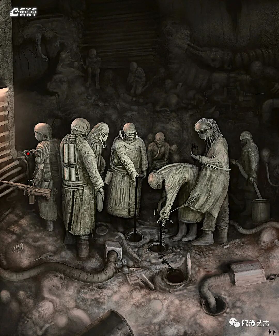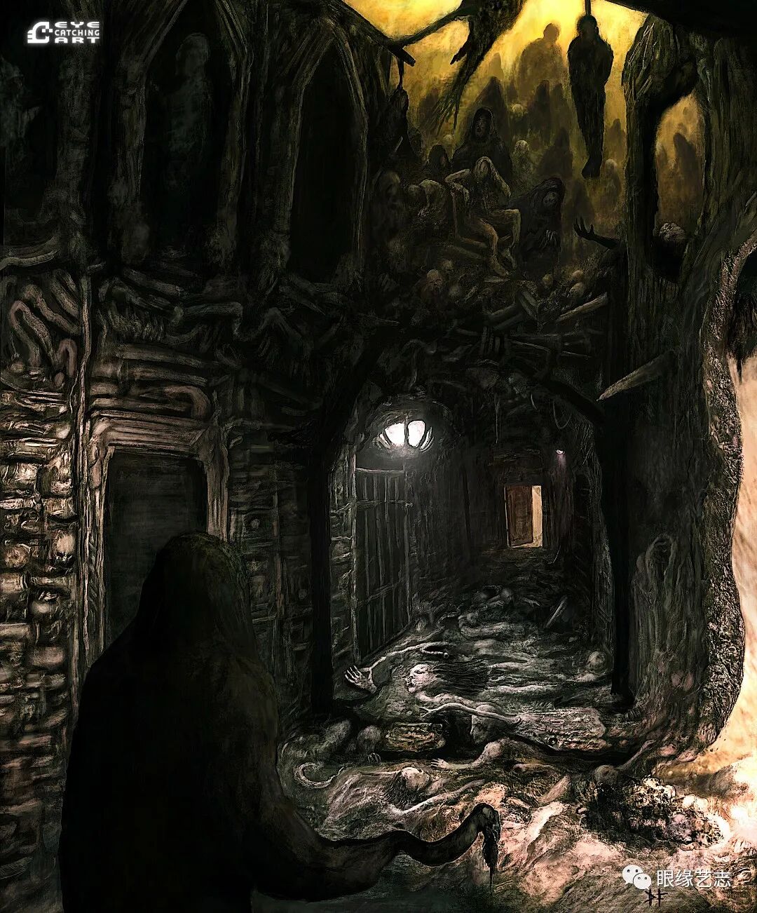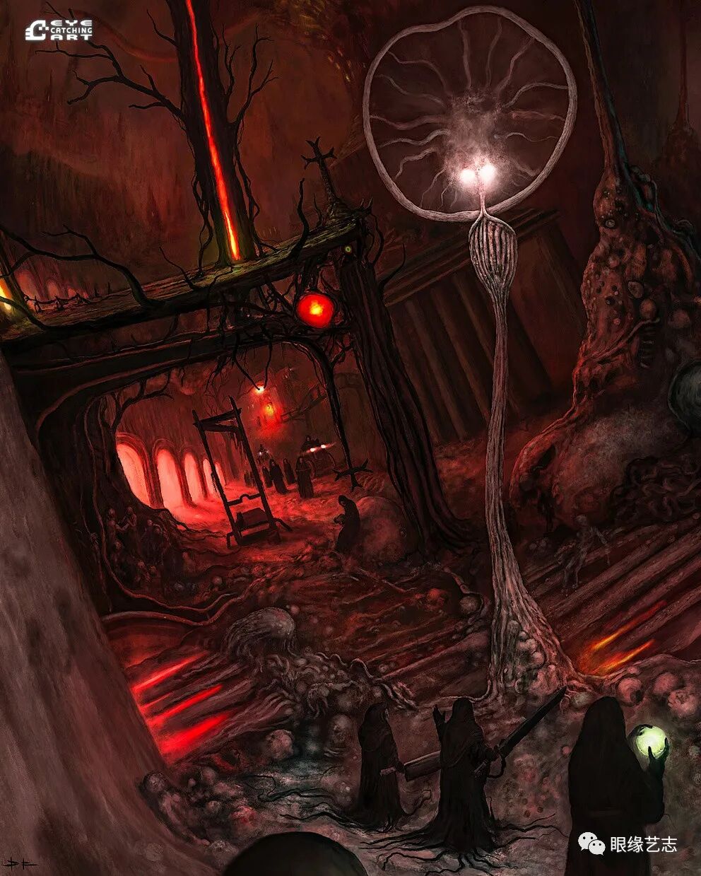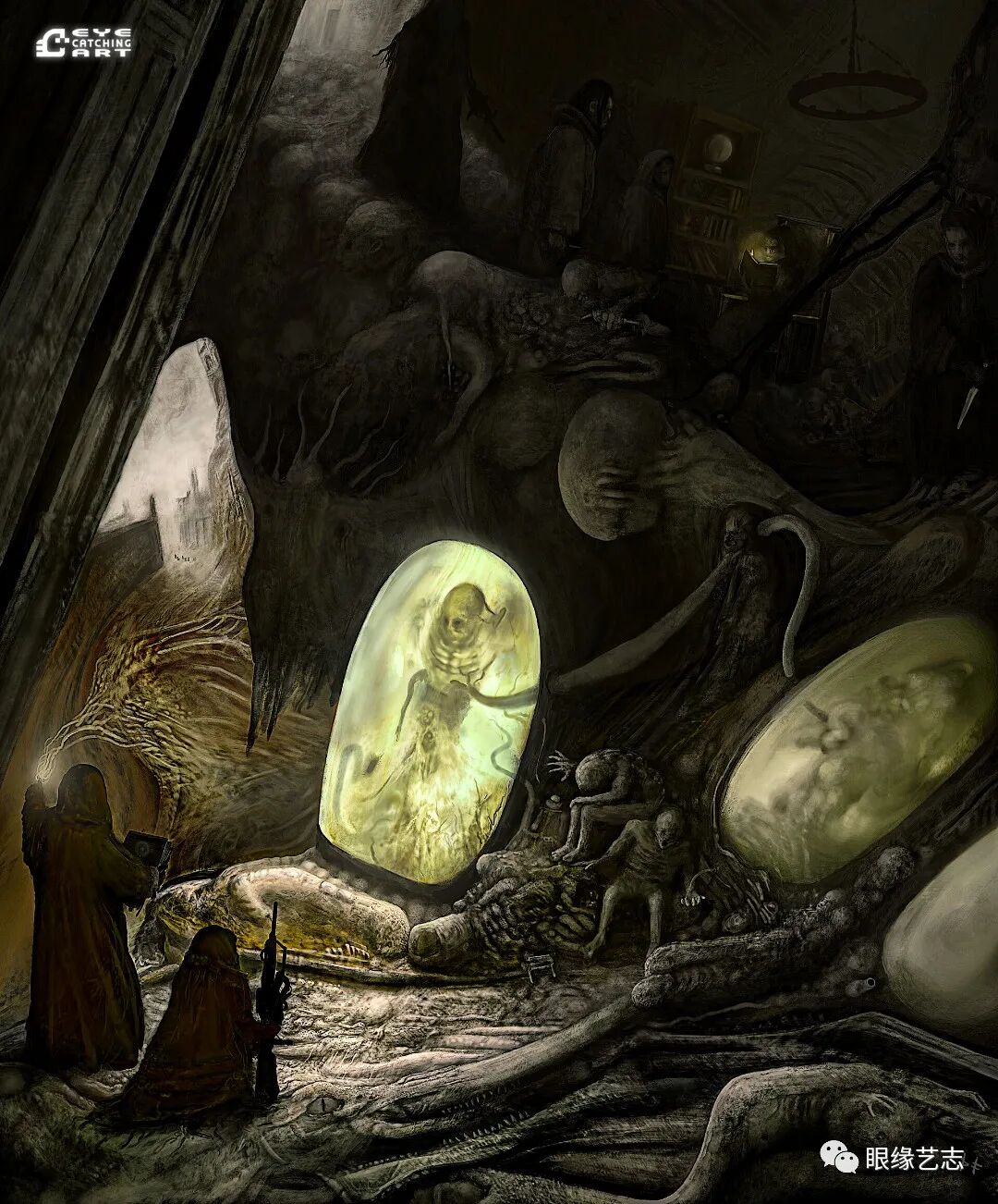 而给予我最大启发的是吉格尔(Hans Rudolf Giger,瑞士著名超现实主义画家,曾因设计电影《异形》中的外星生物而赢得奥斯卡金像奖的最佳视觉效果奖),他的风格核心在我的潜意识里是一种非常独特的存在。诸如生命的衰老、扭曲的肢体、阴郁的底色等形式,都是表现恐怖时非常重要的组成部分。但我从来没有打算去复制他,而且在创作中也会刻意遗漏某些其标志性的、能够令人印象深刻的东西。我只想做我自己的事情,画出我自己的思想。