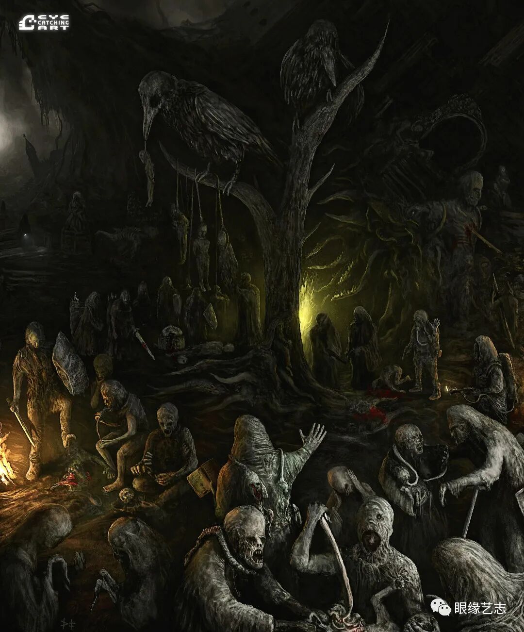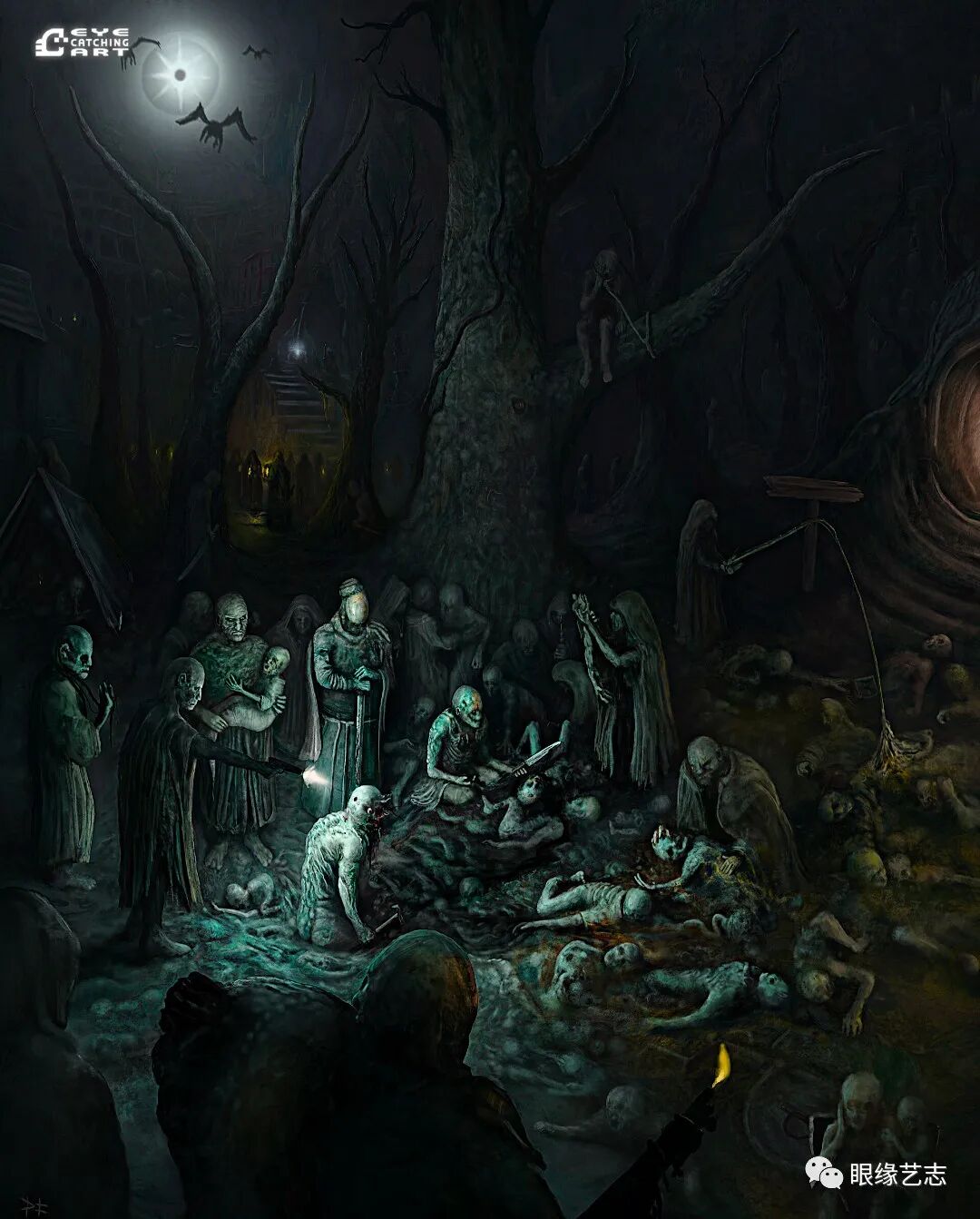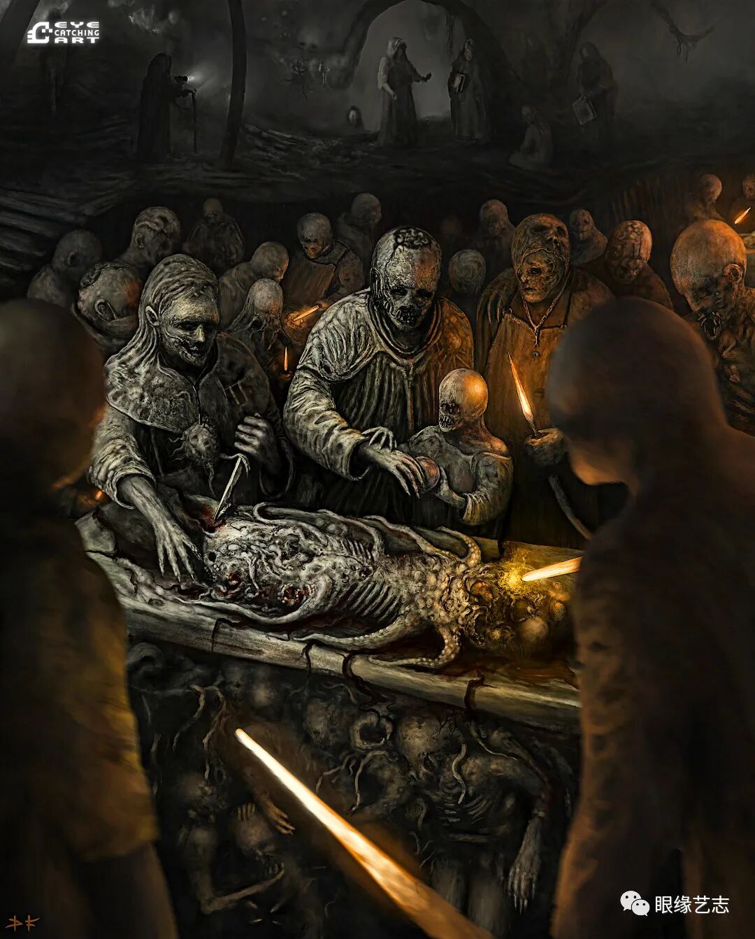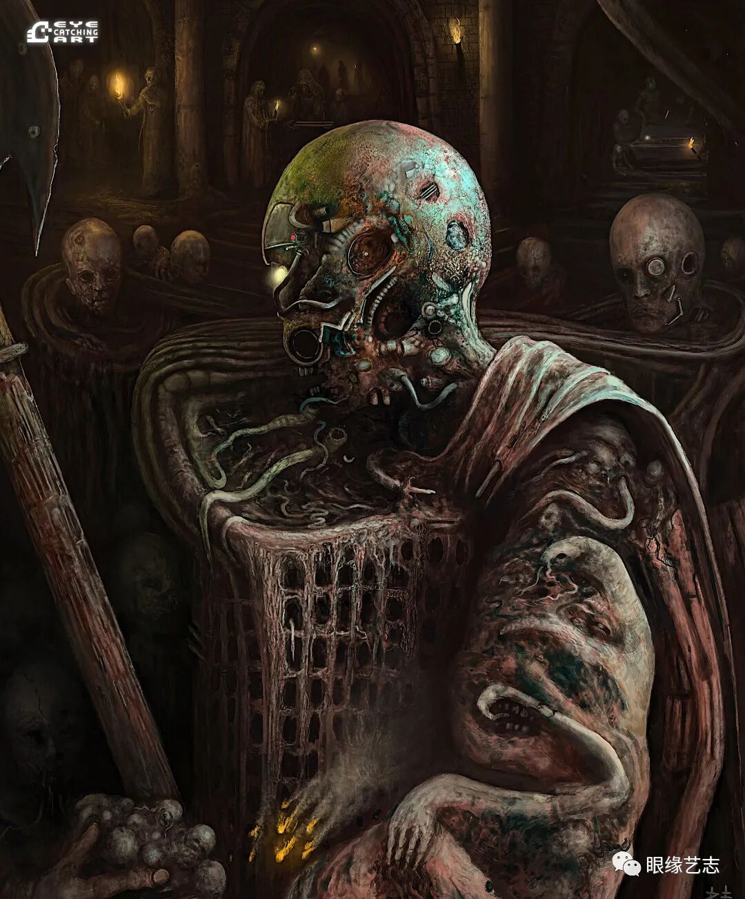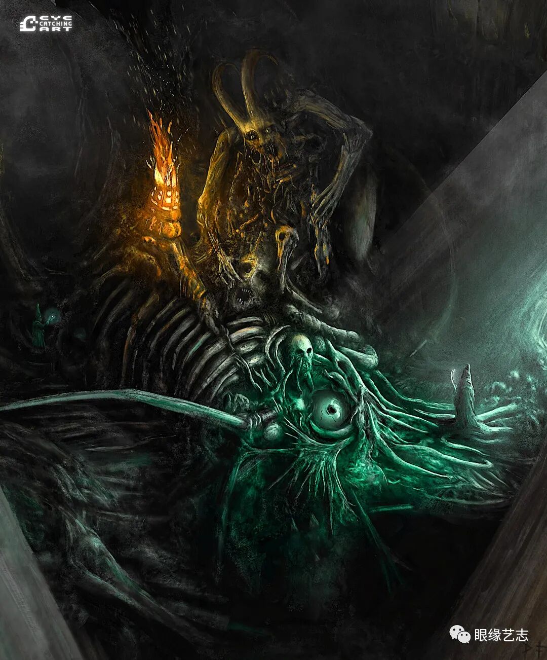 而给予我最大启发的是吉格尔(Hans Rudolf Giger,瑞士著名超现实主义画家,曾因设计电影《异形》中的外星生物而赢得奥斯卡金像奖的最佳视觉效果奖),他的风格核心在我的潜意识里是一种非常独特的存在。诸如生命的衰老、扭曲的肢体、阴郁的底色等形式,都是表现恐怖时非常重要的组成部分。但我从来没有打算去复制他,而且在创作中也会刻意遗漏某些其标志性的、能够令人印象深刻的东西。我只想做我自己的事情,画出我自己的思想。