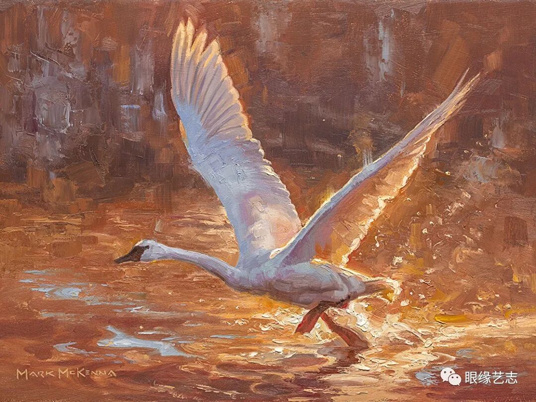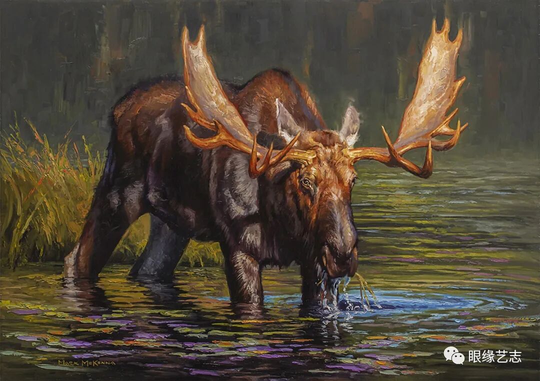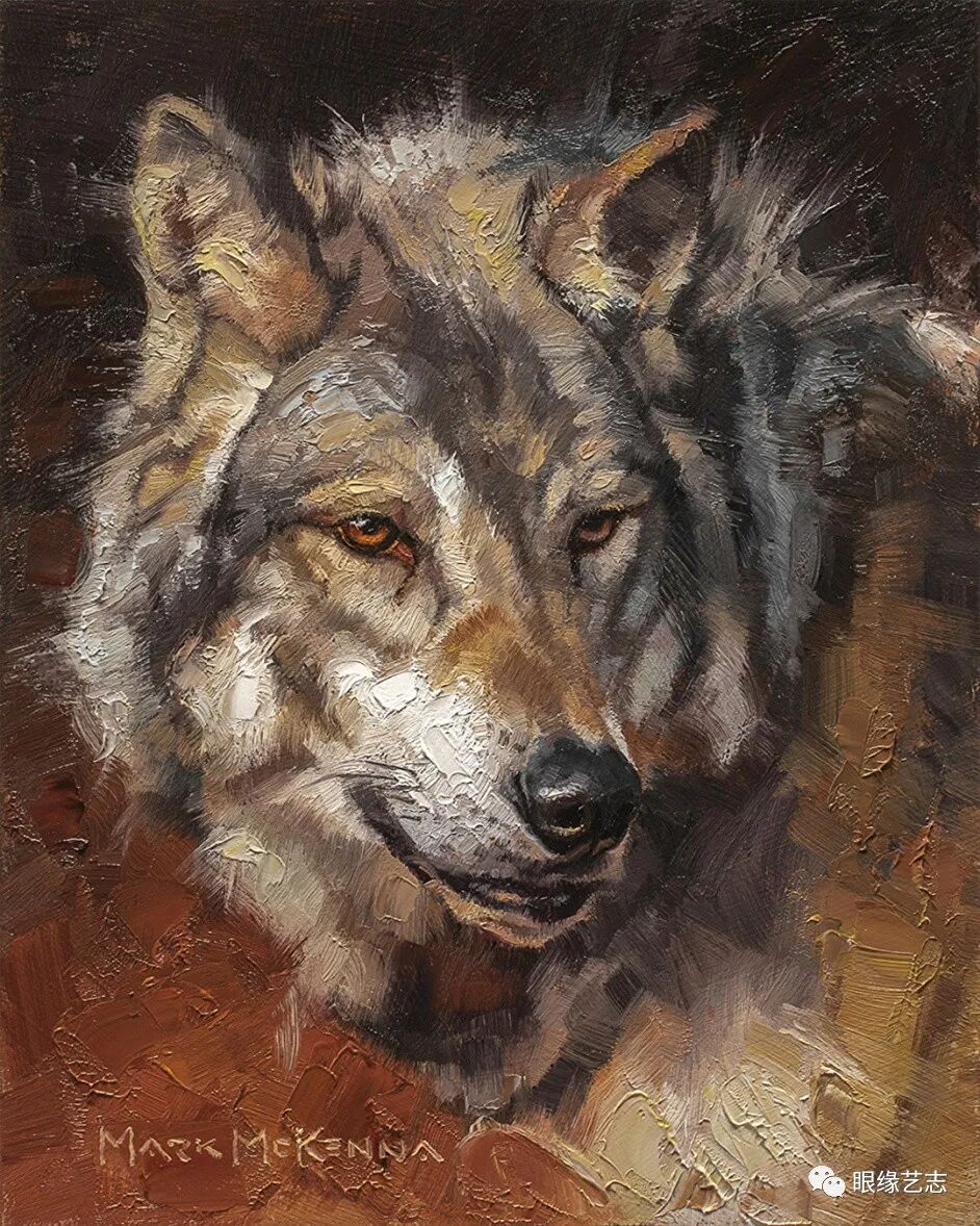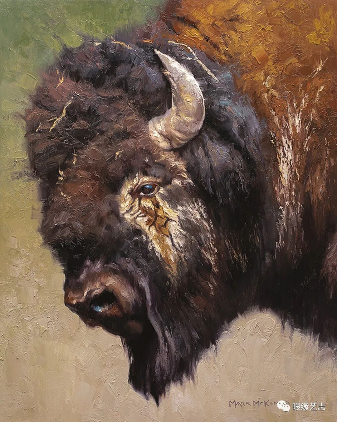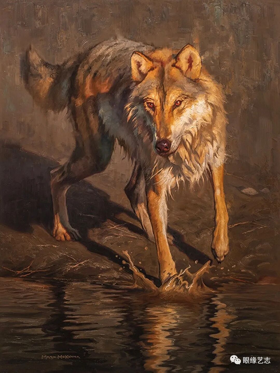 马克·麦肯纳坦承,他的作品受到了很多东、西方艺术家的影响,比如美国当代油画家克莱德.阿斯佩维格(Clyde Aspevig)、“用颜料雕刻”的野生动物画家格雷格·比查姆(Greg Beecham)以及华裔旅美画家ZS Liang。但麦肯纳更渴望于这些大师的肩膀上走向自己的风格,就像在危机四伏却又生机勃勃的黄石国家公园中他勇敢的独行背影一样。