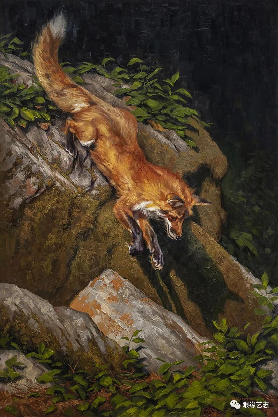 “我不需要画出每一根毛发、每一片草叶、每一丝或凝固或飞旋的空气,每个元素都可以仅通过颜色、纹理和氛围来诠释,而不是复制那些被明确定义的照片。我尽量确保画作的新鲜度,但随着我所画的动物越来越多,这个目标会变得具有挑战性。我必须忠实于主体的形式和解剖结构,所以,每一个笔触都是经过计算和精心布置的,也许它并不精细,但在令人心跳加速的密林或者旷野,却足以传达必要的生命气息。”
