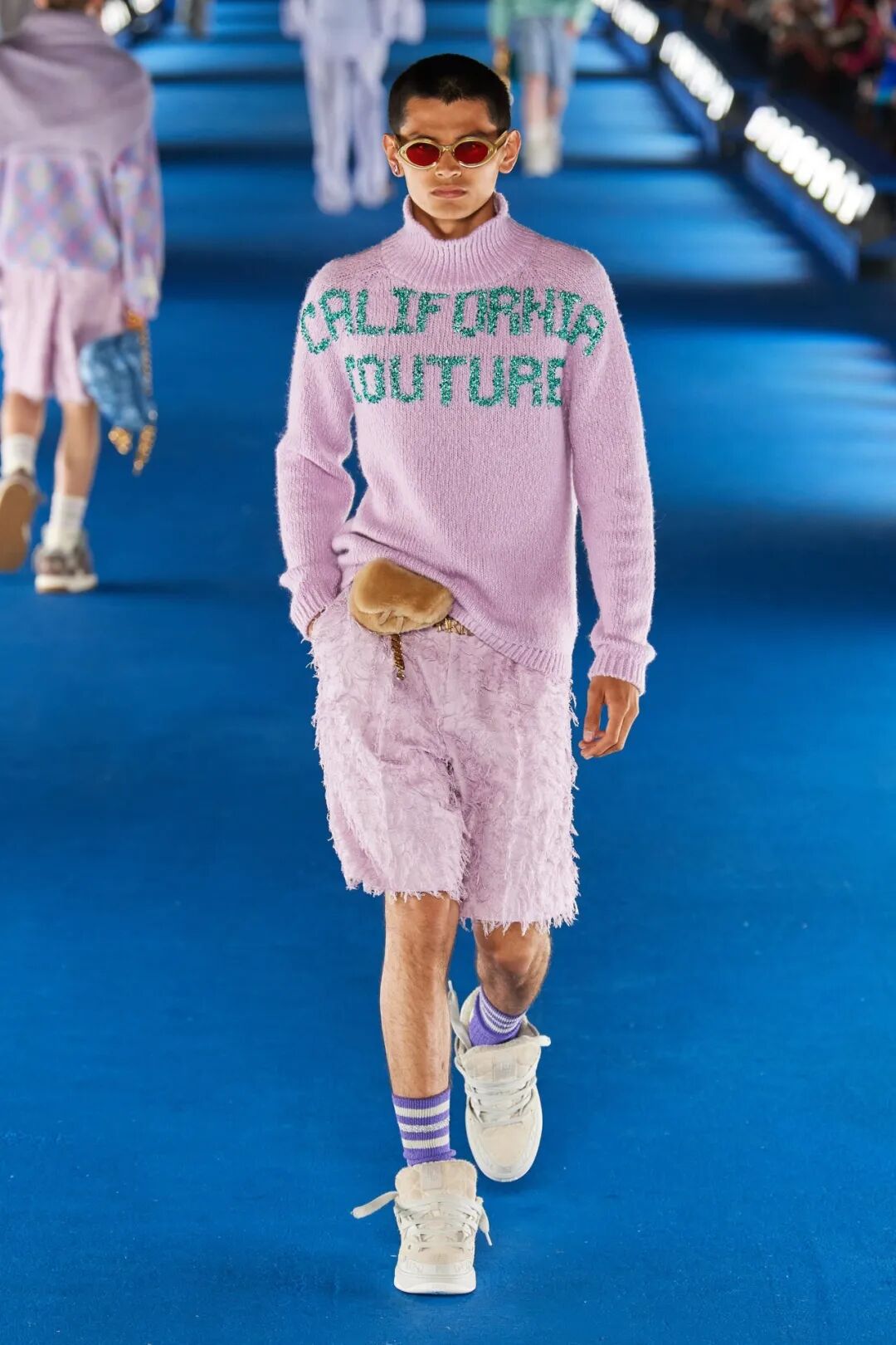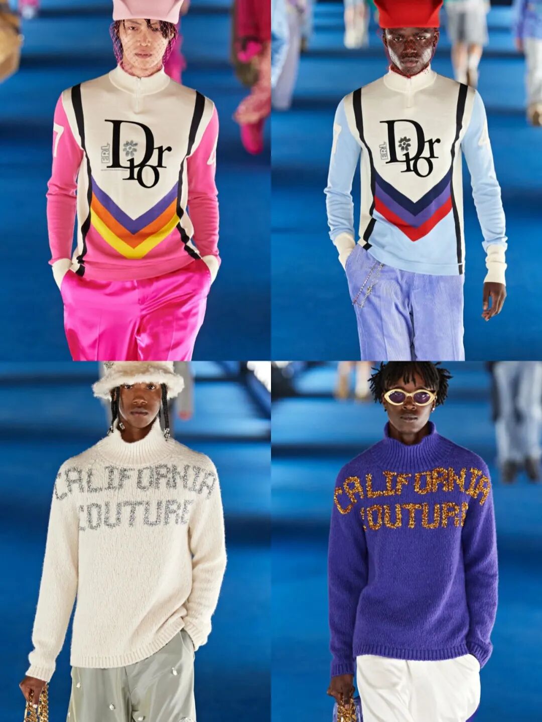 ERL标志性的波浪图案,沙滩渐变元素,多彩印花以及衍缝设计,针织衫、羽绒夹克+休闲短裤的造型,与Dior精致考究的摩登风貌碰撞,传递出悠闲精雕细琢的加州生活方式。