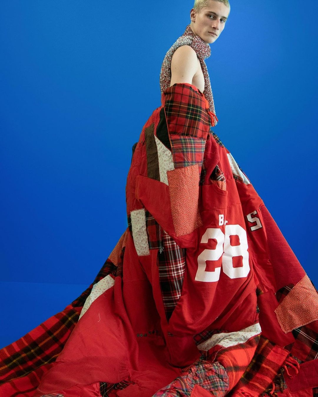 宛如歌剧戏服的披风则是运用格纹衬衫与运动衫拼贴而成,独特剪裁能完全包裹身体,还可当作沙滩巾使用,绽放好莱坞式皇家风范。