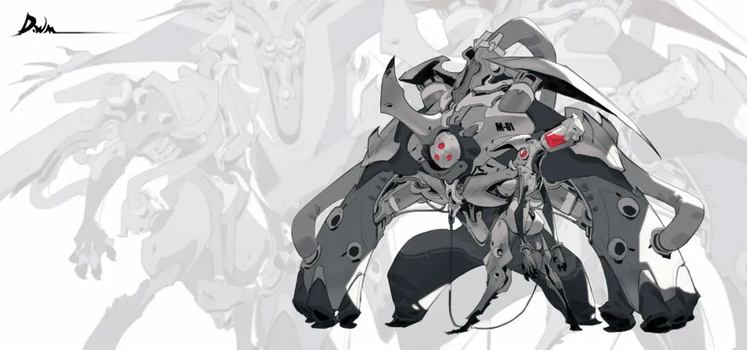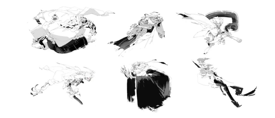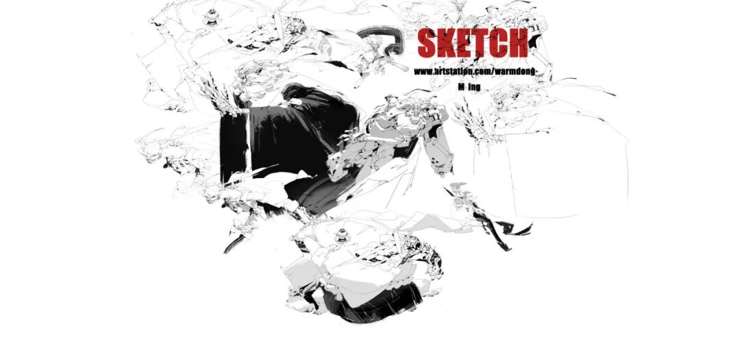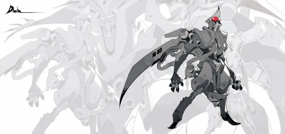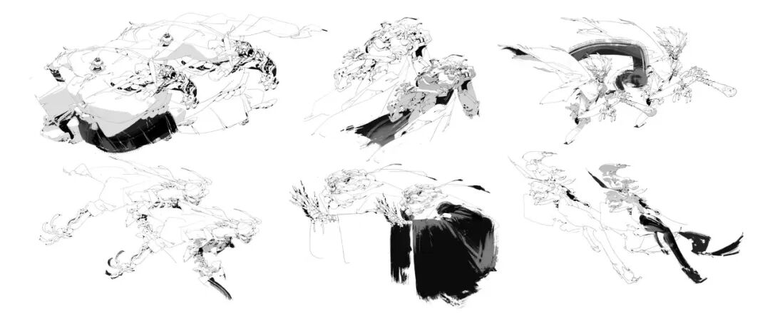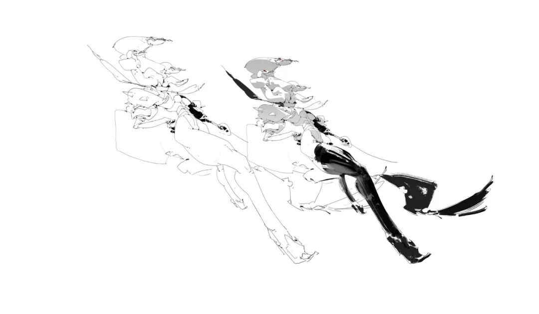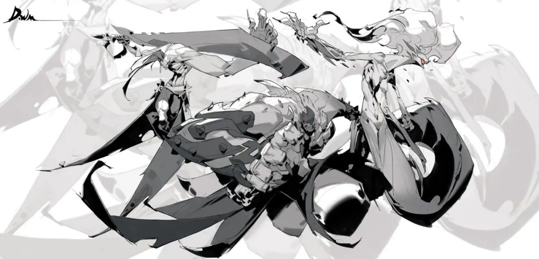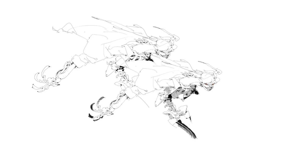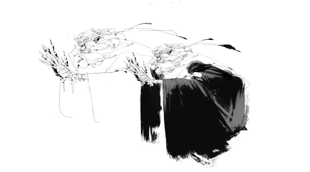 炜明:一般想法比较明确的时候我会用线稿来做前期的设计,然后在线稿的造型节奏趋势等没有问题情况下,再进行黑白配色,这样一个是可以观察设计的黑白灰比例,也可以作为后面配色明度上参照,其实这一步做得好的话,即便是黑白稿也是有很不错效果的,其实我有时候不想细化也会画很多线稿来创作。