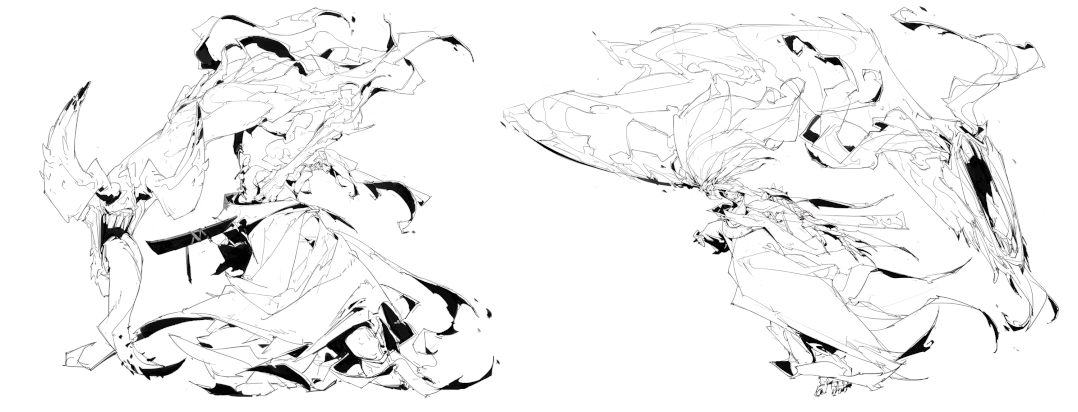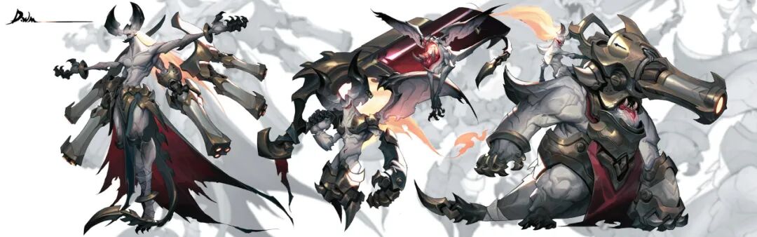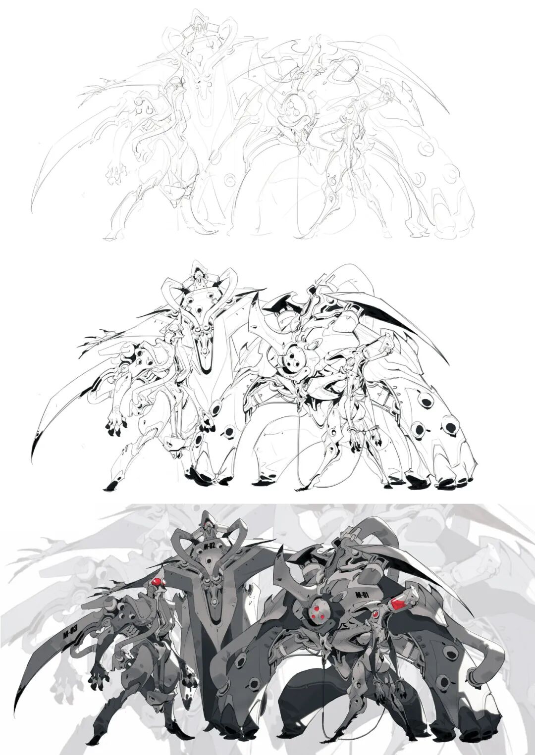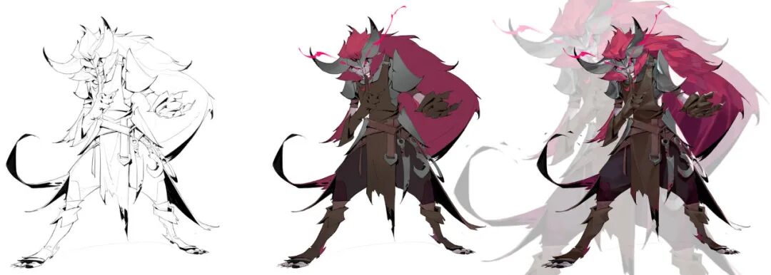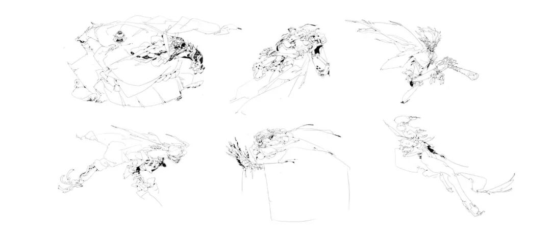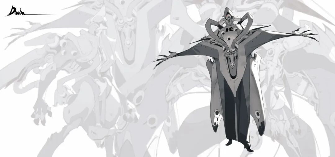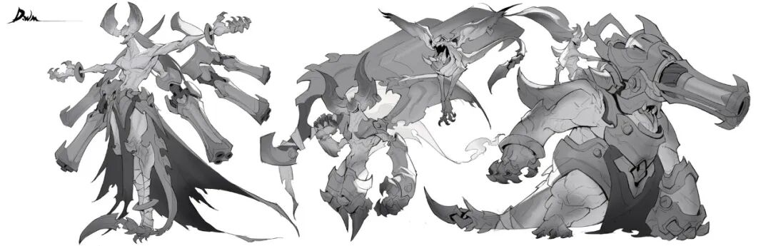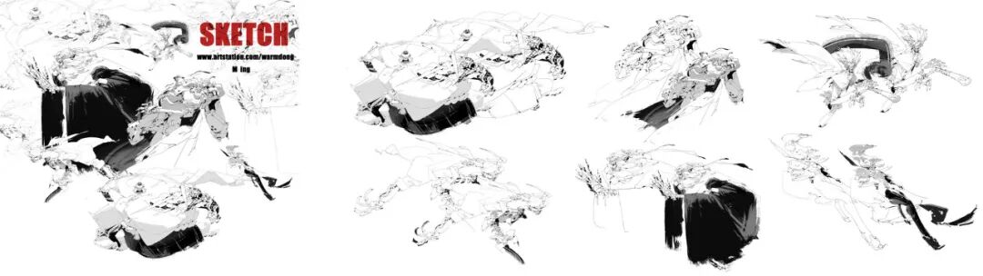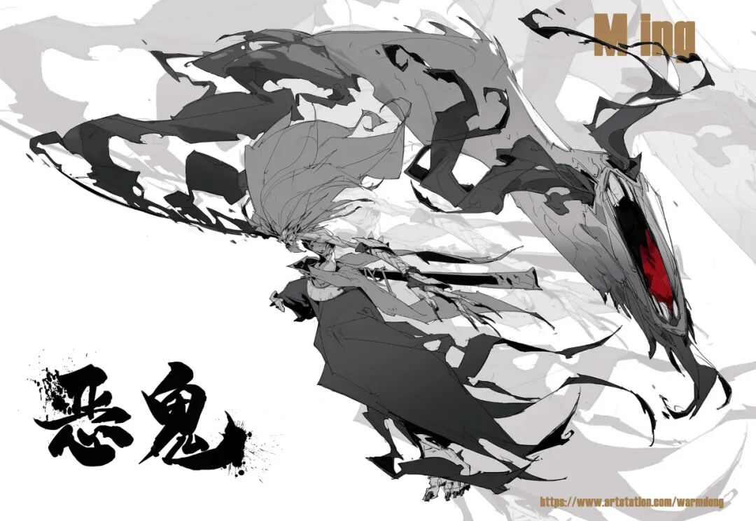 炜明:一般想法比较明确的时候我会用线稿来做前期的设计,然后在线稿的造型节奏趋势等没有问题情况下,再进行黑白配色,这样一个是可以观察设计的黑白灰比例,也可以作为后面配色明度上参照,其实这一步做得好的话,即便是黑白稿也是有很不错效果的,其实我有时候不想细化也会画很多线稿来创作。