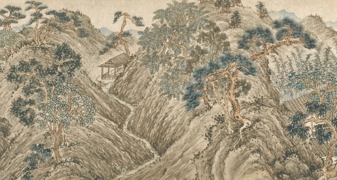 沈周《水北幽居图》局部,皴笔取法自黄公望,以披麻皴为主