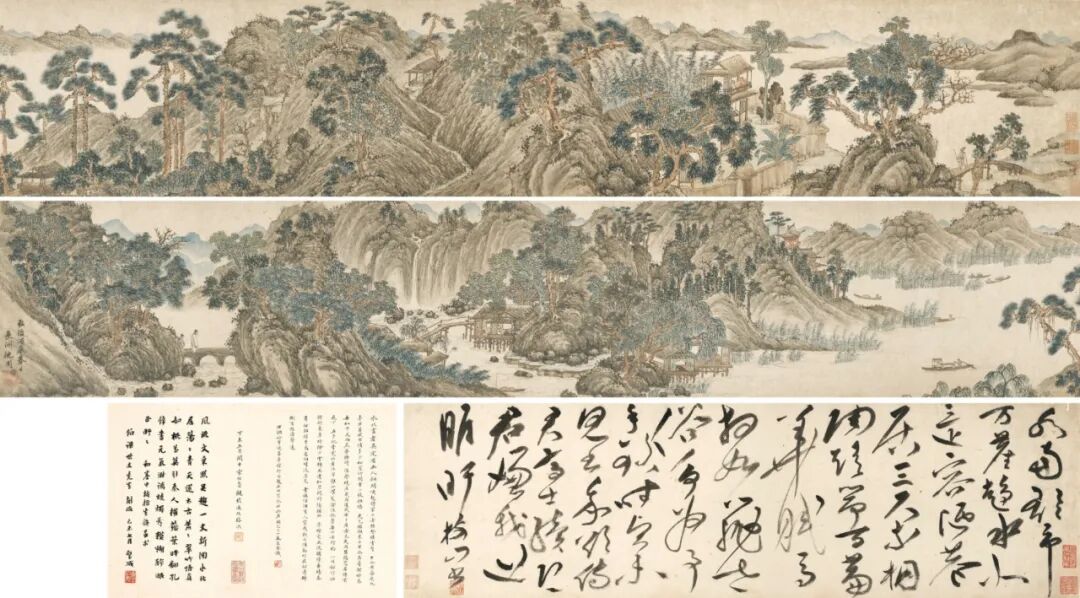 此卷长逾5米多,连景山水绵延不绝,用笔变化丰富,揉合「元四家」- 黄公望、王蒙、倪瓒、吴镇的笔墨特色。画卷开首有牛毛皴及密集点苔,显王蒙笔法;中段的奇峰巨壁、垒垒堆叠,则略带黄公望笔意;平远山村、树石松秀,仿佛有倪瓒山水之意境;背带出溪山回曲,树木萧森,渐有吴镇风格;最后以平石矮坡作结,加上长披麻皴,乃参用吴黄两家之法,而黄公望居多。