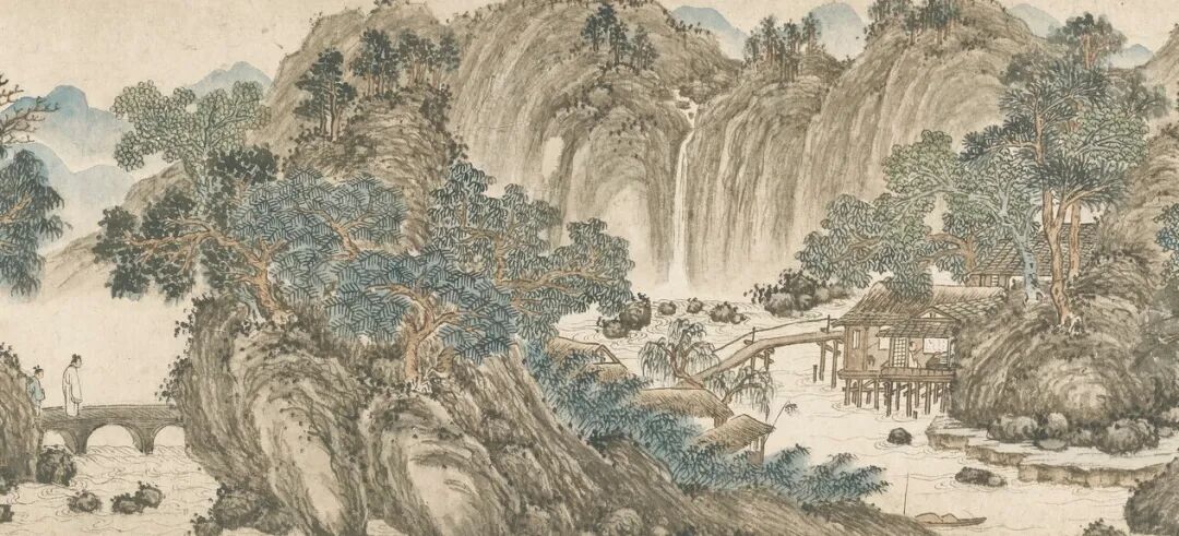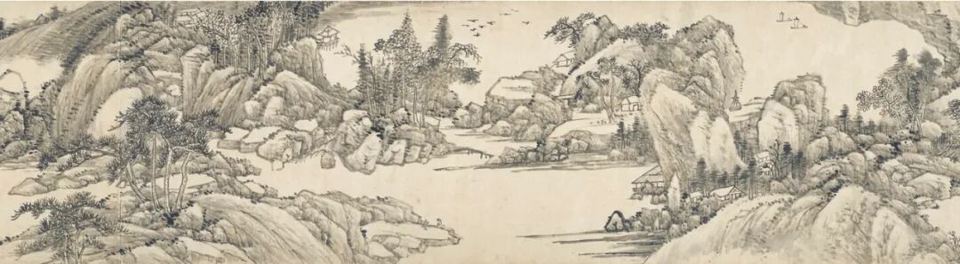 此幅《水北幽居图》绘于1496年,沈周时年七十岁。画卷长三米有余,以一人柱杖步向水边村舍引入,中隔山壑水湾,见山居水榭之状,有板桥、山石、茅舍、竹树为间隔。山势起伏有致,皴笔取法自黄公望,以披麻皴为主。卷末以文人携仆自桥上缓缓走来收结,画有尽而意不穷。