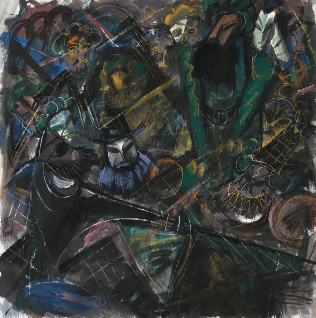 林风眠如何以一帧平面画作,表现《过五关》一剧二十场?他把人物以上下层叠的方式表现,呈现出混沌复杂、战气沸腾的氛围。与其说这是戏中某场某段,不如说这是观戏全场下来所得一种印象。