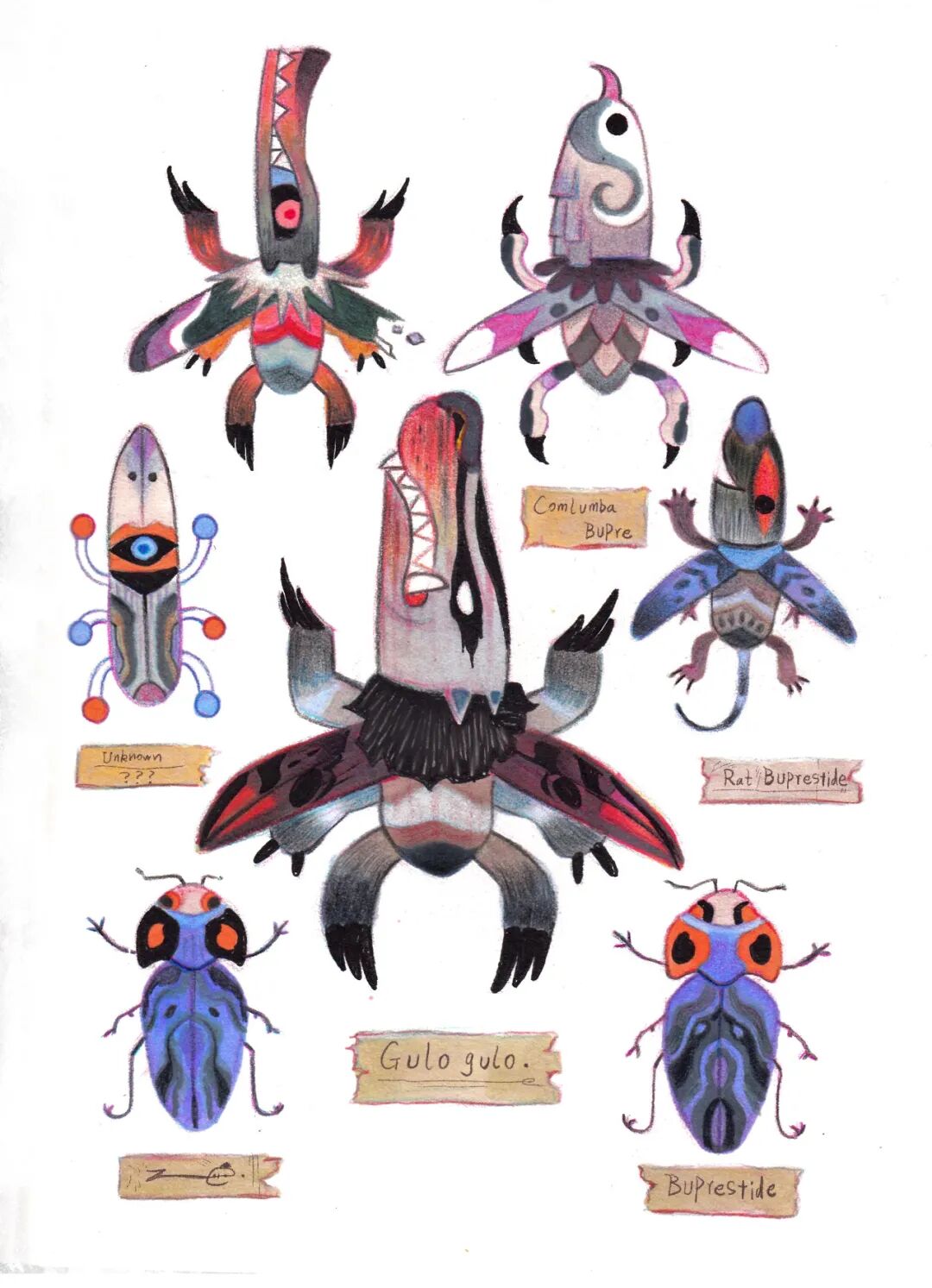 炒肝:我计划要绘制一本昆虫图鉴,但是其中的昆虫都是幻想生物,是我想象的怪异昆虫们,以伪科普的方式编成一本图鉴。另外便是继续去钻研以皮影作为美术风格或以傩戏作为内容的游戏了。我觉得这些题材可以让我们去采风,去了解神秘的文化,做起来真的很有意思。