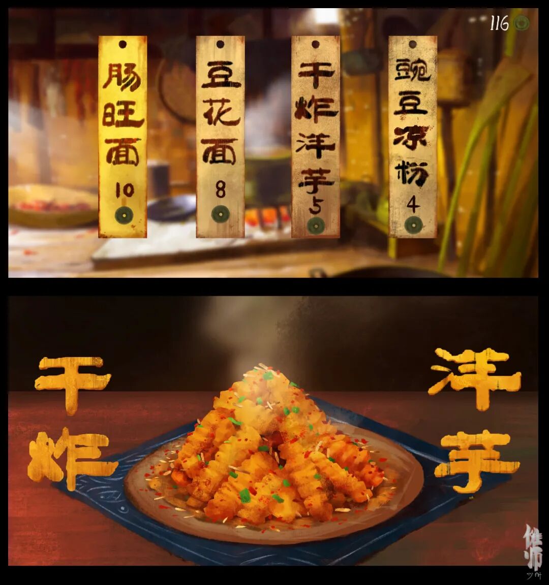 后来我就一路打听,听说有个村子叫周公村,到了村子后什么也没有,是完全没有被开发的原始西南村镇。刚想放弃的时候,随口问了一下村里坐着的阿婆,阿婆说以前每家都雕刻傩面的,甚至介绍了本地一位非遗传承老师傅给我,我一到老师傅家,墙上挂满了傩面具,甚至后院还有作坊在雕刻面具,他本人熟悉每一个面具背后的神话故事,我便拉着他一直聊,聊到天黑才离开,并且强烈给大家推荐贵州的美食,非常独特的菜系,带有着独特的味道。回来后我便决定将西南地区的饮食所为游戏内容的一部分,我太热爱西南地区这片土地了。