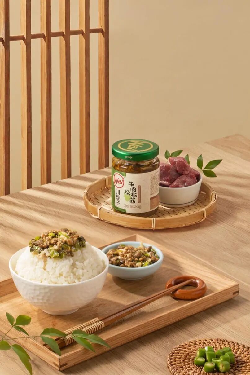 “烧椒酱”选用新鲜碧绿的二荆条椒,以及个头饱满的大蒜,使用地道的配方及制作工艺,辣椒烧出点点虎皮花纹再切碎炒制,整体风味中既有焦香又有椒香,鲜香爽口。作为川娃子的旗舰产品,“烧椒酱”在直播间曾创下3分钟售出50万瓶的记录,广受消费者好评。“任何产品的风味都不可能是完全无中生有的”,唐磊说,“我们的烧椒酱只是通过技术手段把原先四川地区家喻户晓的烧椒风味进行解码。在四川,烧椒茄子、烧椒皮蛋、烧椒牛蛙等等都是大家很熟悉的菜品,但一直都没有哪家企业去把烧椒风味做标准化。我们在做的就是这件事,把来自民间的传统风味做优化创新”。