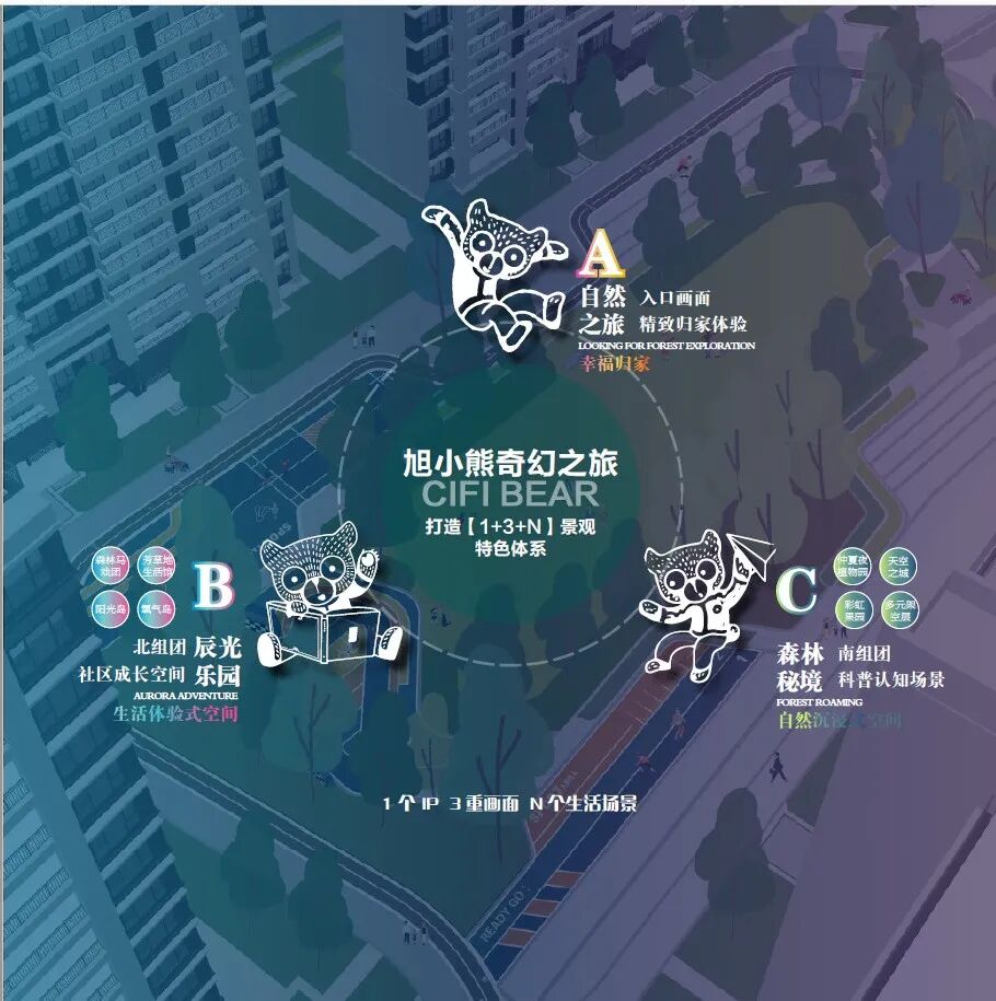 本项目通过构建“1+3+N”景观特色体系,以1个IP构建3重画面,生成N个生活场景,聚焦全龄互动,将快乐成长、全龄关怀与永久陪伴的理念贯彻于都会上品花园的全部空间,以自然、有趣、生活、全周期为目标,营造一个自然、有趣、有人情味的社区,打造一处有着情绪和丰富生活事件的场所。