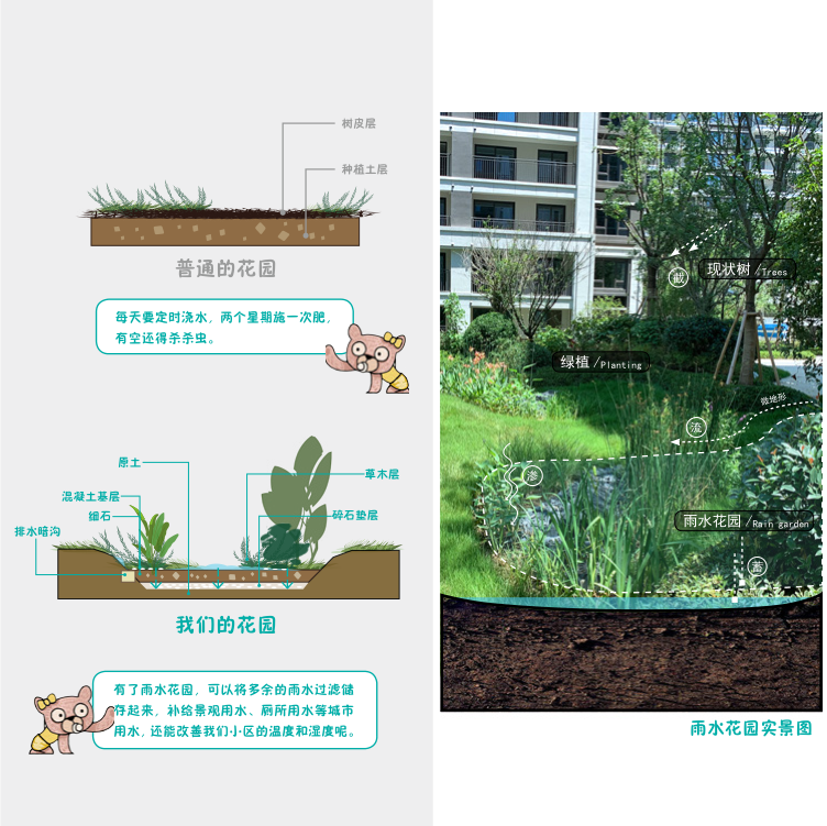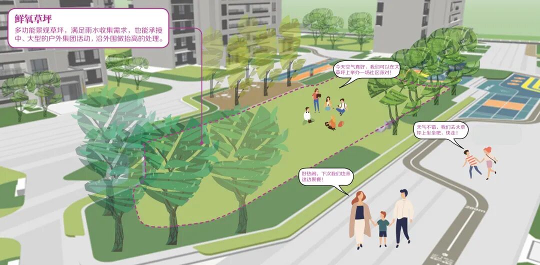 我们利用留白的绿地——打造自然生长的第三游戏场地。在空中漫步道,与自然为邻,与植物为友,与鲜氧草坪的雨水花园景观为伴,拉近生活与自然的距离。