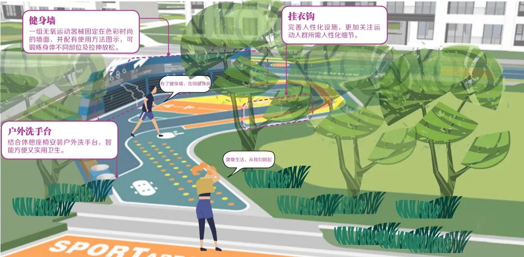 「健身坊」是大人们晴雨天都可以选择的好去处,也是儿童玩耍嬉戏的游戏场地。在不被定义的空间,有全龄人群的聚集、有有趣的分享、有生活的模样。“健身”作为一张社交名片,踏出这一步,就能感受到身边的温度。