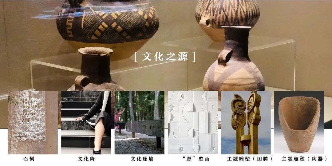 基于本案案名“中海-源境”,结合基地所处的周边新乐遗址与北陵公园,挖掘新乐遗址文化之源,从中提取出“碑刻、文化阶、文化座墙、源壁画、主题图腾雕塑、主题陶器雕塑”等文化元素,作为文化载体融入场地设计之中。