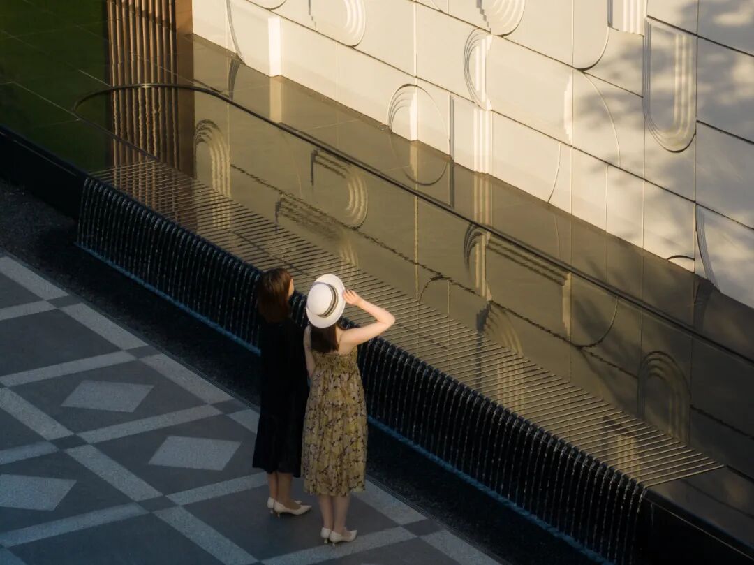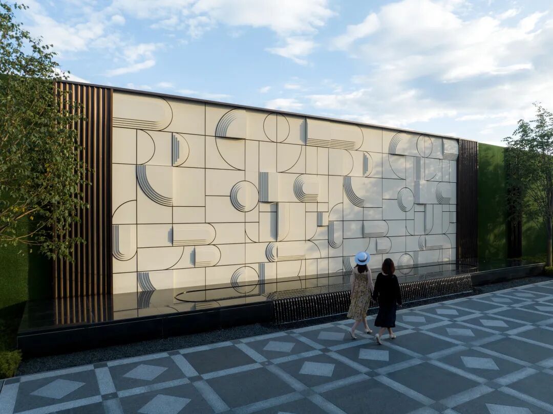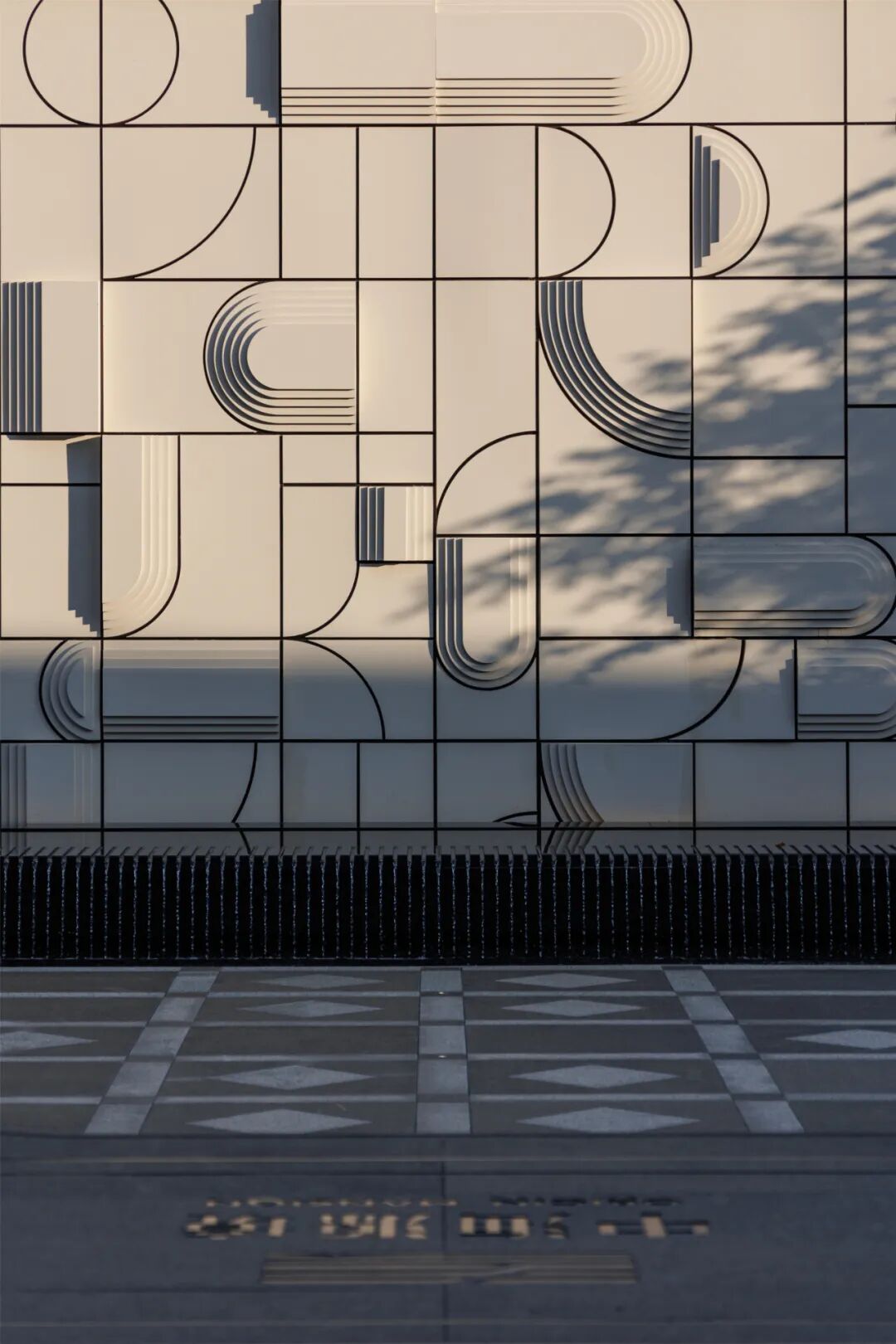 结合下方景观水景案台,通过跌水的动态连接,将源景墙上的遗址图腾与城市书屋售楼处前广场地面的特色铺装做一个文化衍生,仿佛是一幅古与今对话延续,来迎合古建筑的复古感。地面的菱形同时也是历史古建筑窗格上的纹样,菱形纹状还是原始选民捕鱼等网状,而网乃进财的象征,在中国的传统吉祥图案中,属于文人八宝之一,通常含有超越、丰收、进财等美好寓意。