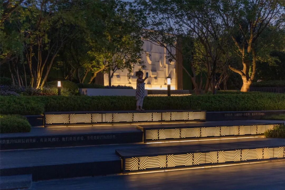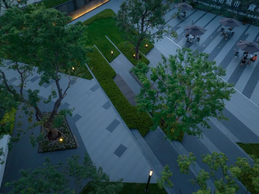 文化阶林下剧场,利用场地本身高差关系,于营销参观动线中设计林下阶梯式休憩空间,参观者也可于此处停留,背靠林荫,面朝城市广场。