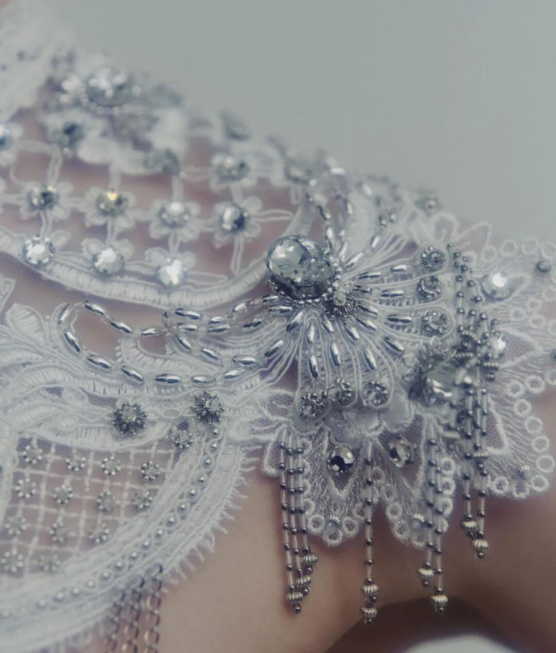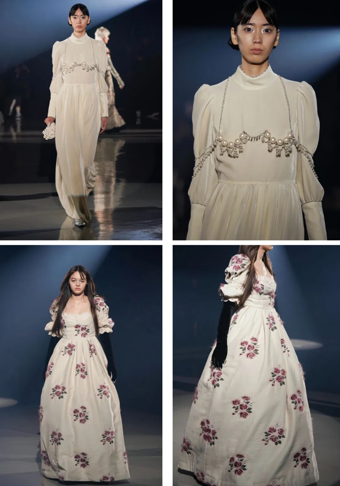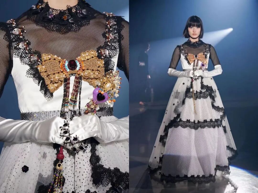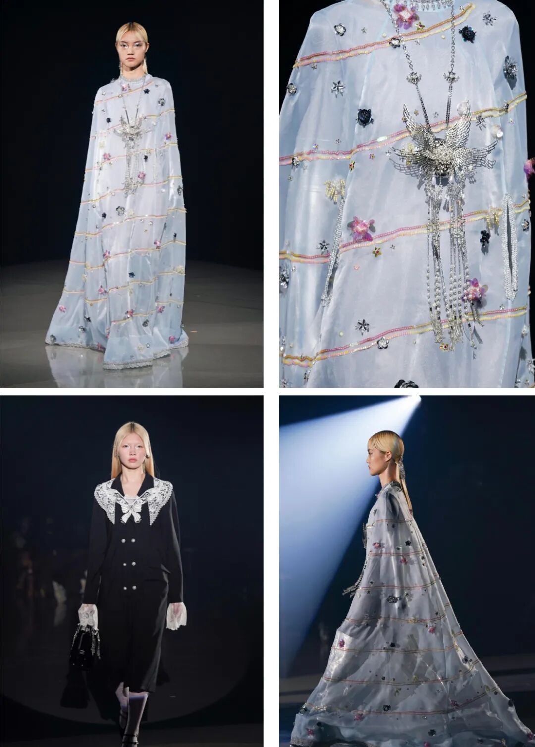 从链条水晶连衣裙,水晶珠宝白领、珐琅彩宝石裙子、黑色蕾丝白色吊带裙等材质出发,开发出浪漫而梦幻的系列。