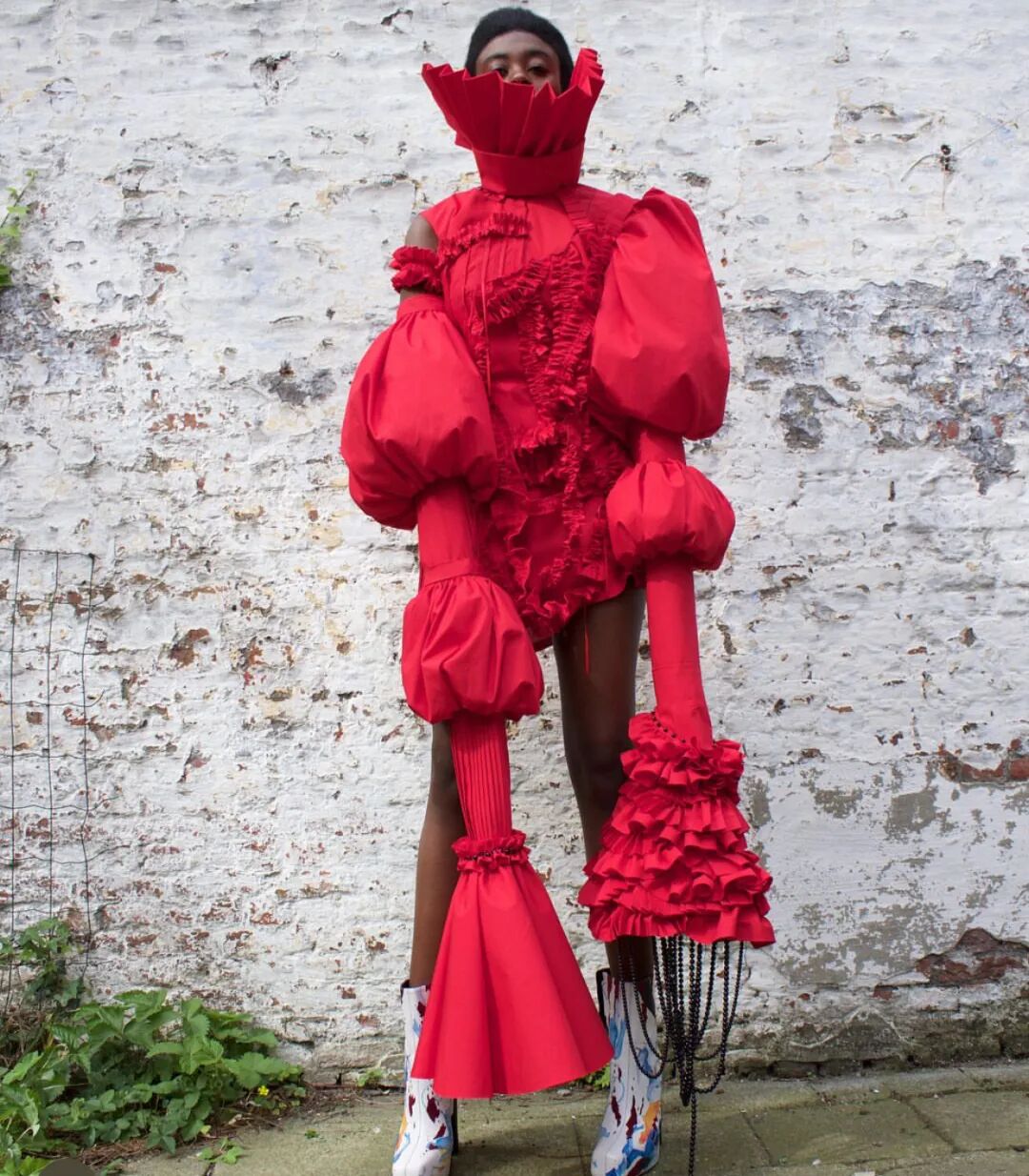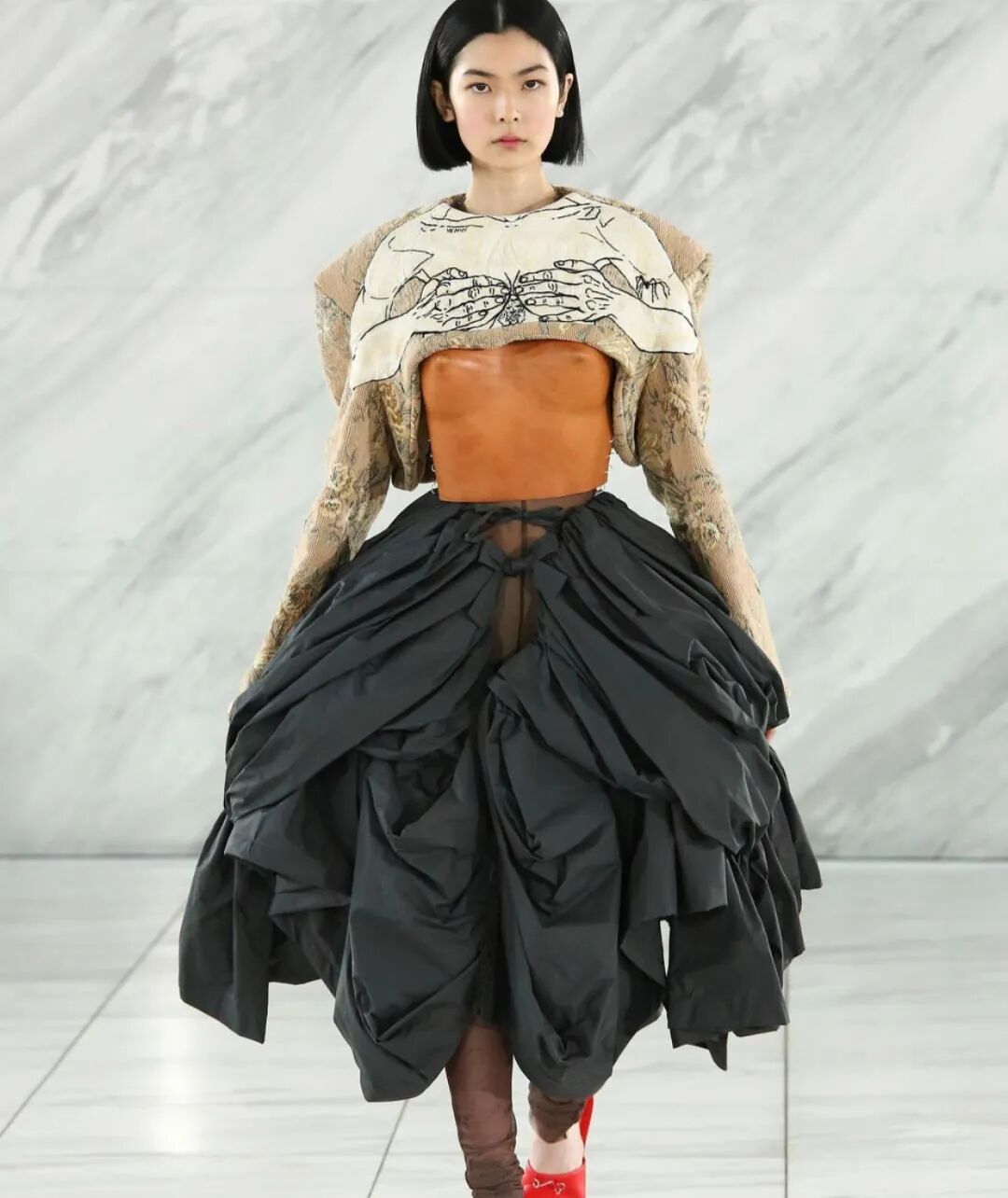 Bramley的服装廓形和面料令人耳目一新,可以用衰败状态去形容她的设计作品,同时她也倡导回收利用可持续发展,通过生物塑料、生态织物、天然染色,去升级回收面料,从而探索了面料的新的使用手法。