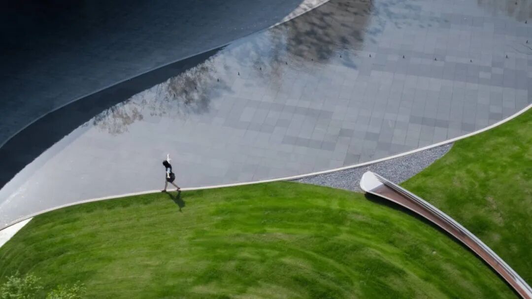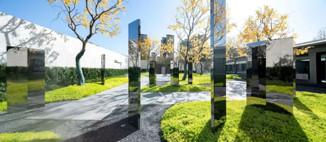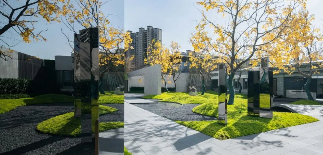 自然生长的绿岛,婆娑的乌桕林,镜面的不锈钢,自然的肆意生机和人工的精工细造形成强烈的对比。