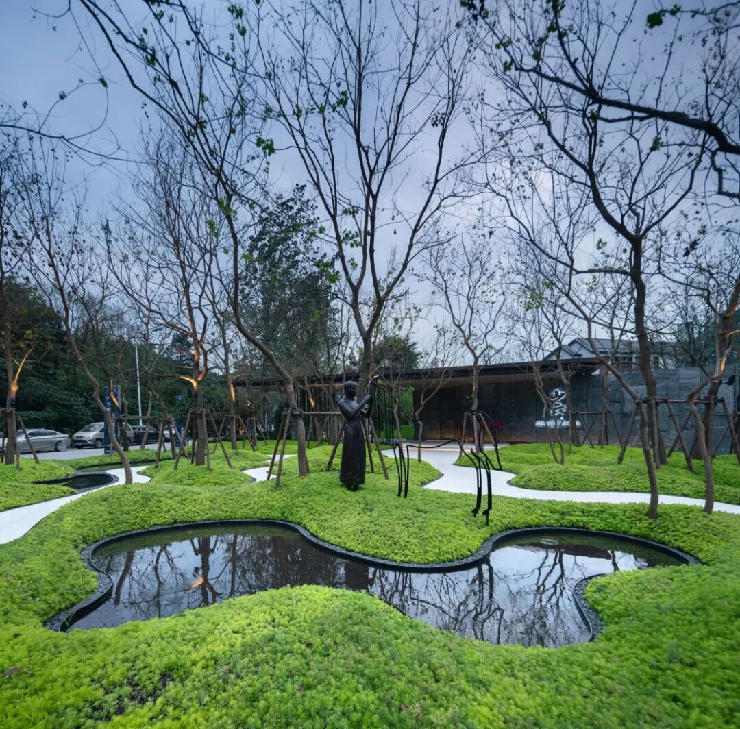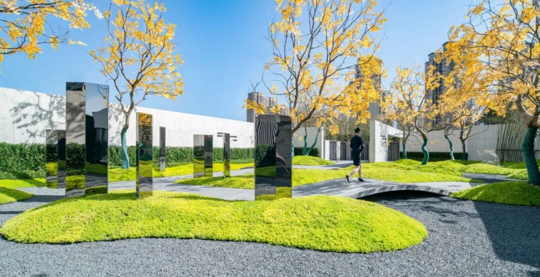 三重•体验,以林深见鹿为空间主题,多姿的树木、起伏的微地形与黑色的砾石组成后场的林院,在起伏的庭院中铺设小路,架起小桥,设置休憩空间,闲来静处、逢时遇景,邀请前来的人们一起体验浪漫的,充满生活气息的姑苏画卷。