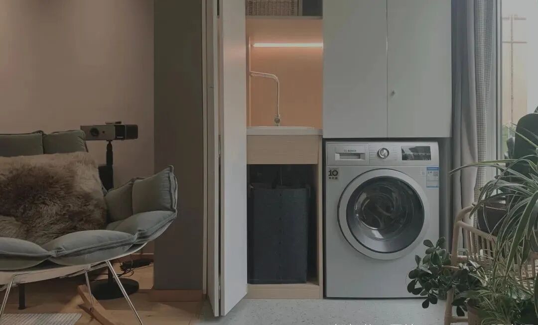 工具墙的对面就是洗衣区,一整组柜体将洗衣机、洗手池、脏衣篮、清洗及晾晒工具全部收纳于此,洗完还能直接在这里晾晒,一个阳台把所有功能一次性解决。